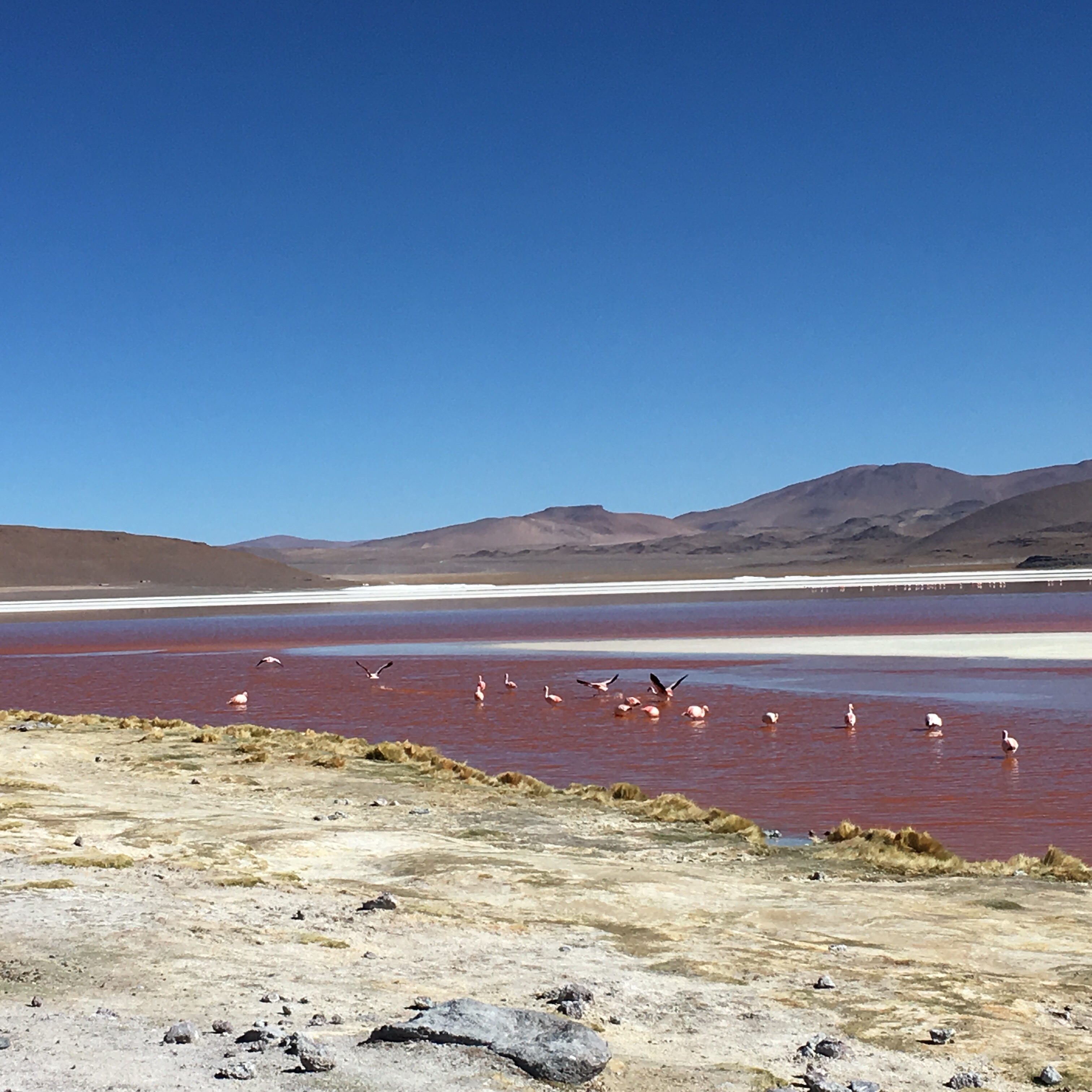 Continuamos a la Laguna Colorada: Con una superficie de 60 km2 y a una altitud de 4.278msnm, la Laguna Colorada se caracteriza por la coloración rojiza de sus aguas debido al pigmento de unas algas microscópicas. La laguna es el principal lugar de nidificación de flamencos andinos: flamencos tokoko, de plumaje rojizo; chururu, de plumaje blanco y jututu, de plumaje rosado; también se pueden observar vicuñas, llamas y vizcachas. Despues de un día agotador (la altura se nota) llegamos al hotel de sal Luna Salada. Que sólo se puede calificar de increíble. increíble las habitaciones de sal, increíble la amabilidad del personal, increíble el desayuno y la cena, increíble la tranquilidad que se respira. Increíble estar a las puertas del salar.
