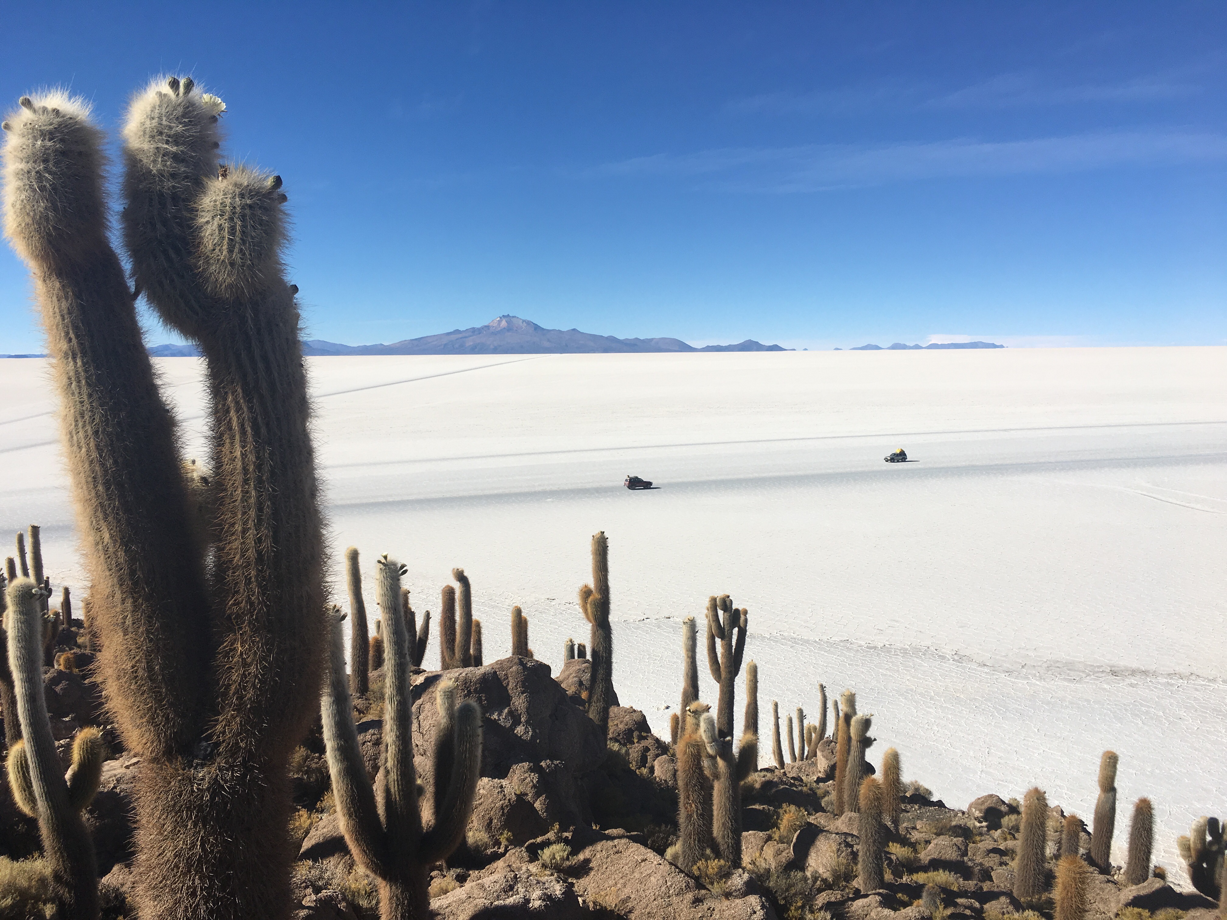 Salar de Uyuni: El salar de Uyuni es una experiencia inolvidable. Hicimos la excursión de un día por el Salar en jeep 4×4. (Hay excursiones de 1-2-3 días del salar+lagunas+desierto que puedes contratar en el mismo pueblo de uyuni o llevar contratada de antemano). Importante no olvidar: gafas de sol y protección de +50 o te abrasarás sin darte cuenta ya que no hace frío al sol. Este es el salar más grande de la Tierra, con una superficie de 12.000 Km2; el silencio, los surrealistas pentágonos de sal y la falta de perspectiva, te dejan sin palabras y te hace estar buscando la foto más rara y más curiosa durante un buen rato: haces el pino, saltas, te tumbas, te alejas…Y te da igual porque estarás solo, cada día salen tours y excursiones pero estas literalmente SOLO (Eso si, si buscas la foto del espejo, sólo la podrás realizar en época de lluvia a principios de año, o si ha llovido el día antes ya que se queda una capa de agua sobre la sal que hace el efecto). Únicamente encontrarás más turistas en la llamada isla «Incawasi», un oasis en medio del salar cubierto por miles de cactus gigantes, algunos con más de cien años, creciendo a una altura de más de 12 metros. Hay que subir hasta arriba, cuesta un poco por la altura pero la vista lo merece. En la parte de abajo de la isla tienes alguna tienda y unos baños muy concurridos (y bastante sucios. ¿Recuerdas el papel higiénico de antes?). El paisaje del Salar de Uyuni se pierde en el horizonte, la vista desde el Volcán Thunupa te deja boquiabierto. Hay excursiones que incluyen el amanecer y el atardecer, merece la pena, paisaje increíble. La noche la pasamos en hotel Jardines de Uyuni: es un hotel con encanto, habitaciones pequeñas pero con camas de 1,35 y muy confortables, desayuno muy bueno. Antes de dormir: unas cervezas en el «Extreme Fun Pub» local curioso para mochileros y guías donde comentar el día. Recuerda antes de salir de Uyuni parar en La Oficina de correos para mandar unas postales, tardarán casi un mes en llegar pero es un buen recuerdo.