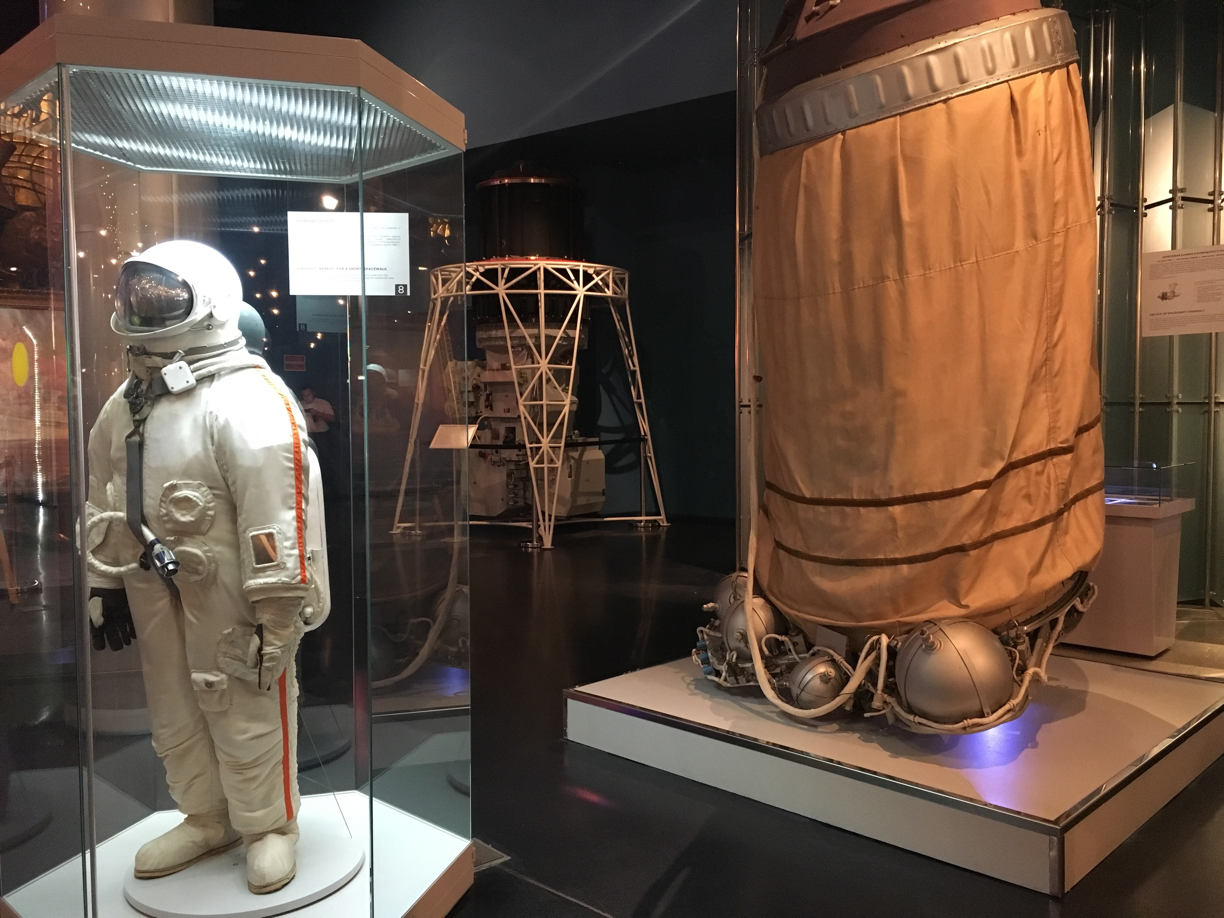 4. Pasar un rato curioso en el Museo de la cosmonautica. No es que sea visita obligada, pero es un sitio interesante y en metro estás en 15 minutos de la plaza roja, así que se puede encontrar un momento. Se encuentra en el recinto ferial ruso (la antigua Exposición de los logros de la economía nacional de la URSS inaugurado en 1959). Localizarás el lugar porque hay un monumento en la plaza bajo la que se encuentra el museo, «monumento a los conquistadores del espacio» un obelisco de acero rematado con un cohete, revestido de titanio de 100m cuya inauguración coincide con el sétimo aniversario del lanzamiento del Sputnik 1. El museo tiene modelos a escala original de varios satelites, vehículos y estaciones espaciales y algunas piezas originales, trajes espaciales, kits de supervivencia, equipación de ensayos y pruebas médicas que se realizan en las estaciones espaciales. La parada de metro es VDNH de la línea 6, naranja.