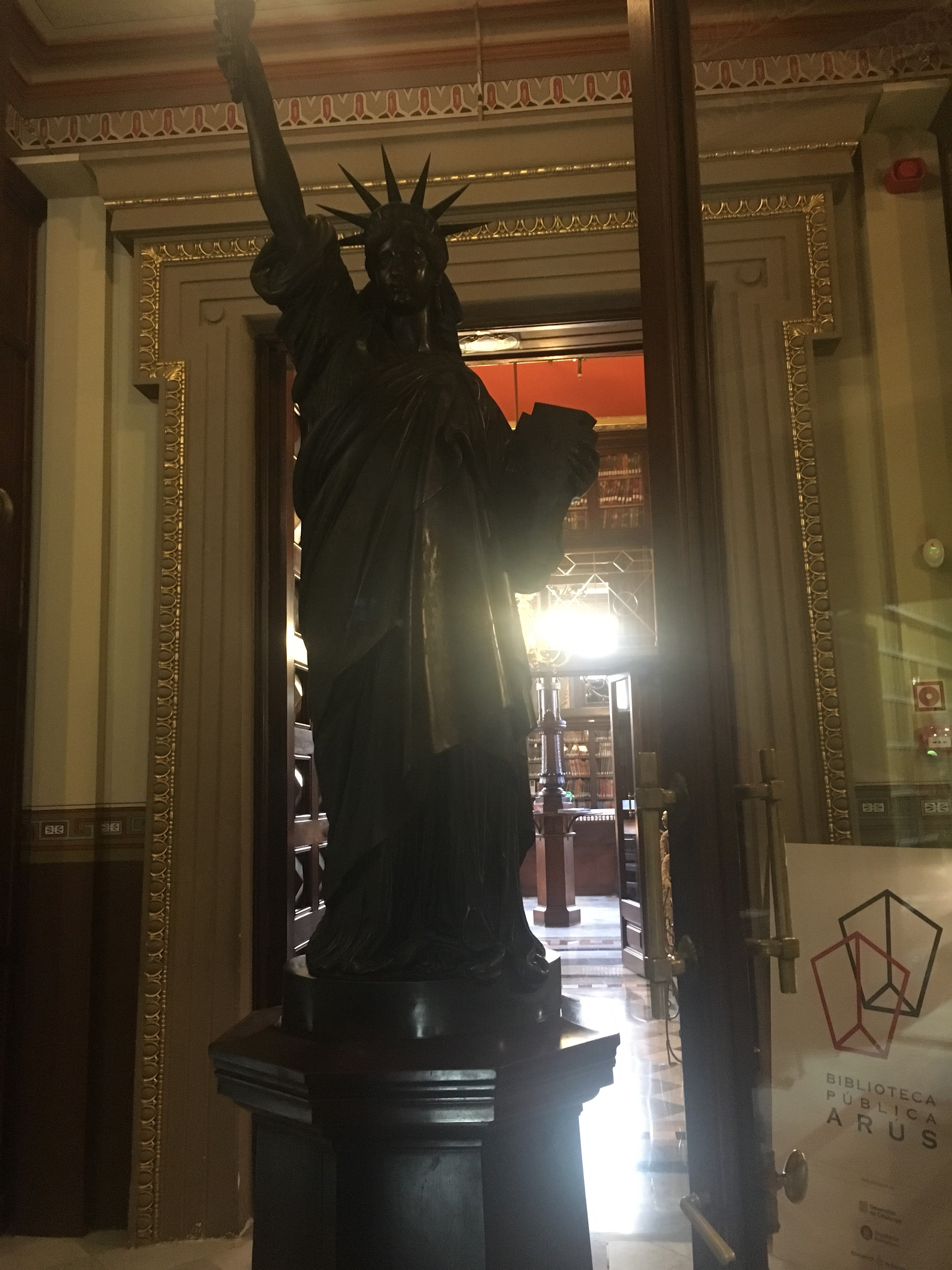 En lo alto de la escalera principal justo al pasar la puerta te da la bienvenida una Estatua de la Libertad de unos 2m de altura. A finales del s. XIX se esculpieron tres únicas estátuas de la Libertad y ésta es una de ellas (1894). Esta estatua fue encargada al escultor modernista Manel Fuxà, y es una de las obras de arte de mayor valor histórico y patrimonial de la Ciudad Condal.