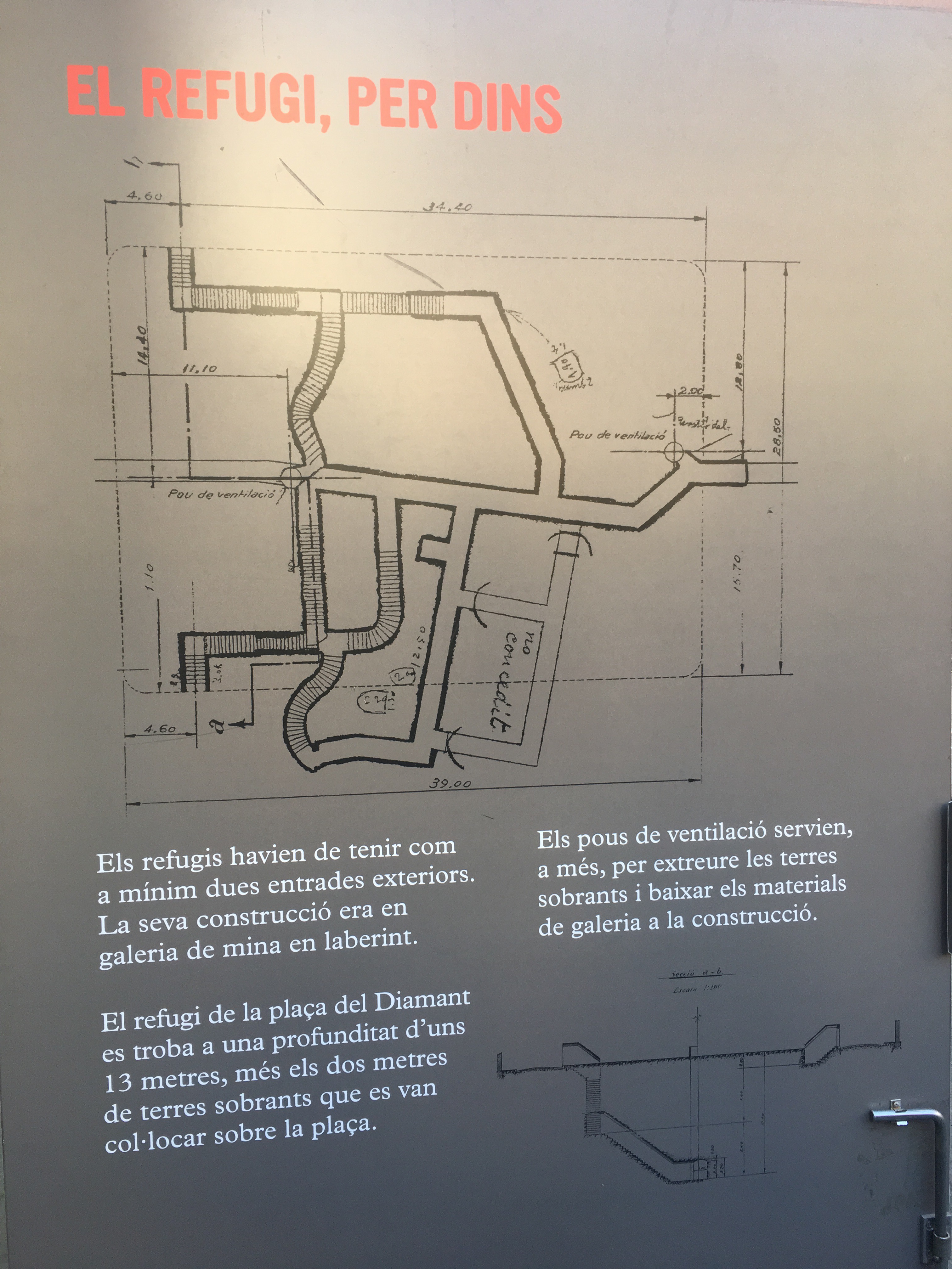 Construido a doce metros bajo tierra por los vecinos del barrio durante la Guerra Civil, podía dar refugio a más de doscientas personas durante los numerosos ataques que sufrió la Gràcia industrial de la época, llena de fábricas que eran el objetivo principal de la aviación atacante.