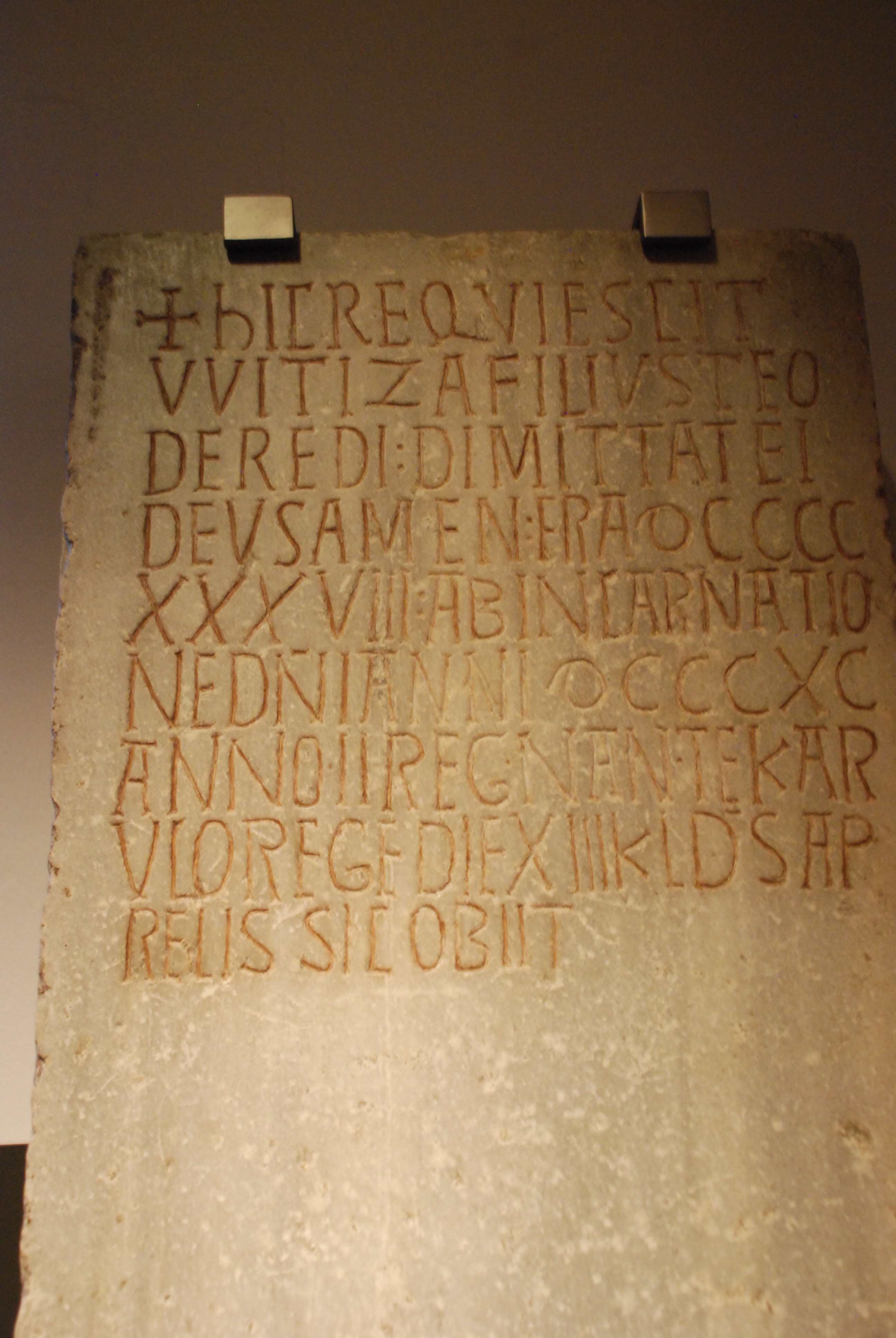 “Aquí reposa Witiza hijo de Teodoredo. Dios le perdone. En el año 938 de la Era. En el 890 de la Encarnación del Señor. De este modo murió en el día 13 de las calendas de abril del segundo año del reinado de Carlos.”