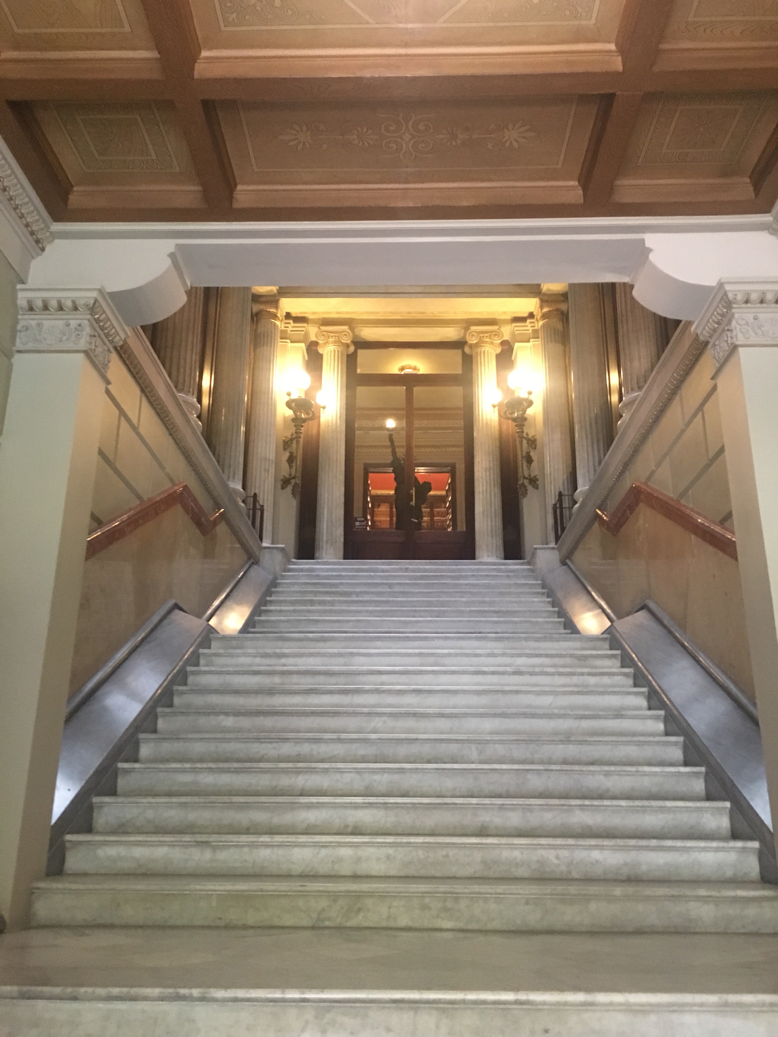En lo alto de la escalera principal justo al pasar la puerta te da la bienvenida una Estatua de la Libertad de unos 2m de altura. A finales del s. XIX se esculpieron tres únicas estátuas de la Libertad y ésta es una de ellas (1894). Esta estatua fue encargada al escultor modernista Manel Fuxà, y es una de las obras de arte de mayor valor histórico y patrimonial de la Ciudad Condal.