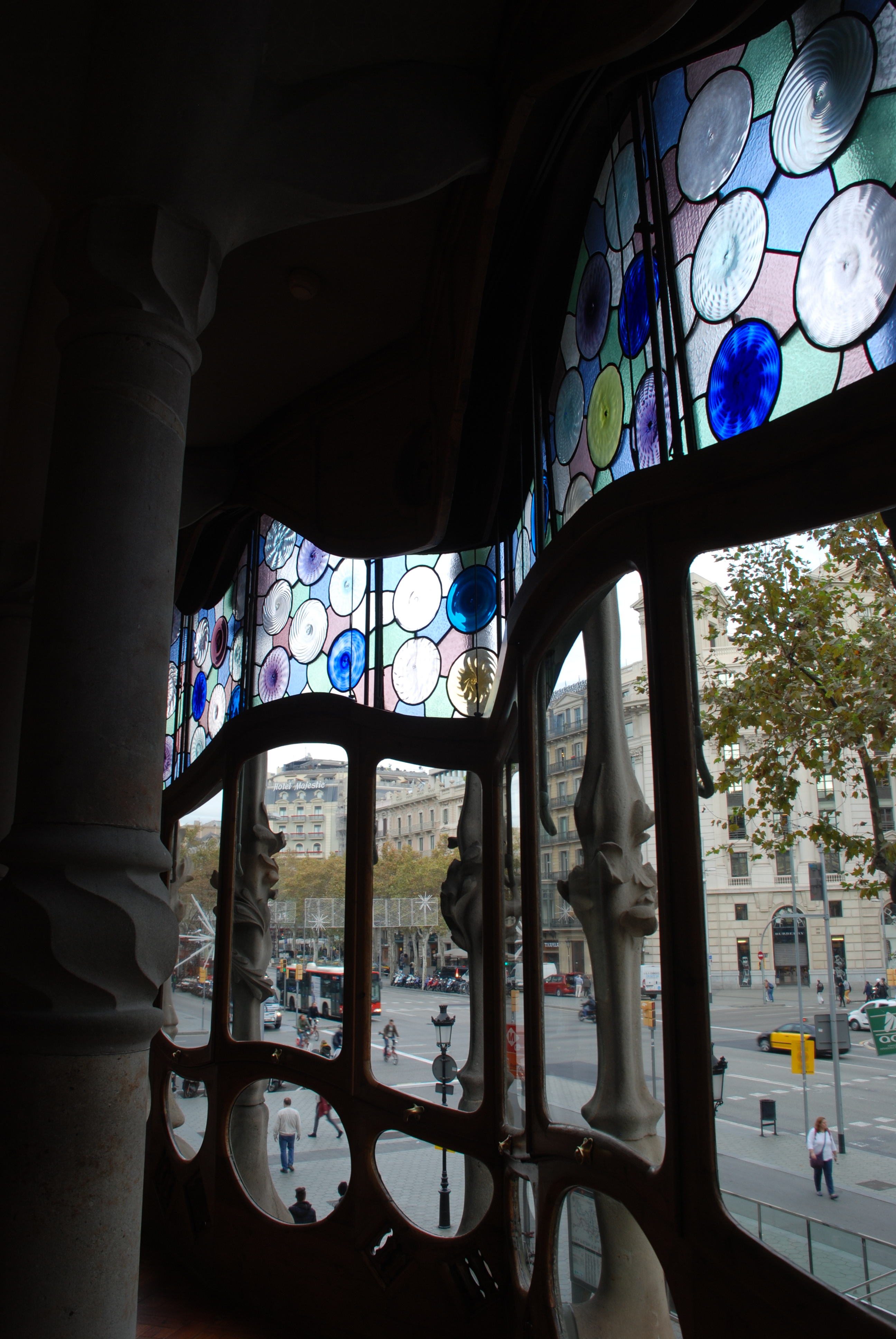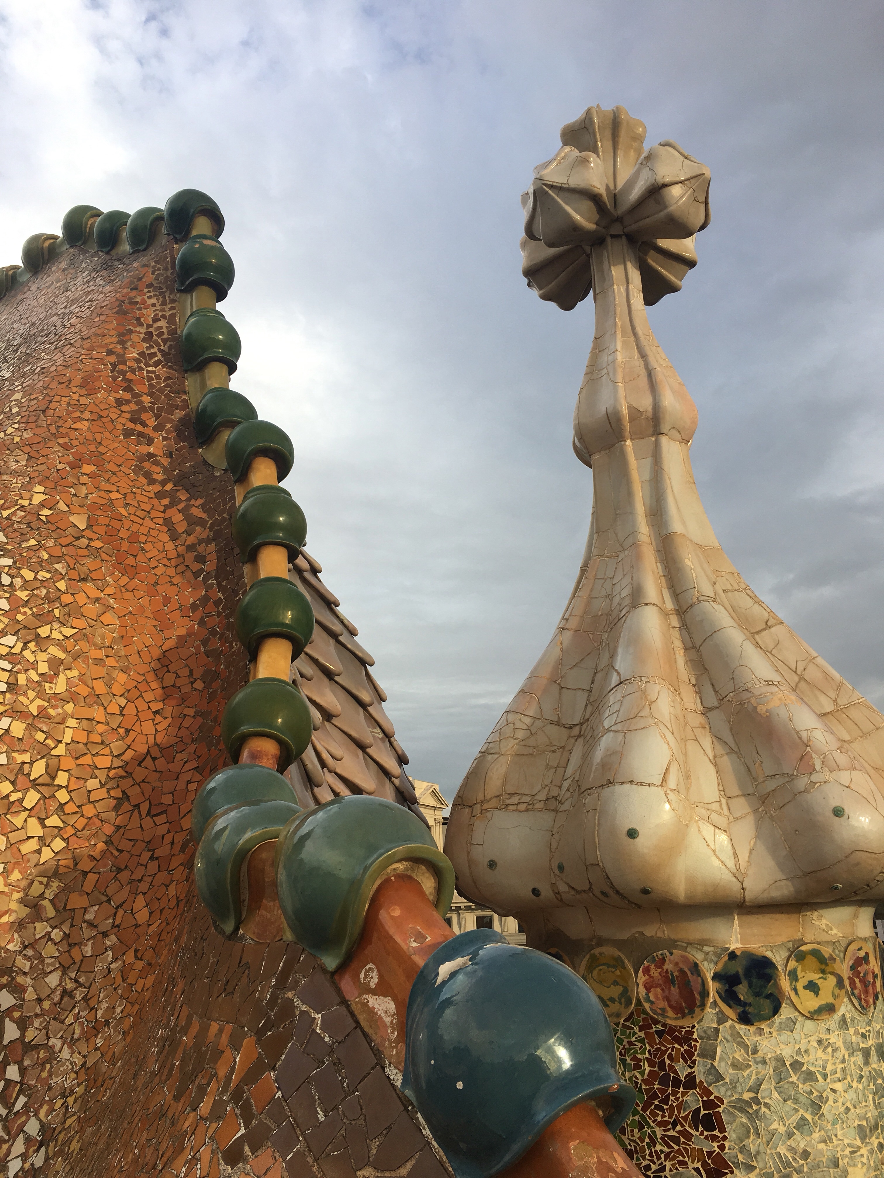 Fíjate en los balcones con forma de calavera ¿o máscara de carnaval?, el tejado ondulado es el dragón abatido por San Jordi, las tejas sus escamas de colores, fíjate en los más de 300 discos cerámicos en la fachada.