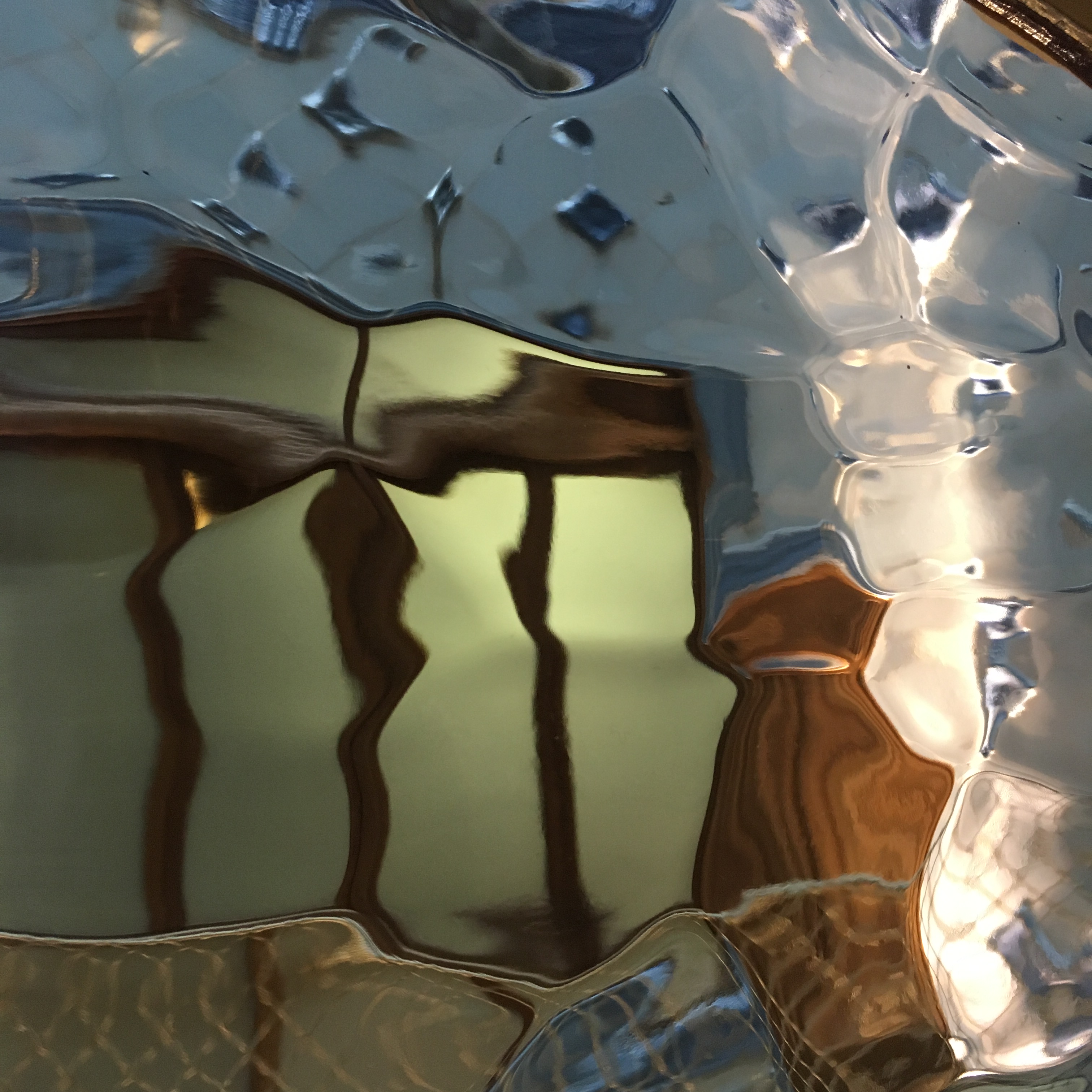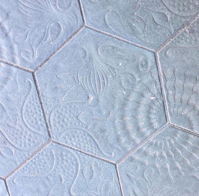 La baldosa es famosa, un diseño de Gaudí, tan famosa que está en el MoMA. El dibujo lo conforma cada grupo de 7. La baldosa Gaudí fue proyectada en 1904 y fue utilizada en la Pedrera. Si te fijas podrás ver una estrella de mar, un amonites y un alga del género Sargassum.