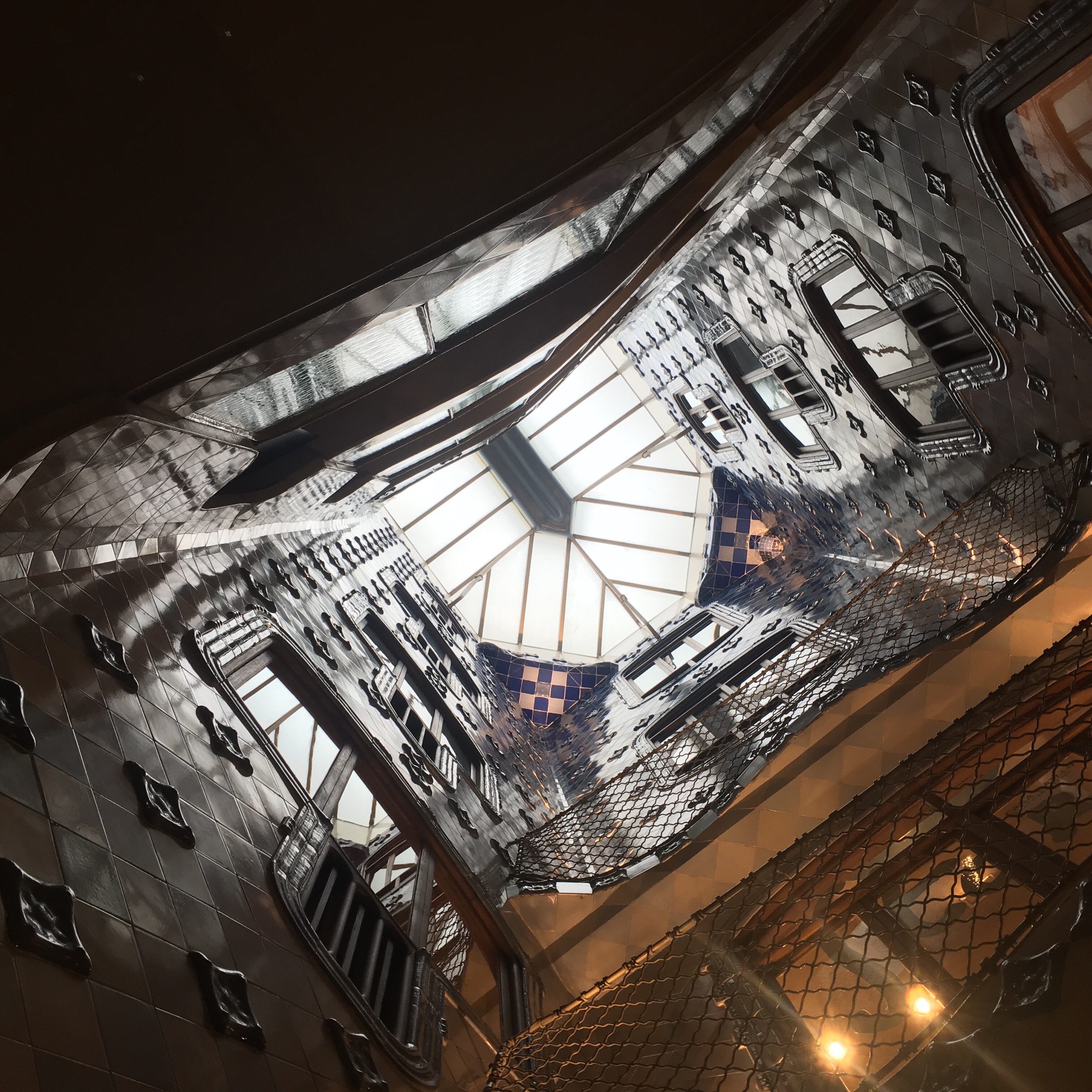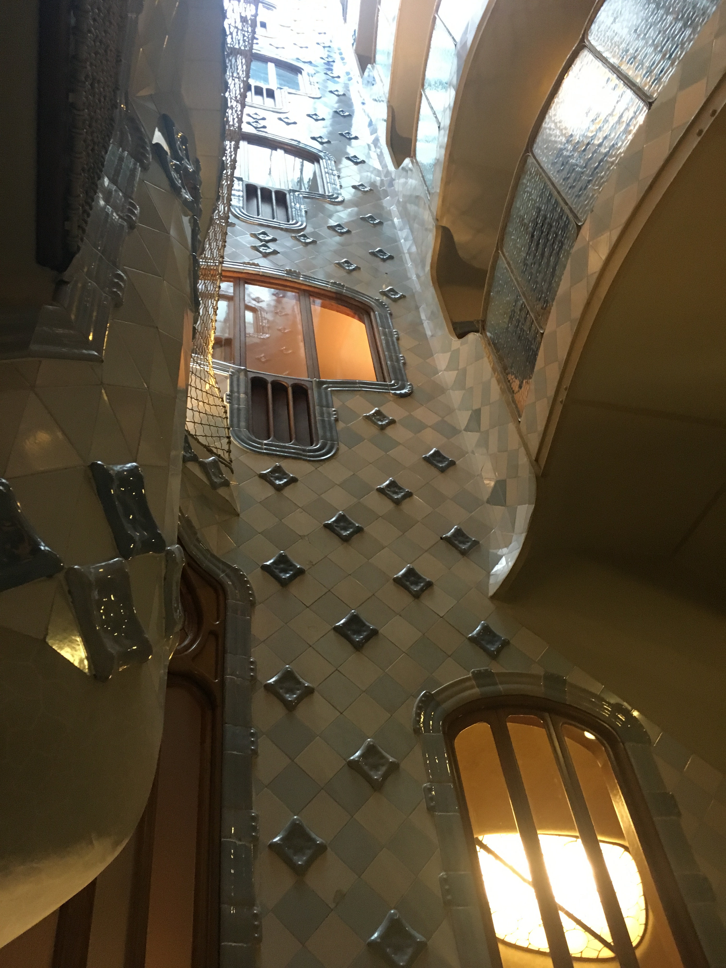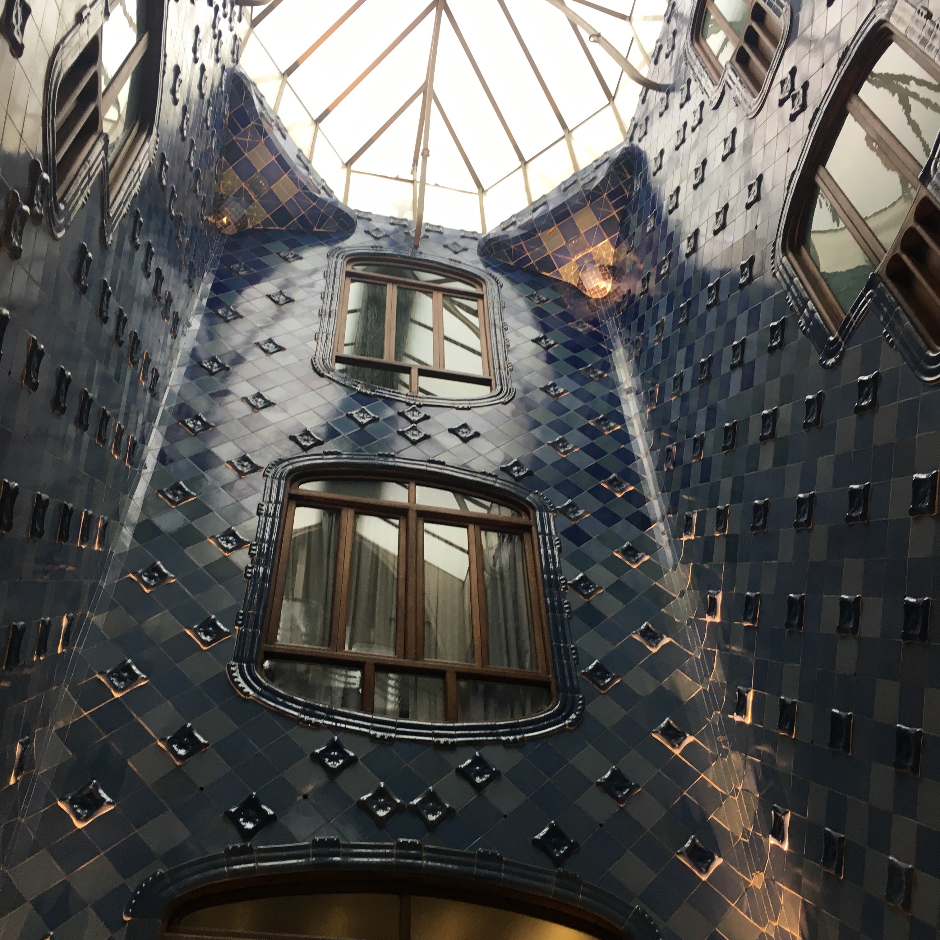 Al entrar encontrarás el vestíbulo, el patio de luces (la antigua escalera de vecinos), de cinco tonos de azul diferentes y la escalinata principal que te llevará a la planta noble (la antigua residencia de la familia Batlló), y al desván (los antiguos trasteros y lavaderos). La estructura totalmente blanca del desván recuerda el costillar del dragón. También podrás acceder a la azotea con las míticas chimeneas de Gaudí.