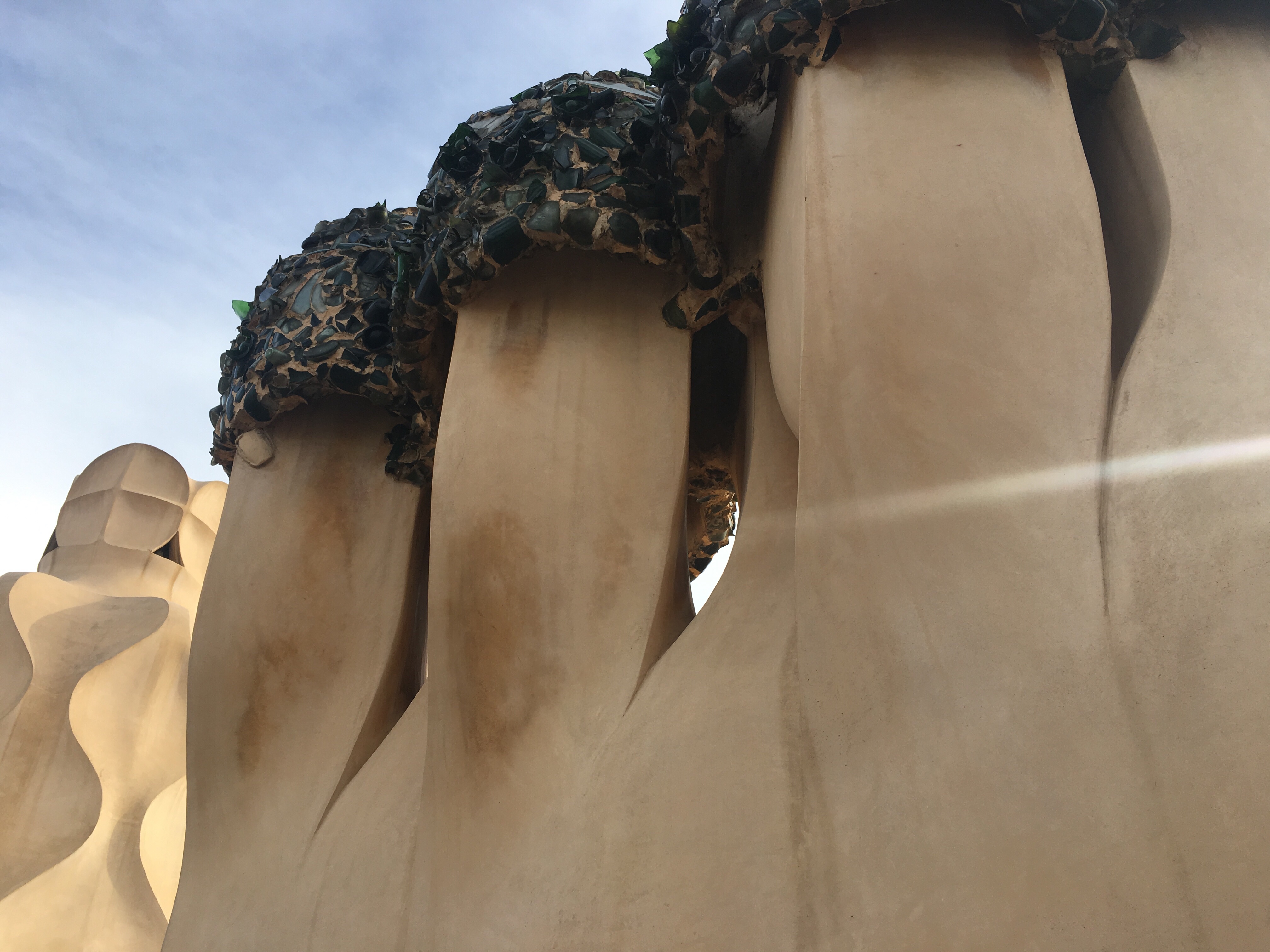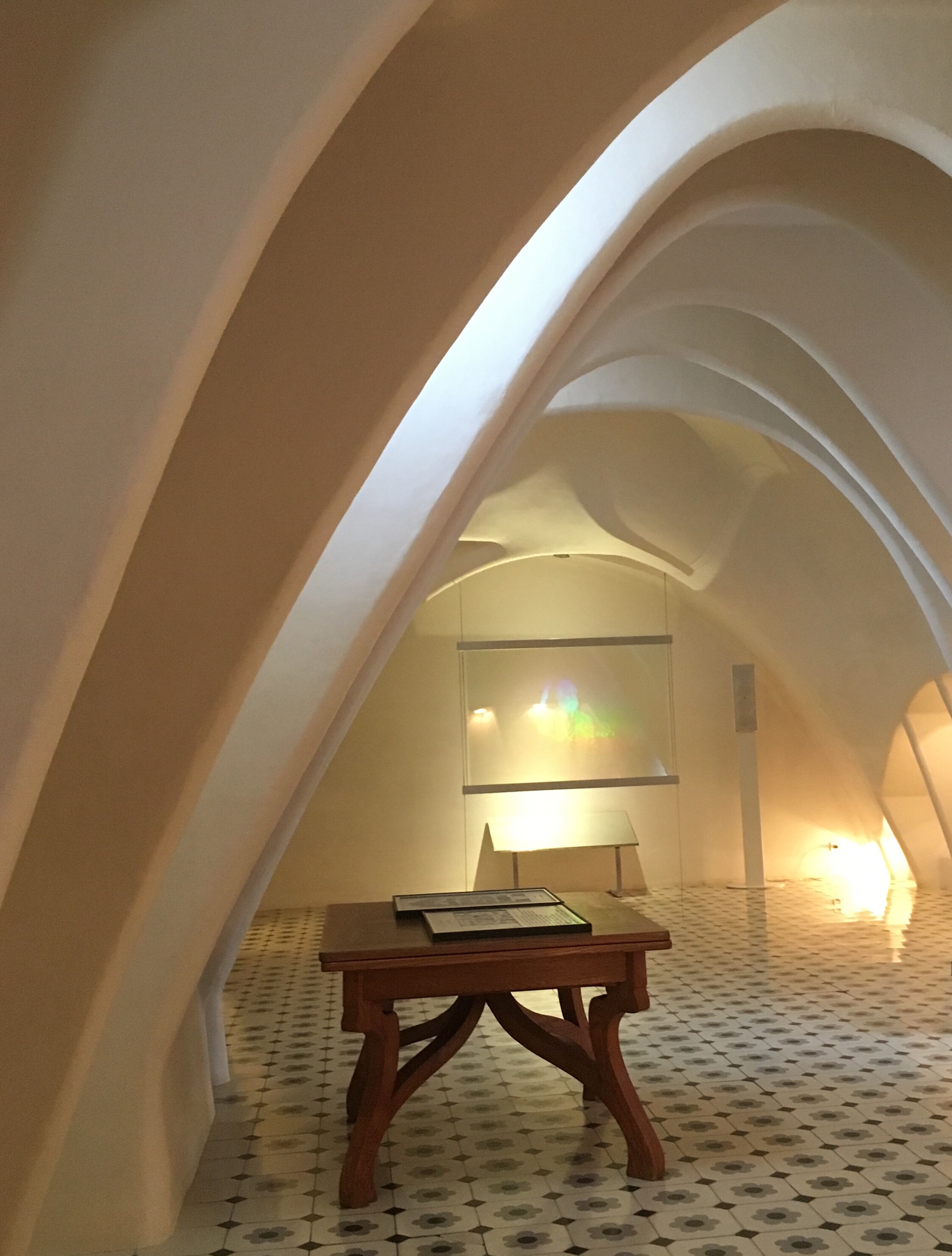 Los desvanes que proyecta Gaudí son alucinantes, el de la Pedrera tiene 80 ventanas y una sucesión de arcos catenarios similar a la que encuentras en la Casa Batlló. Los arcos catenarios se encuentras dispuestos a diferentes alturas lo que hace que se formen los desniveles de la azotea.