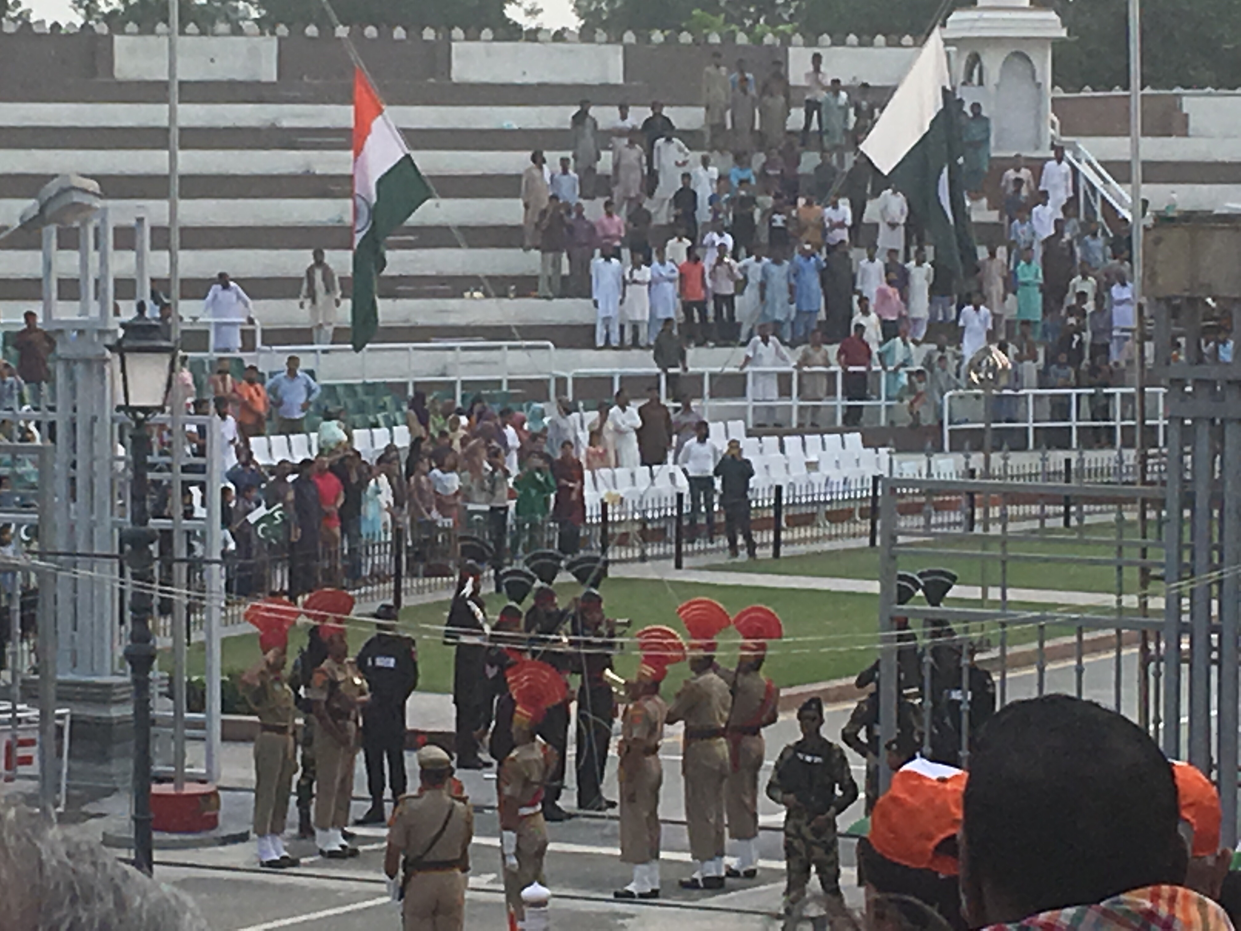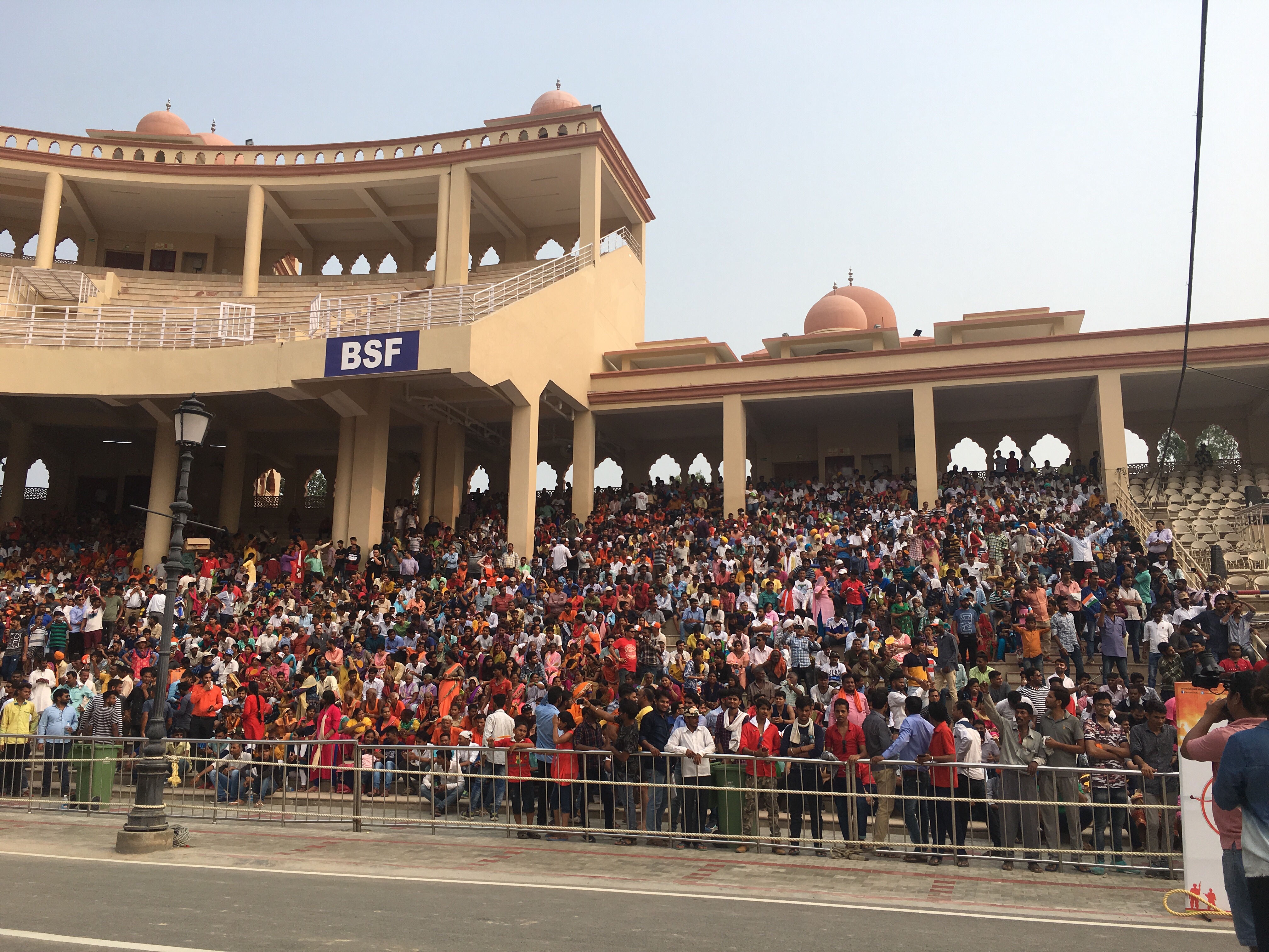 Otra de las visitas en la zona es la de la frontera con Pakistan para presenciar la ceremonia de la bandera (Wagah Border) que se realiza todos los días al atardecer. La verdad es que creo que no merece la pena. Primero porque pierdes 3 horas entre ir, pasar los controles de seguridad, el paseo hasta la frontera y estar allí casi más de una hora y volver. Y la verdad es que al final cansa, sobre todo porque estás casi dos horas sentado al sol y tampoco es tan increíble. Lo puedes ver por YouTube. Es una especie de «tigres, tigres, leones, leones» de Torre-Bruno donde del lado de India está lleno de indios gritones, colores y banderitas y del lado Pakistaní más tranquilos unas decenas de personas, mujeres y hombres separados, con vestimentas color pastel, lo que supone un interesante contraste entre los dos países. El desfile parece más una demostración ritual de fuerza por parte de unos y otros, como unos cuantos pavo reales enseñando las plumas al contrincante. Las plumas de los gorros, así como la flexibilidad de algunos para levantar la pierna hasta tocar la frente con la rodilla, diferentes a lo que hayas visto en cambios de guardia o similares, por lo demás un poco show para los turistas (mismos Indios, que se vienen muy arriba cuando se trata de demostrar algo ante Pakistán)