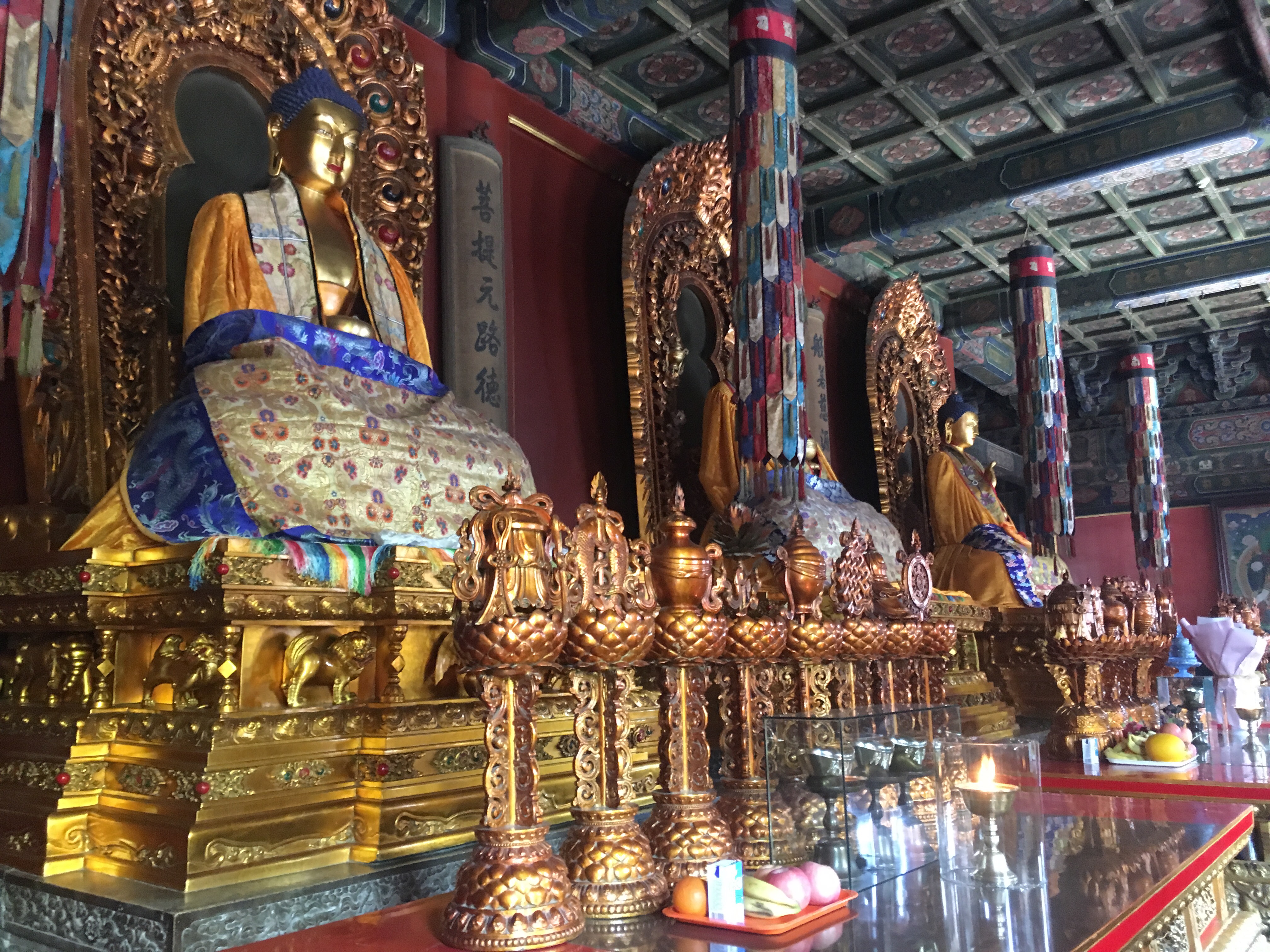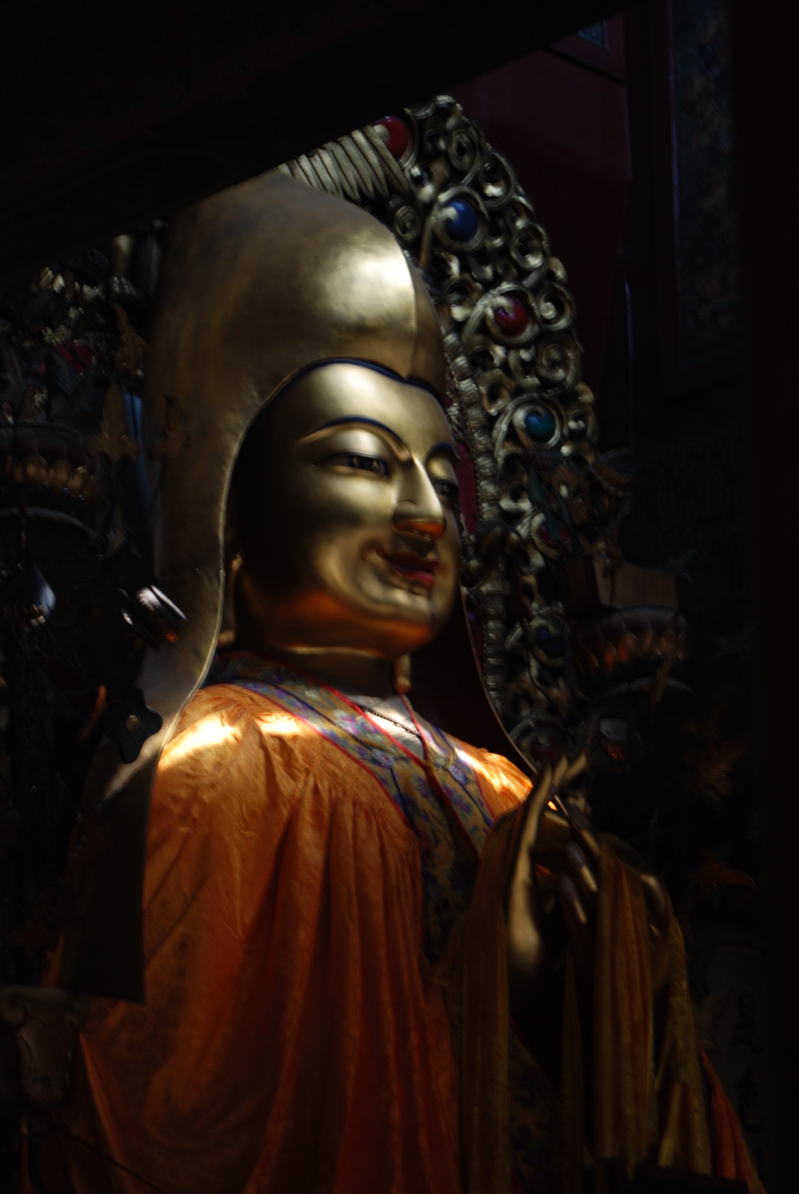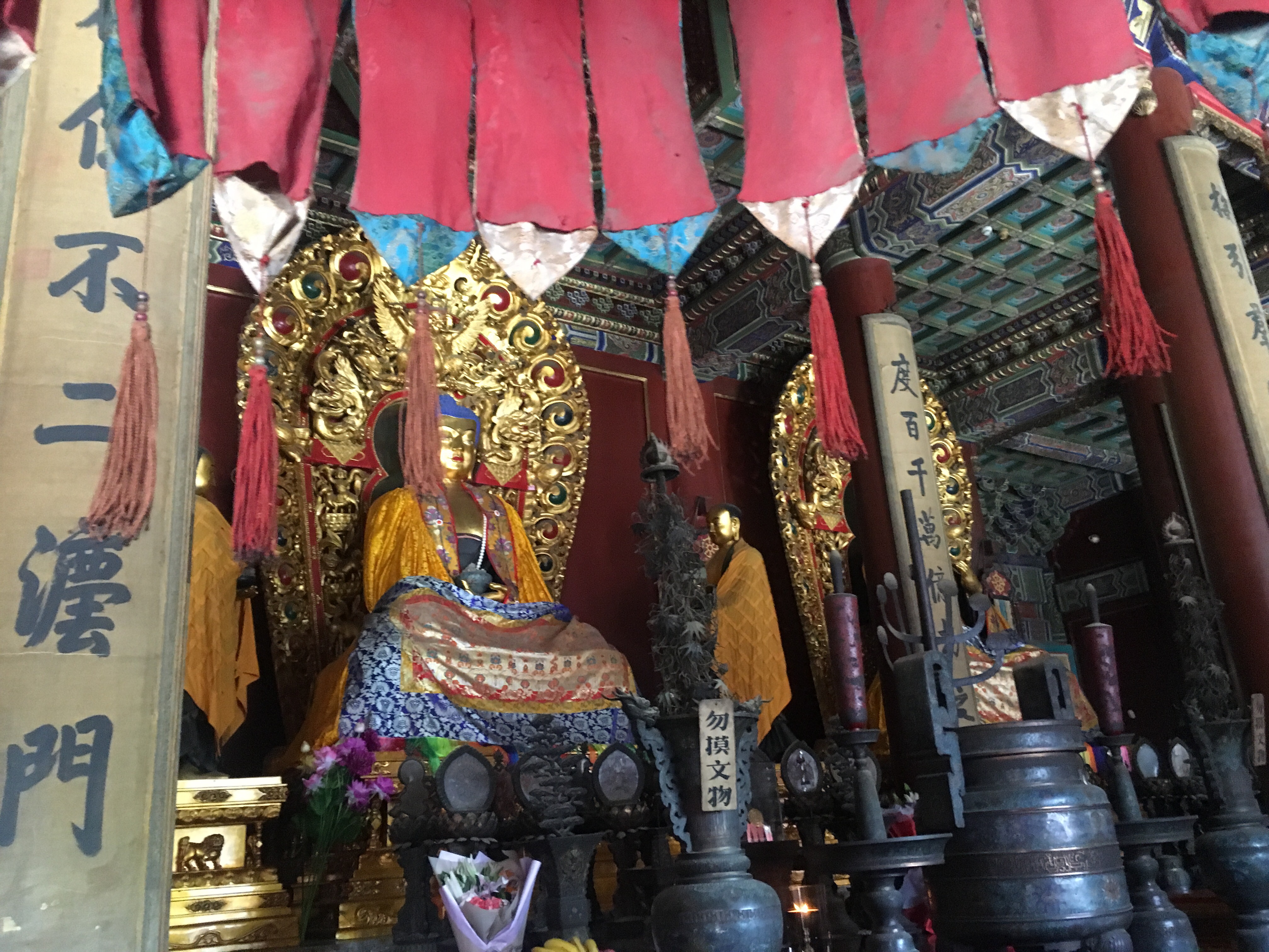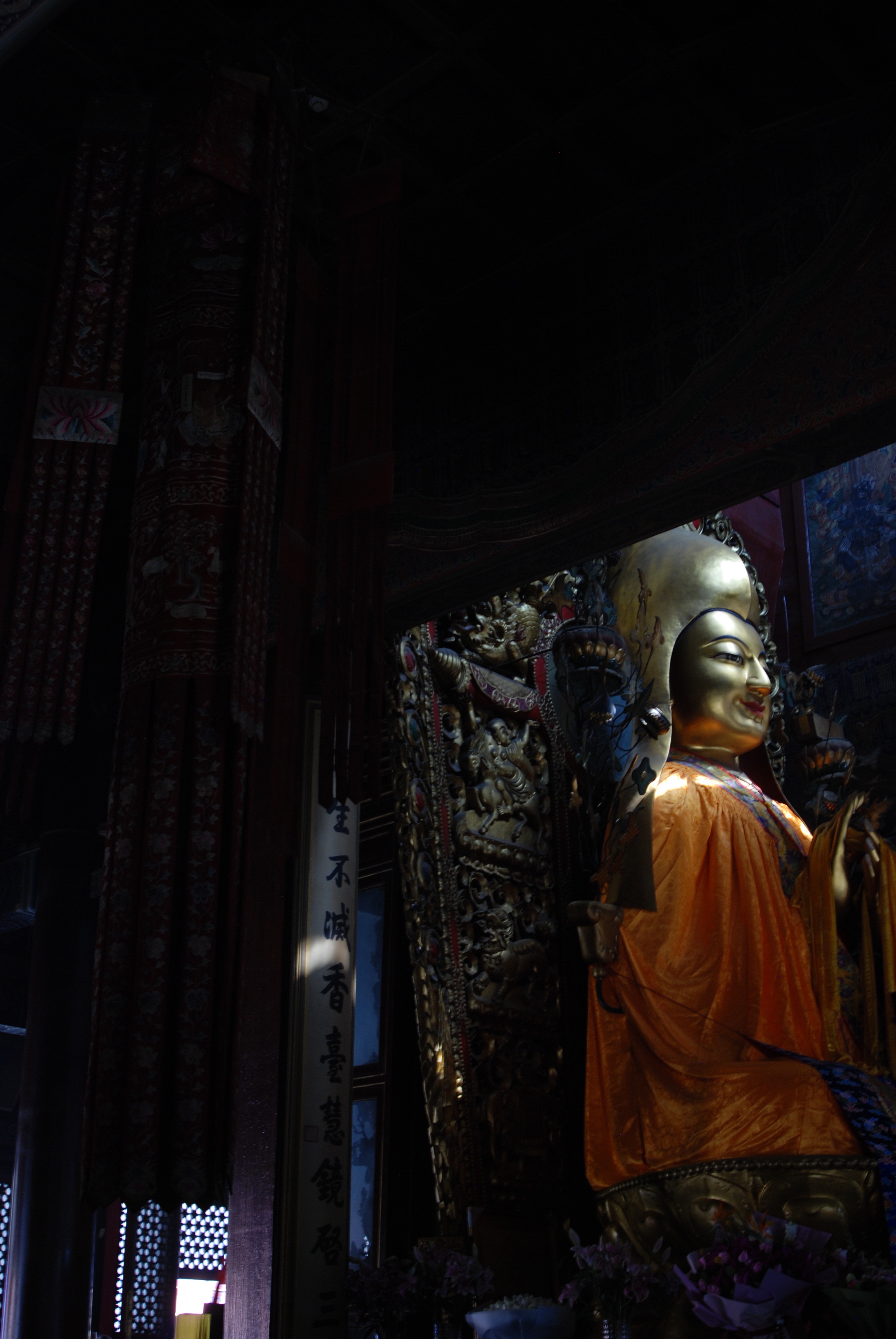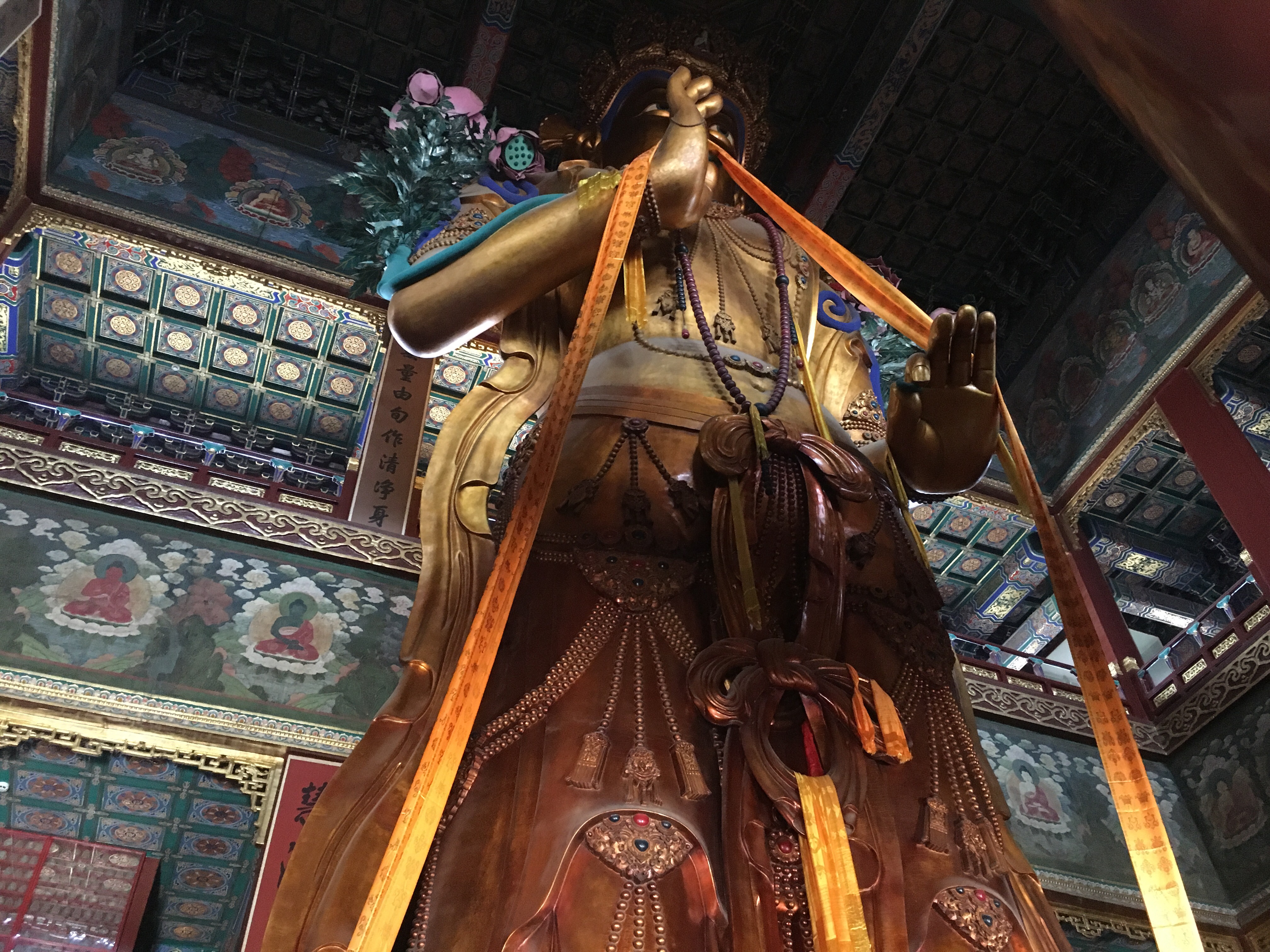 Destaca también, la estatua del Buda Maitreya, el conocido como Buda del futuro. De 18 metros de alto que se encuentra en el interior del pabellón Wanfu Ge (pabellón de las mil felicidades) y que fue tallada a partir de una única pieza de madera de sándalo.