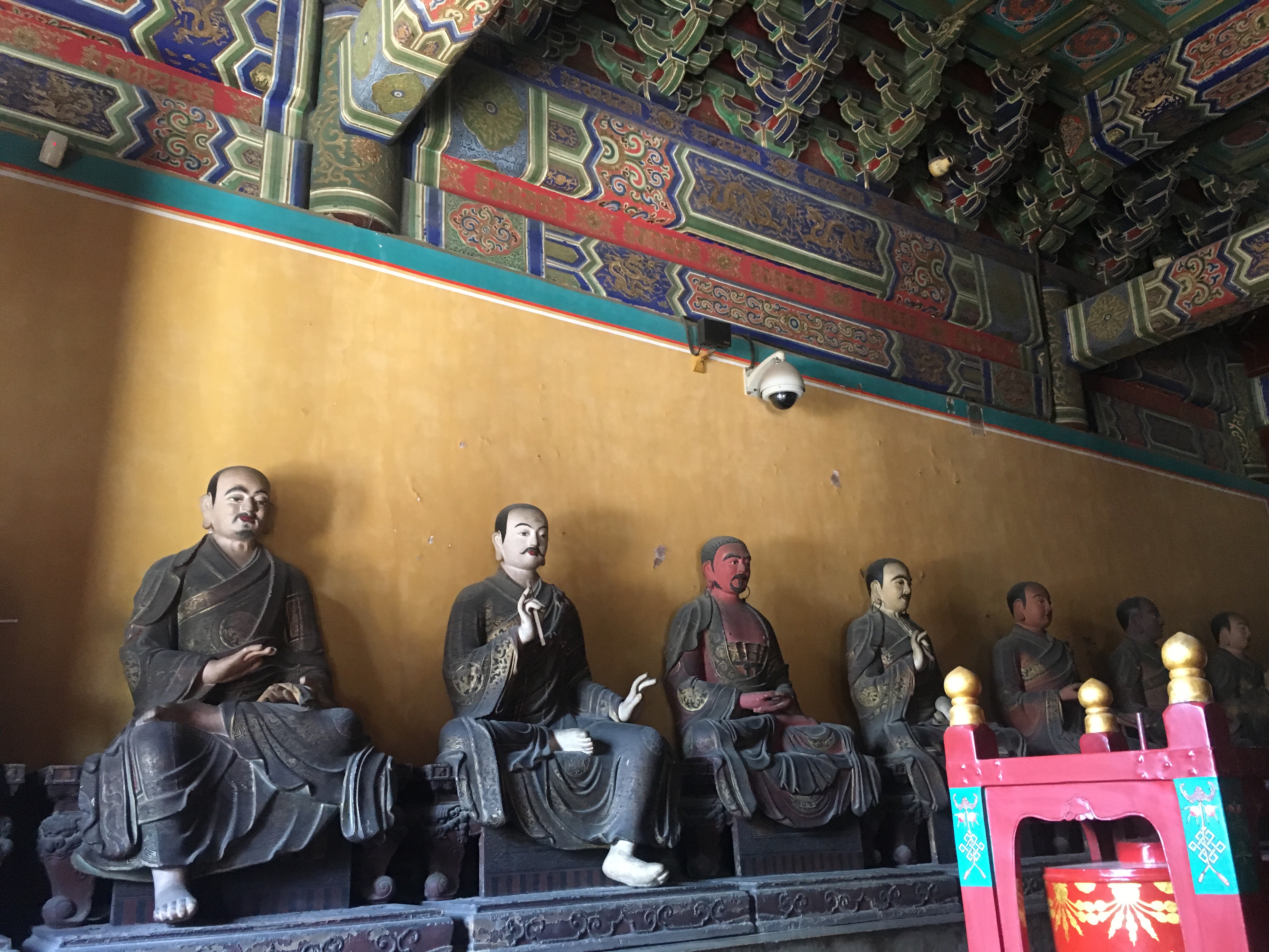 El edificio principal: el salón de la armonia y de la Paz, aloja los tres Budas de bronce de las tres edades (Foto de arriba): Buda Gautama (Buda del presente) en el centro, Kasyapa Matanga (Buda del pasado) a la derecha y Buda Maitreya (Buda del futuro) a la izquierda. Dentro de este templo hay nueve figuras a cada lado, se conocen como Arhats o guardianes de Buda. Cada uno con una posición de manos y pies (mudra) diferente.