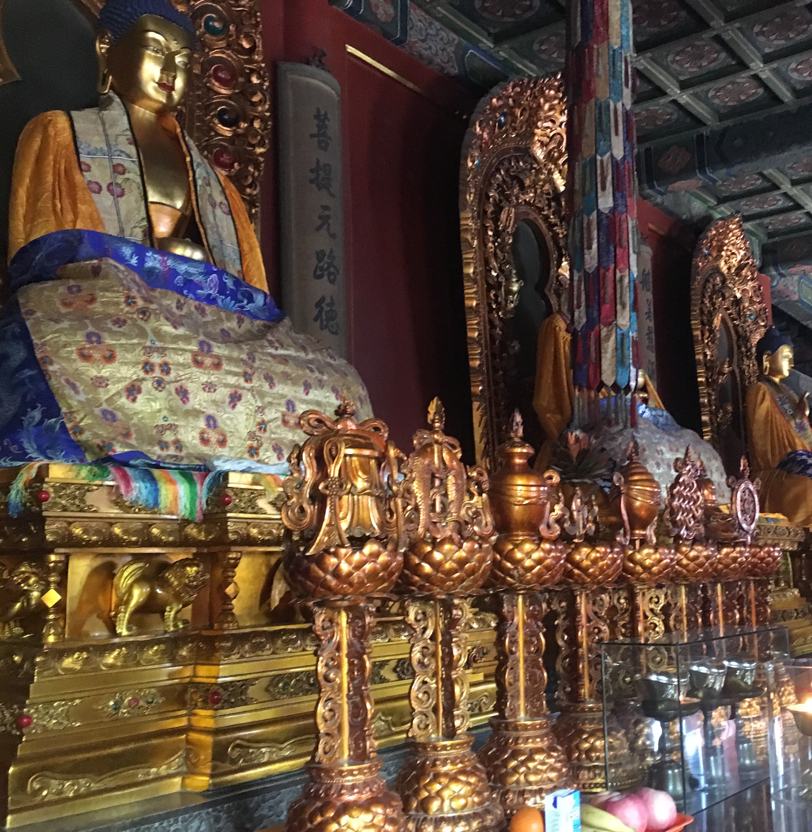 En la mesa delante de cada Buda vemos 8 amuletos, son los Ashta Mangalas, también conocidos como los 8 símbolos auspiciosos..