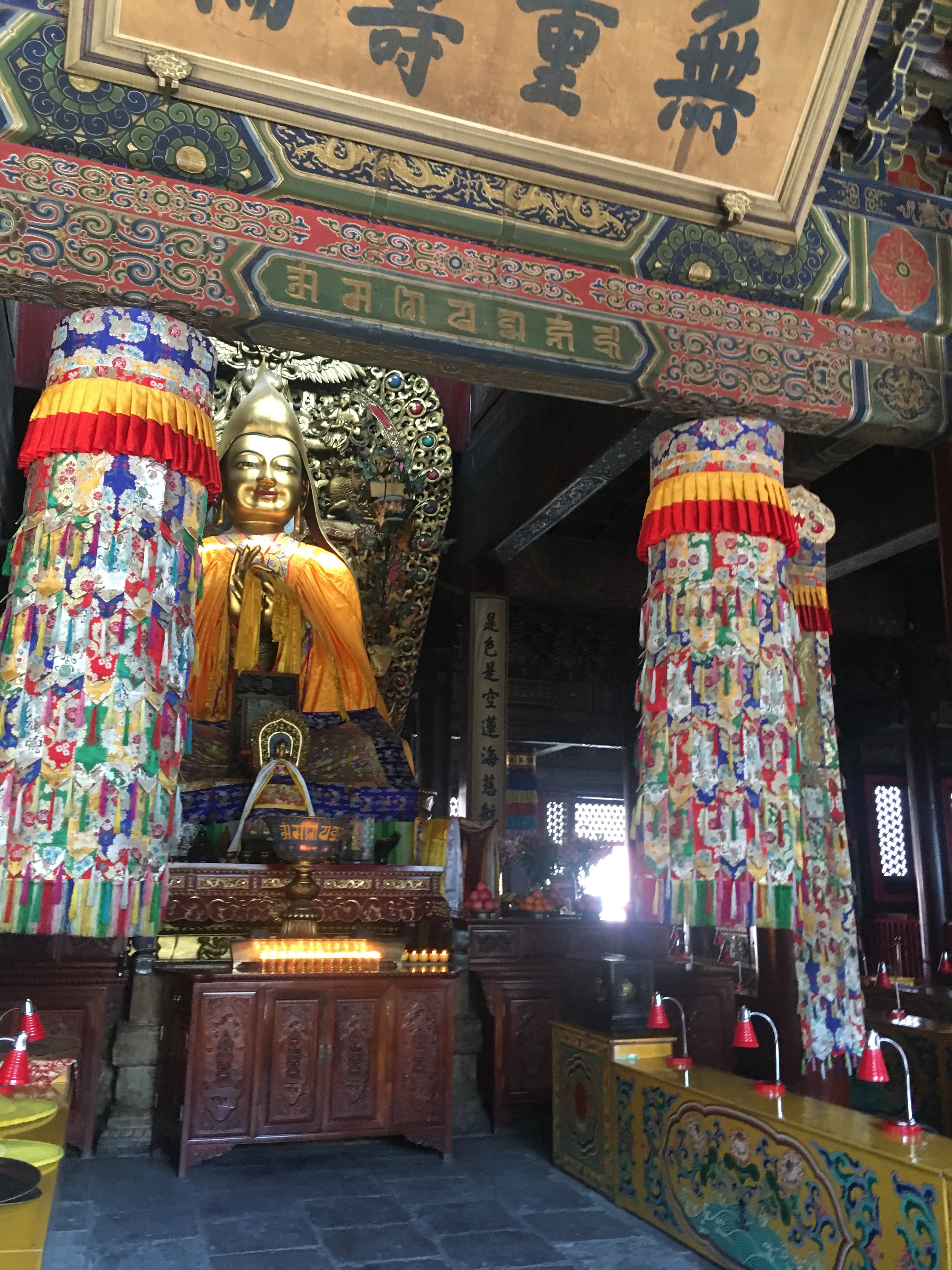 Tiene varios pabellones con figuras de Dioses y estatuas de Budas. Destaca, en el pabellón Falun Dian (sala de la rueda de la Ley), la estatua del Buda Tsongkapa, estatua de bronce de 6 metros de altura del fundador de la escuela budista de la orden del bonete amarillo, conocida bajo el nombre de Geluk.