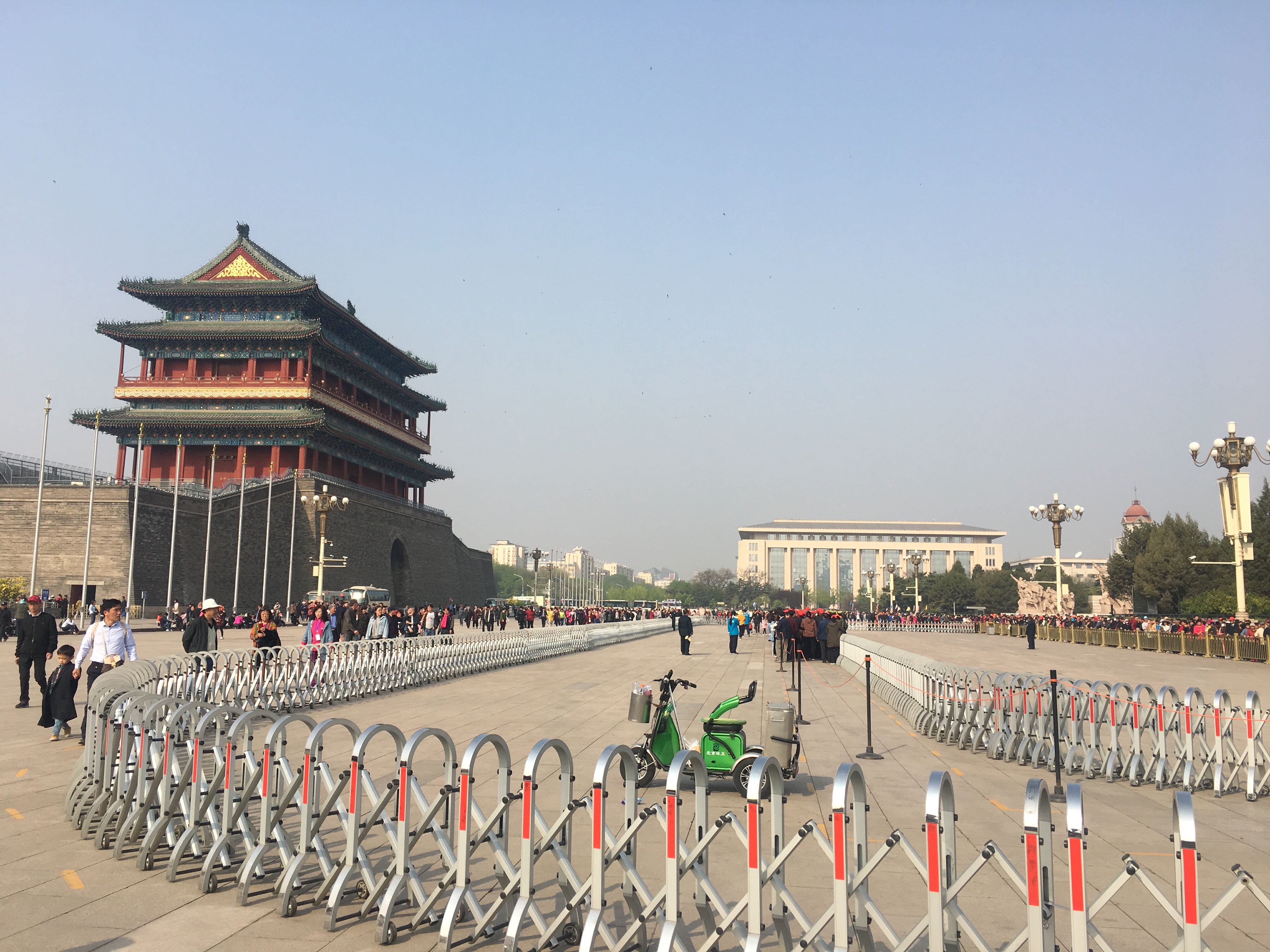 En el lado sur, la puerta de Zhengyangmen o «puerta del Sol cenital» (en la fotografía de abajo), formaba parte de las murallas de Beijing. Zhengyangmen sobrevivió a la demolición de las murallas a finales de la década de 1960, durante la construcción del metro.
