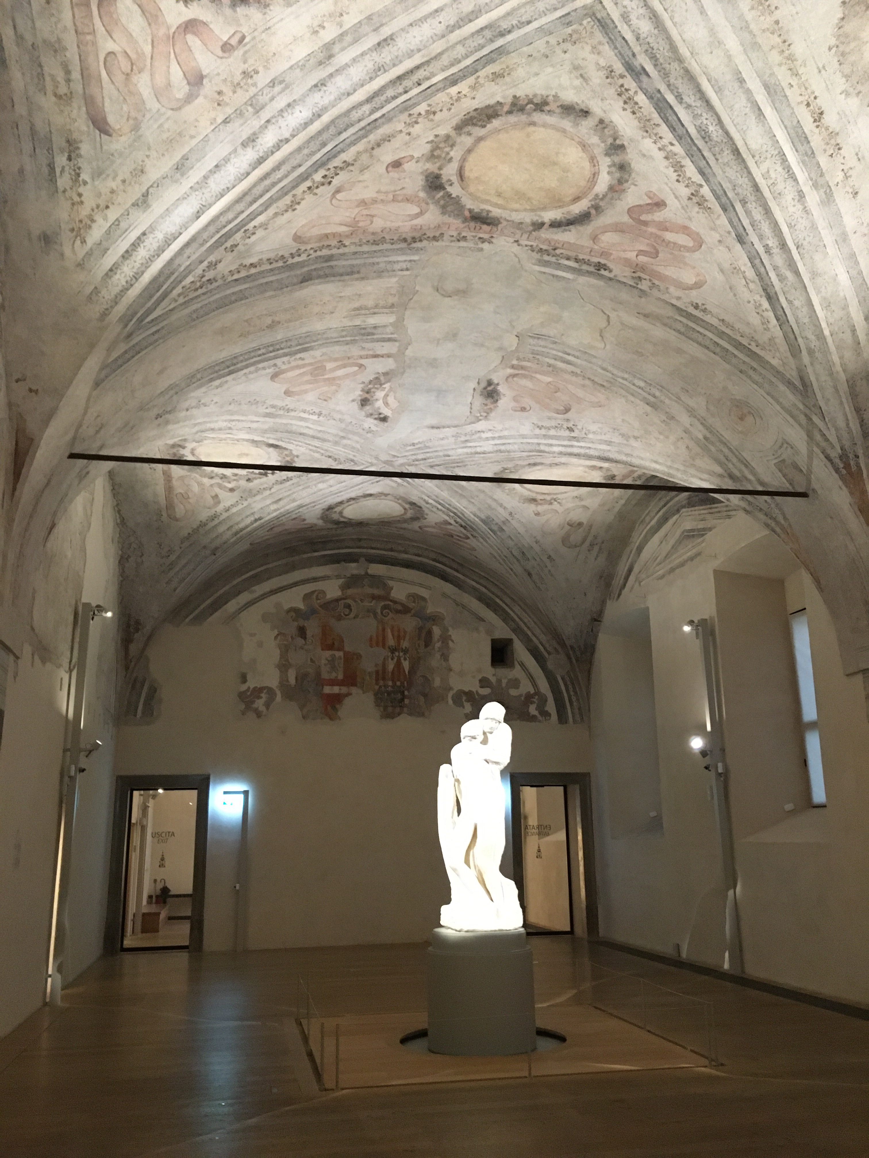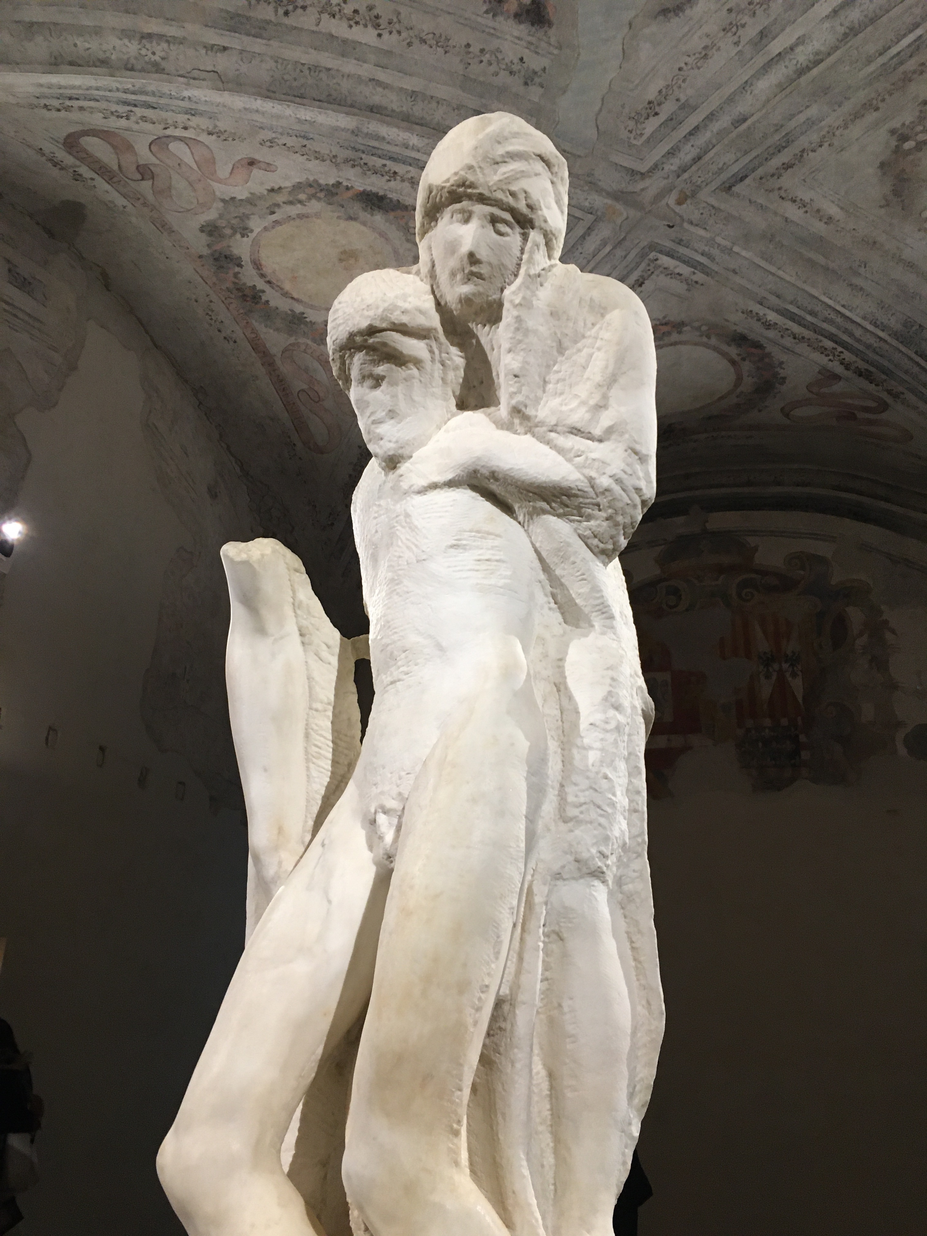 En el patio, el Museo Piedad Rondanini de Miguel Ángel. Con la obra inacabada y última escultura de Miguel Ángel que dejó incompleta debido a su muerte. Esta escultura se conserva en Milán desde 1952.