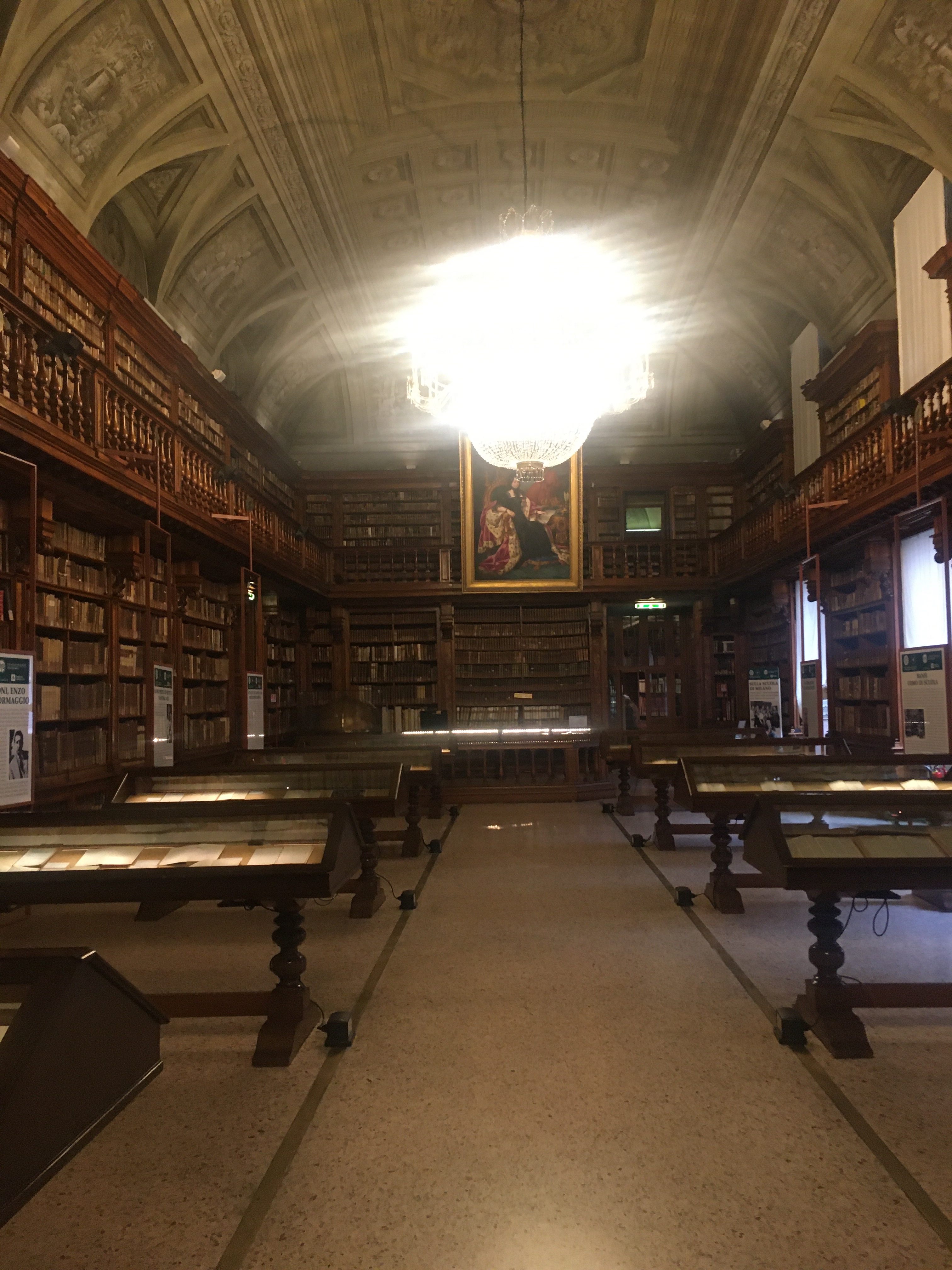 Fue fundada en 1618 por el Cardenal Federico Borromeo, tiene obras de Leonardo y sus seguidores, Botticelli, Caravaggio, Tiziano..la Biblioteca fue una de las primeras en ser abiertas al público en 1609.