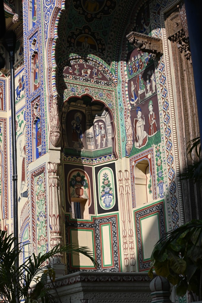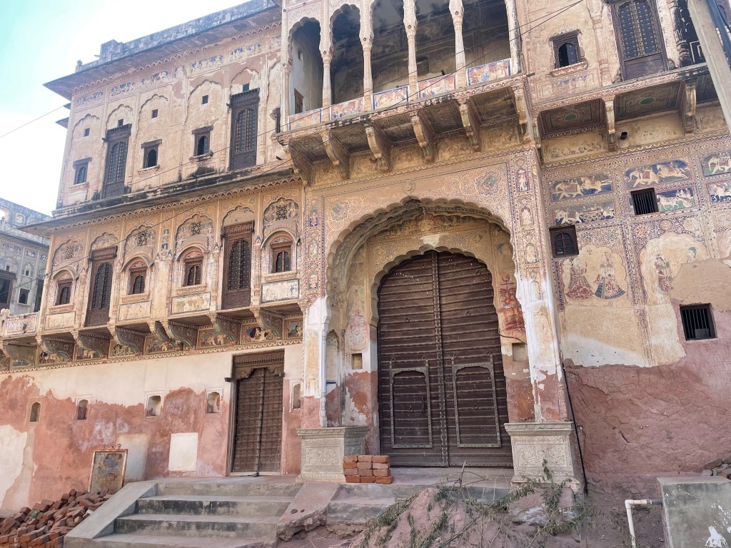 Mandawa. Una ciudad pequeña que fue un puesto de comercio para las antiguas rutas de caravanas de la ‘Ruta de la Seda’que paraban allí en su ruta hacia China y el Medio Oriente. Tiene un fuerte (un hotel en la actualidad) y montones de havelis (bastante destrozados algunos). Los havelis son preciosas casas de comerciantes que con la llegada de los británicos y el declive de la ruta de la seda fueron abandonadas, algunas han pasado a ser hoteles, otras están restaurándose…si tengo que puntuarlo del 1 al 10 le pondría un 6…(teniendo en cuenta lo que ves después) aquí hice mi primera y última compra. Hay que REGATEAR, el dinero que te pidan baja a más de la mitad…