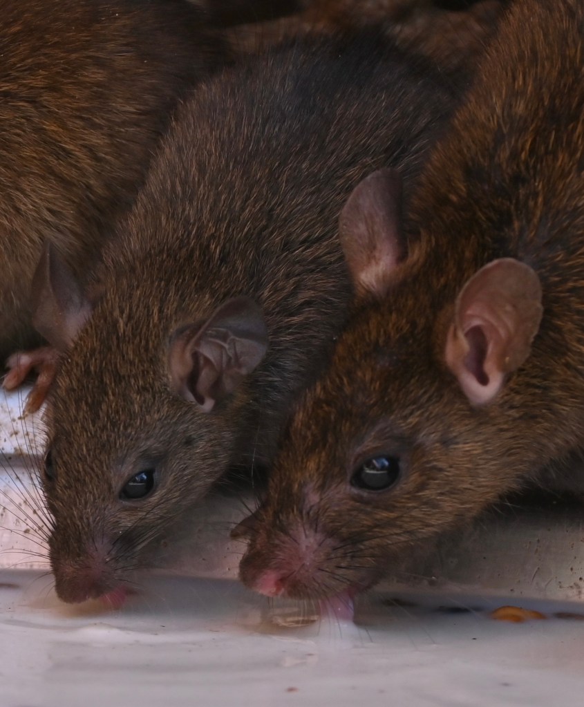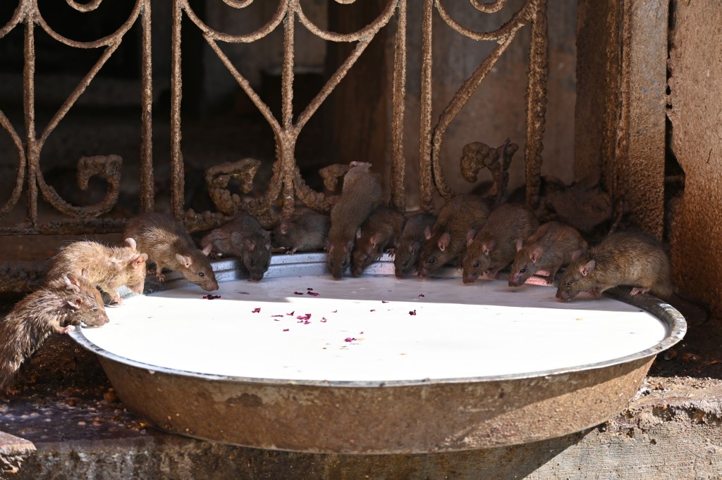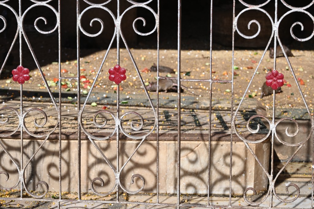 Resumiendo la historia: se ve que en tiempos muy muy lejanos había una semidiosa: Karni, a la que se le murió un hijo y fue a visitar al dios de la muerte para pedirle que lo resucitara. Este se negó. Así que está, convirtió a su hijo (realmente no sé si era un hijo) en rata y como venganza decretó que todos sus descendientes al morir se reencarnaran en ratas para privar de sus almas a la muerte. Hete aquí que unas 25.000 almas/reencarnaciones de seis familias viven aquí, y sus seguidores/amigos/familiares pues van a visitarlas y les llevan azúcar, semillas y comida varia y las adoran como si fueran su abuela, que igual es que si, los hay que besan el suelo, les dan leche para beber…muy bonito todo. 🤢