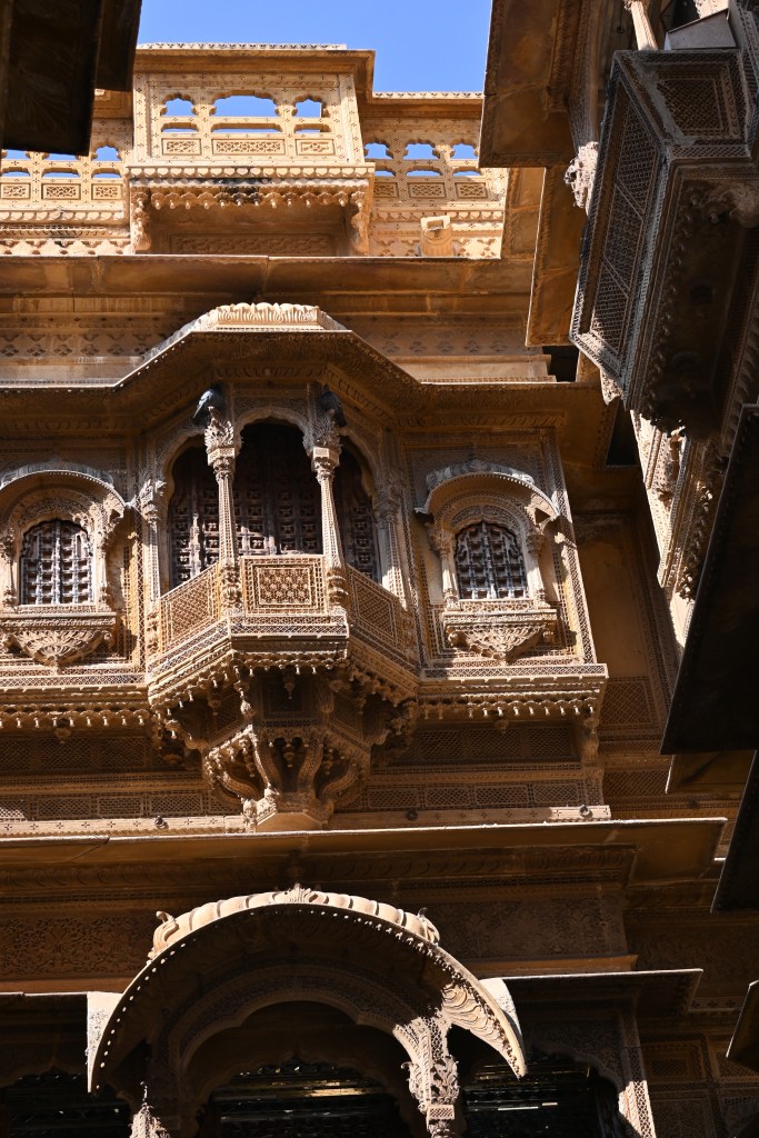 4. Havelis. En Jaisalmer el Patwon Ki Haveli – es el segundo lugar más popular después del Fuerte y no es solo un edificio, sino unacombinación de cinco Havelis diferentes, cada uno con su arquitectura y diseño únicos. Este edificio es también conocido como “el haveli de los hermanos Patwa”. Fue construido por el mercader de joyas Guman Chand Patwa para sus cinco hijos, y sus obras duraron 50 años. La mayor parte está remodelado, increíble por fuera, nada relevante en el interior.