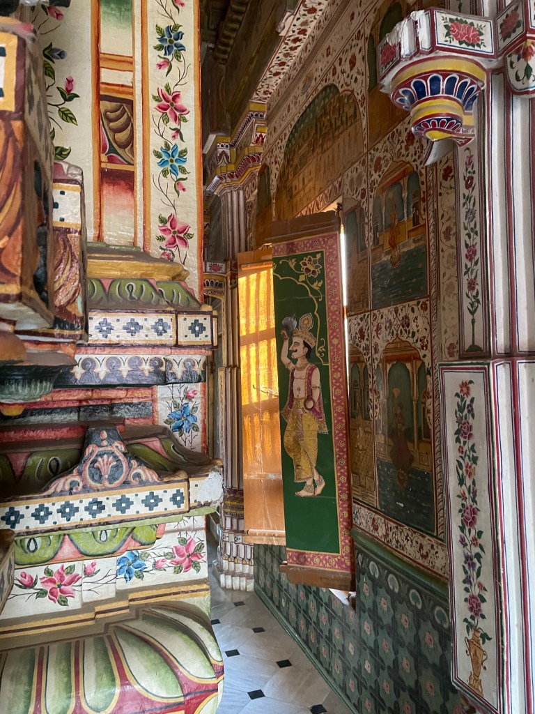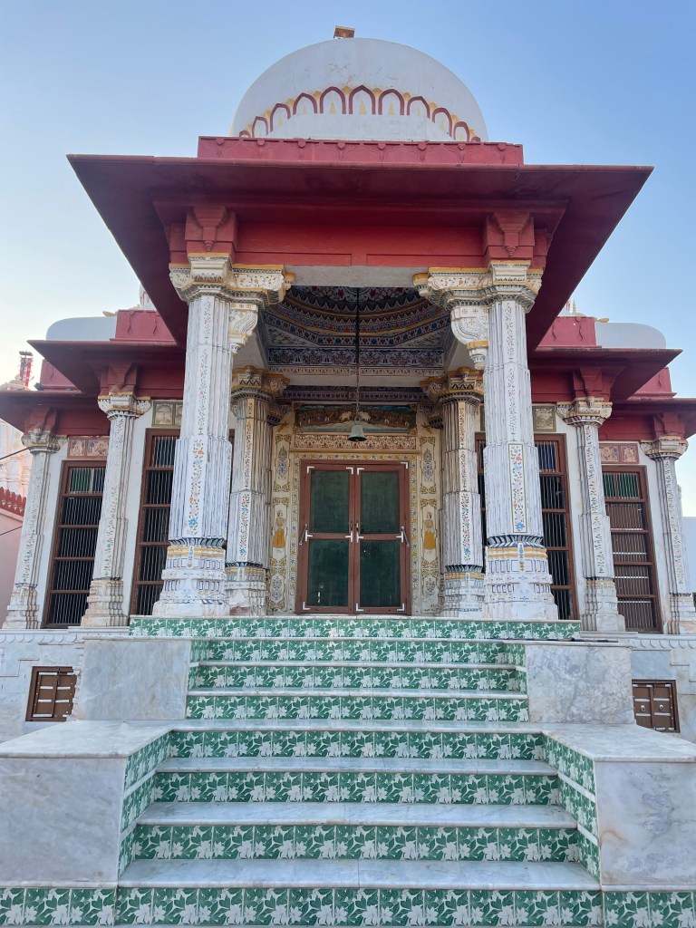 Este de Bikaner es uno de los más bonitos y diferente, lleno de pinturas y colores, lo que no es habitual. Increíble. Construido en el siglo XV, consta de tres pisos y está hecho con arenisca roja y mármol blanco..Según las leyendas, se usaron 40,000 Kgs de Ghee (mantequilla) en la construcción de este templo en lugar de agua en el mortero (a esto yo no le veo mucho la gracia, pero a ellos les parece lo más, insisten en que se filtra a través de las paredes en los días calurosos. Así que si vas en agosto no te roces mucho con las paredes)
