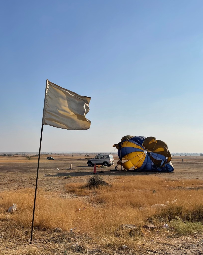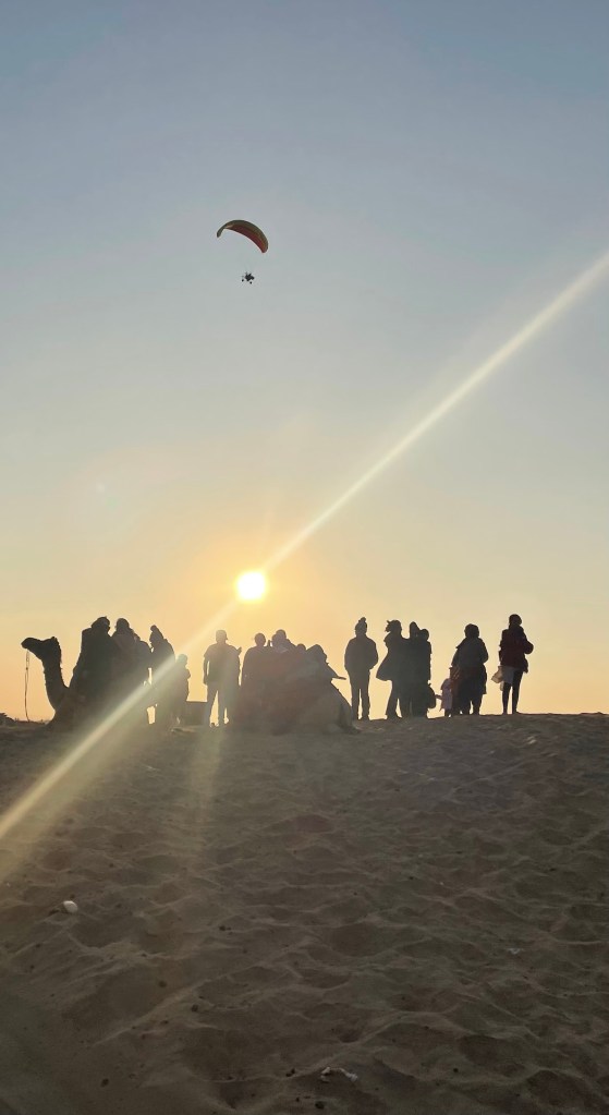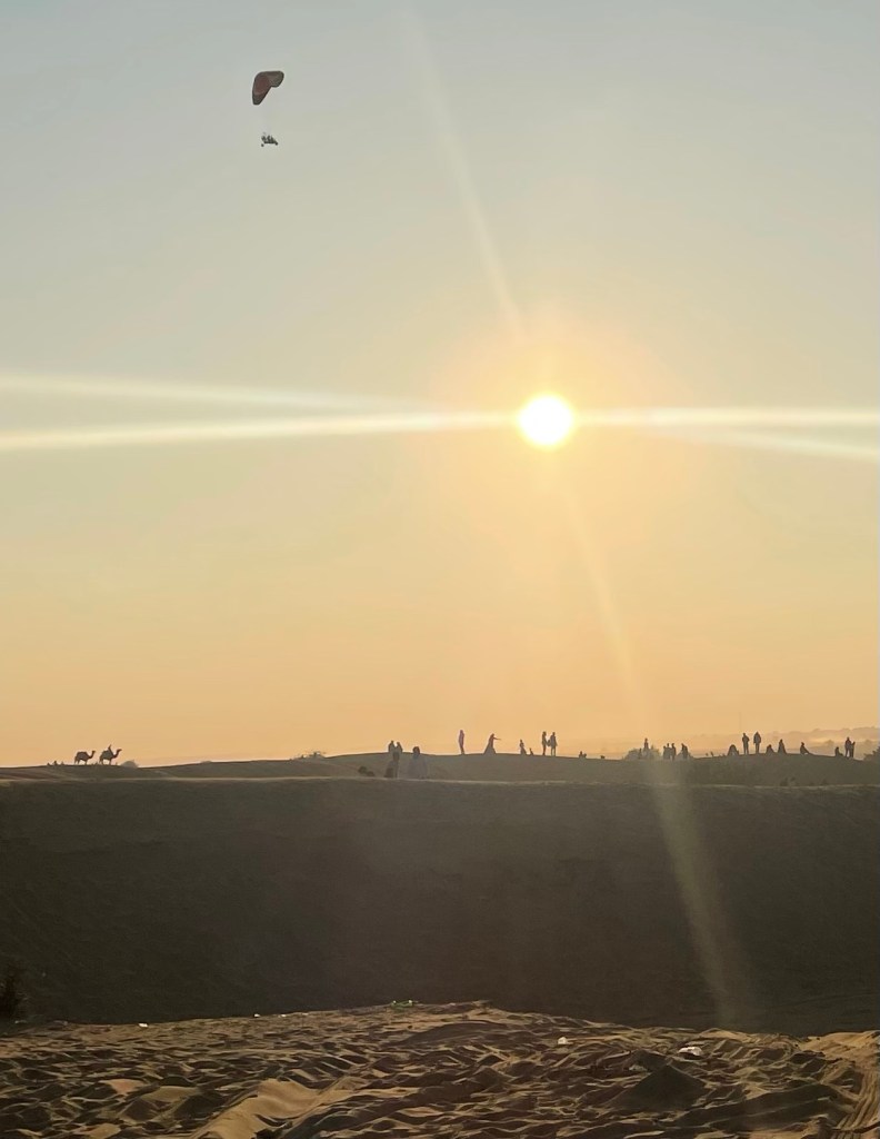 Por la tarde tengo excursión a las dunas del Desierto Thar, la excursión promete ser una turistada, que incluye cena en el desierto y paseo en camello. Les digo que no quiero hacer excursión en camello y no quiero cena en el desierto. Solo ver el atardecer en jeep si es posible. Nos vamos para el desierto hacia las 3:30 de la tarde. Tardamos como 1h en llegar a la zona de las dunas. Esta zona creo que es la zona conocida como SAM a una hora más de viaje hay más dunas (evidentemente) y cuanto más lejos menos turistas (dunas de Khuri) Por el camino se pueden ver grupos de turistas (indios) haciendo una especie de parapente o vuelo con paracaídas…