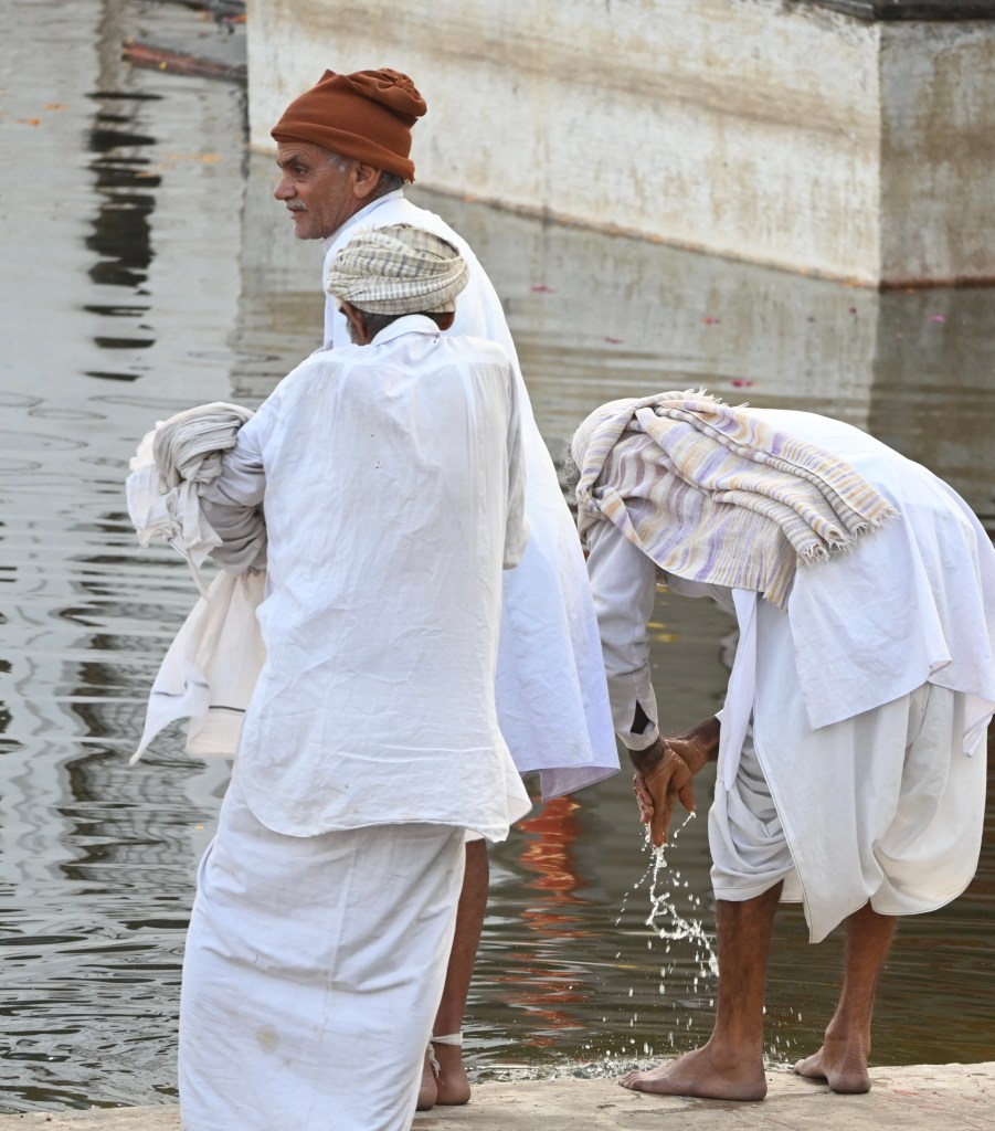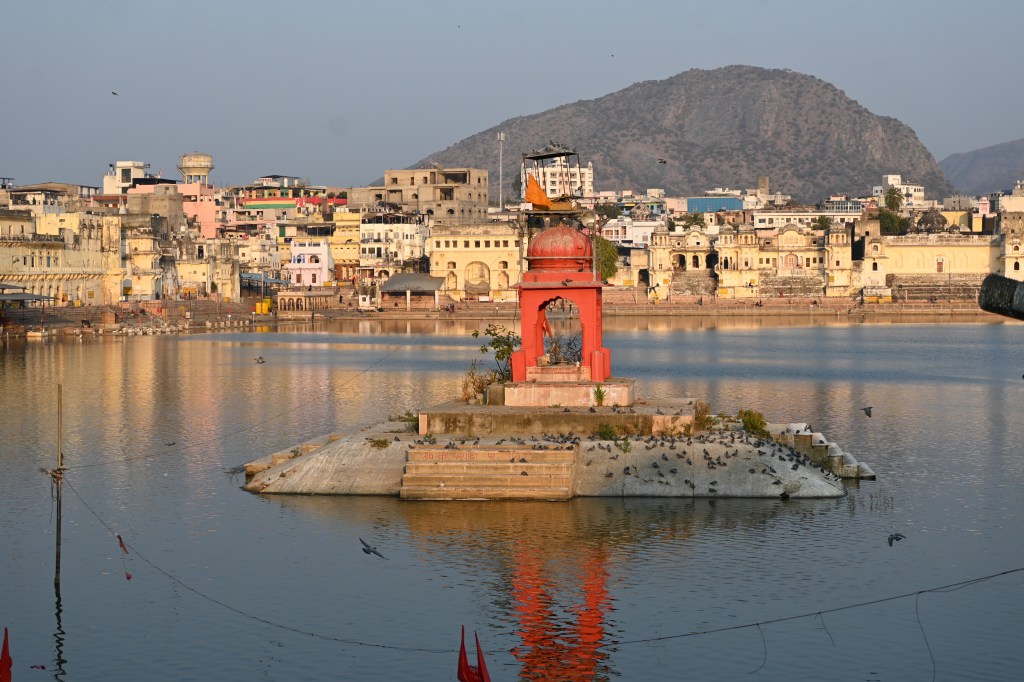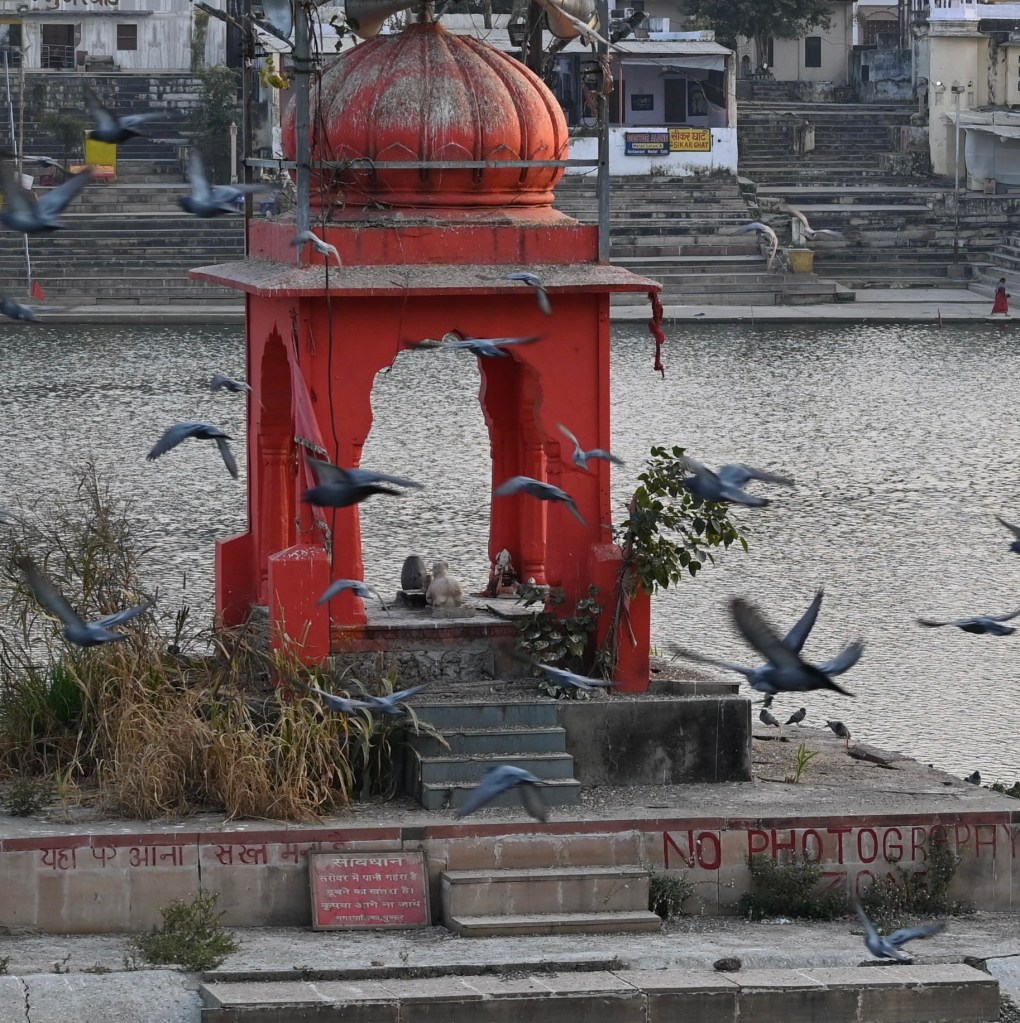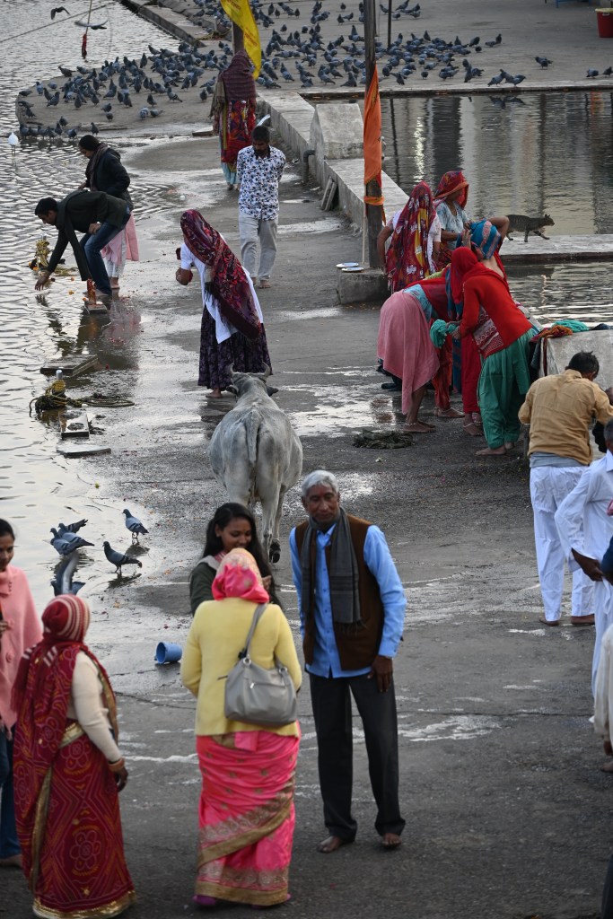 1. El lago. El lago de Pushkar o Pushkar Sarovar me pareció precioso, diferente claro al de Udaipur. Pequeño, rodeado de escalinatas (Ghats) donde los peregrinos hacen las ofrendas (pujas) las ceremonias de fuego (Aarti) y donde se bañan para purificarse. Las mujeres con sus saris se sumergen varias veces mientras repiten sus mantras. En el centro del lago, justo donde dice la leyenda que Lord Brahma, el dios hindú de la creación, dejó caer una flor de loto, se halla un pequeño templo rojo y cientos de palomas que cada poco te hacen un vuelo rasante. Si no sacas aquí la mejor foto del viaje, no la vas a sacar en ningún sitio. Hay que descalzarse para bajar a los Ghats todos los accesos son gratuitos. Hay 52 ghats