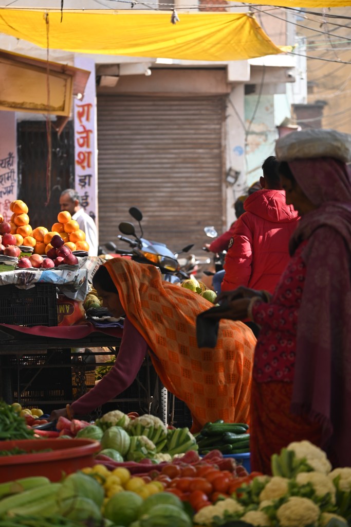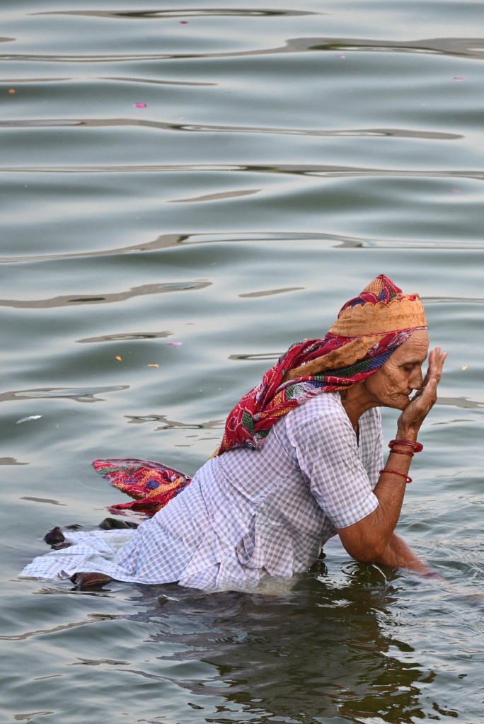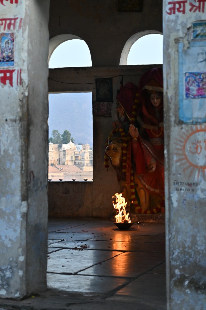 Tercero, Pushkar es una ciudad sagrada, un centro de peregrinaje, lo cual significa varias cosas. 1) devotos que visitan este lugar religioso. Los devotos que visitan los cuatro ‘dhams’ de la India deben visitar Pushkar para lograr la salvación. 2) lugar preparado para turistas (yo no vi muchos, pero sí más que en otros sitios), es decir, mercado con puestos y puestos y puestos de malas, pulseras, comida, recuerdos etc y multitud de restaurantes para “europeos” y 3) cosas increíbles: peregrinos bañándose en el lago y haciendo pujas. Los saris secándose al sol. Ceremonias Aarti al anochecer y decenas de santones.
