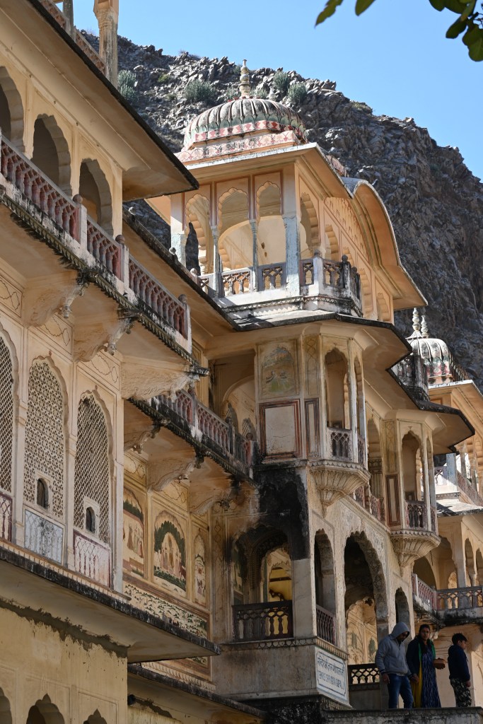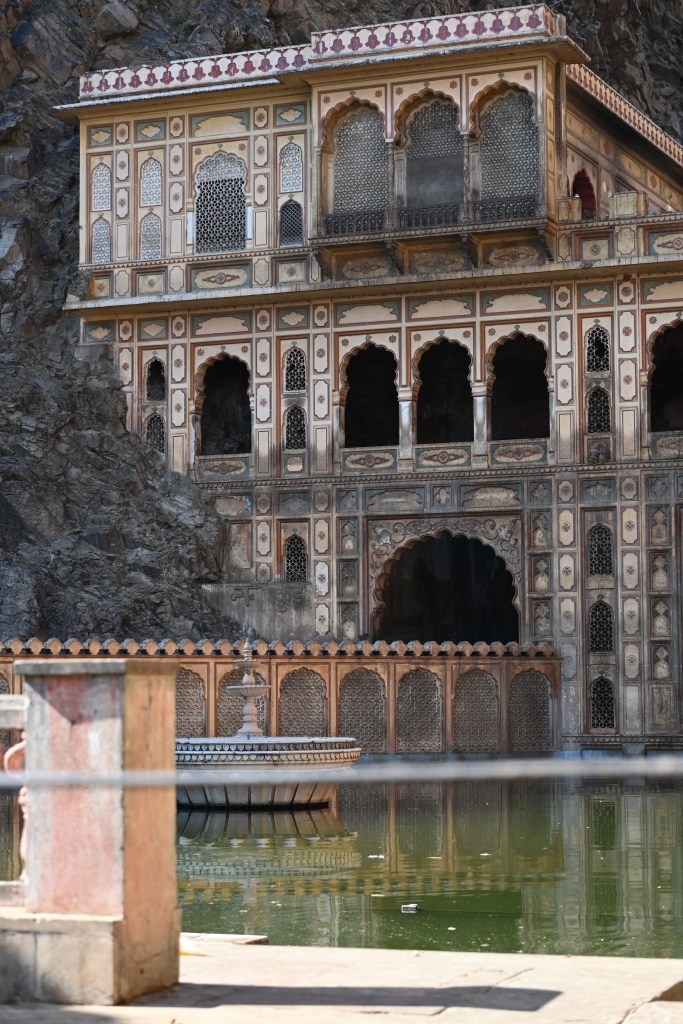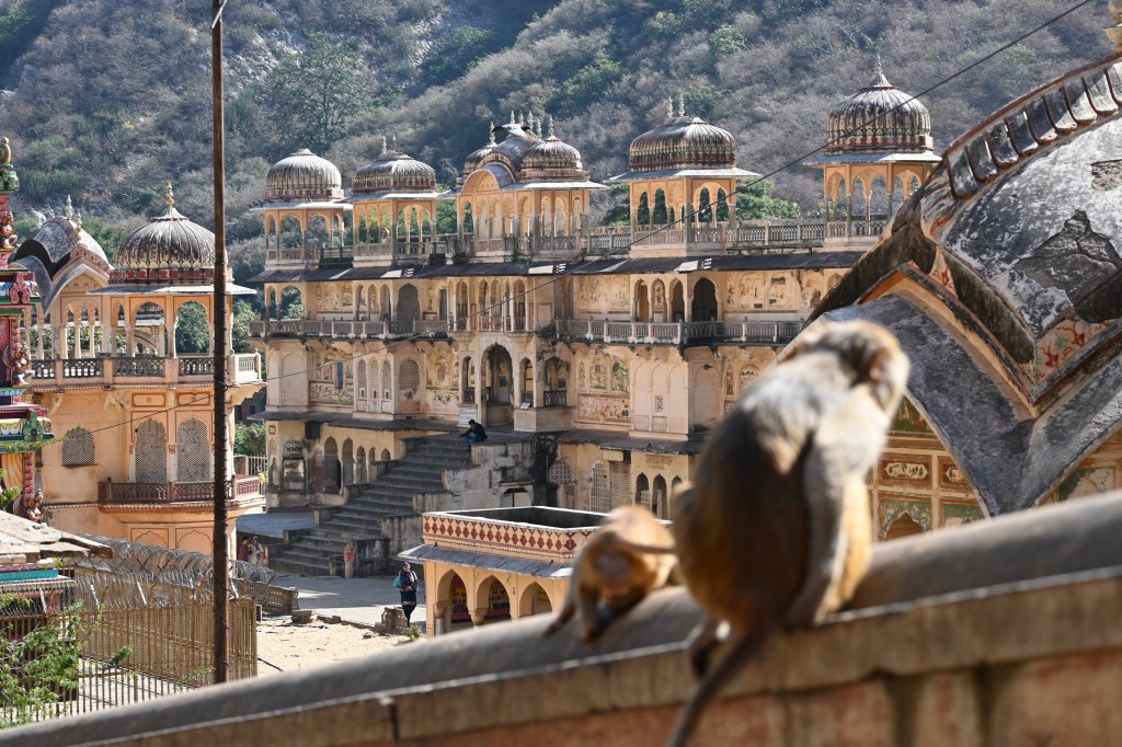 El complejo tiene varios templos, con frescos increíbles no muy bien cuidados, al fondo, el más famoso, el Templo de Galtaji, construido en piedra rosada. El templo cuenta con una serie de pabellones con techos redondeados y las paredes pintadas. El complejo está situado alrededor de un manantial natural que forma dos piscinas escalonadas, donde se bañan los peregrinos, y supongo que los monos. El color del agua: verde muy verde. Subiendo unas escaleras llegas hasta el templo de Hanuman, donde el santón me explica que en una roca se puede ver la imagen de hanuman y que si quiero me bendice. Le digo que no hace falta gracias. Es abajo en los templos donde otro me pide 8$ por una pulsera y una bendición. No hay turistas, solo mujeres indias de peregrinación, los santones, los monos y yo. Cool. Cambiar el observatorio por esto es un gran acierto.