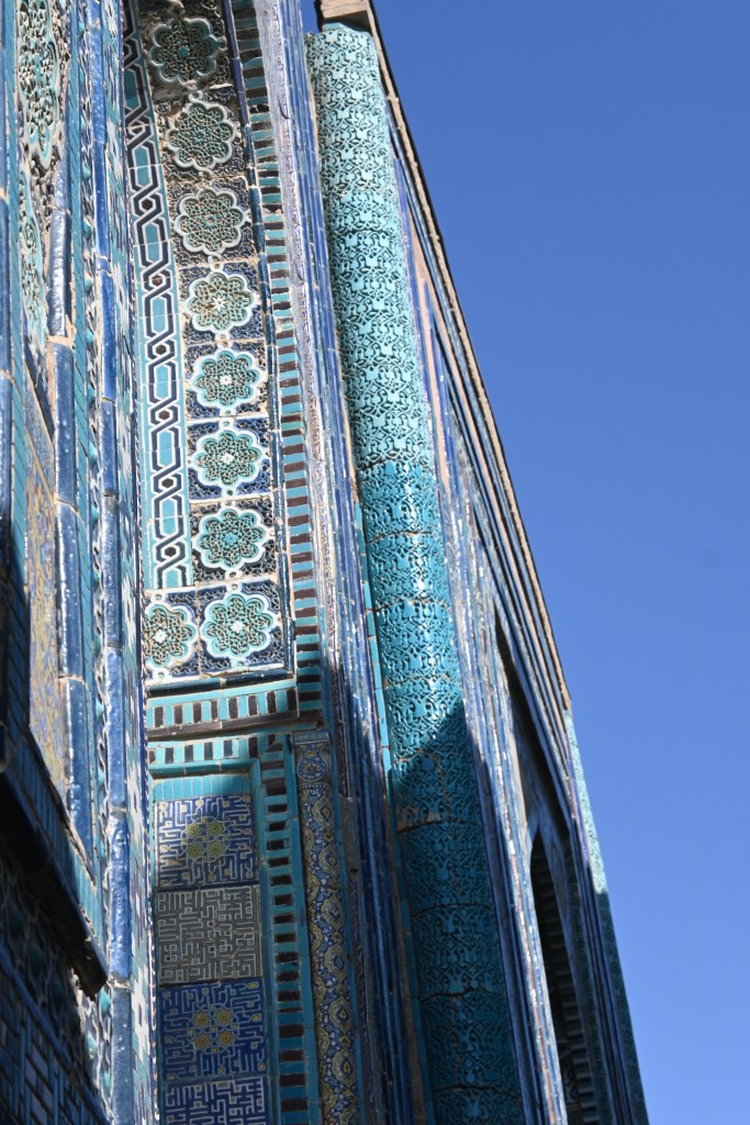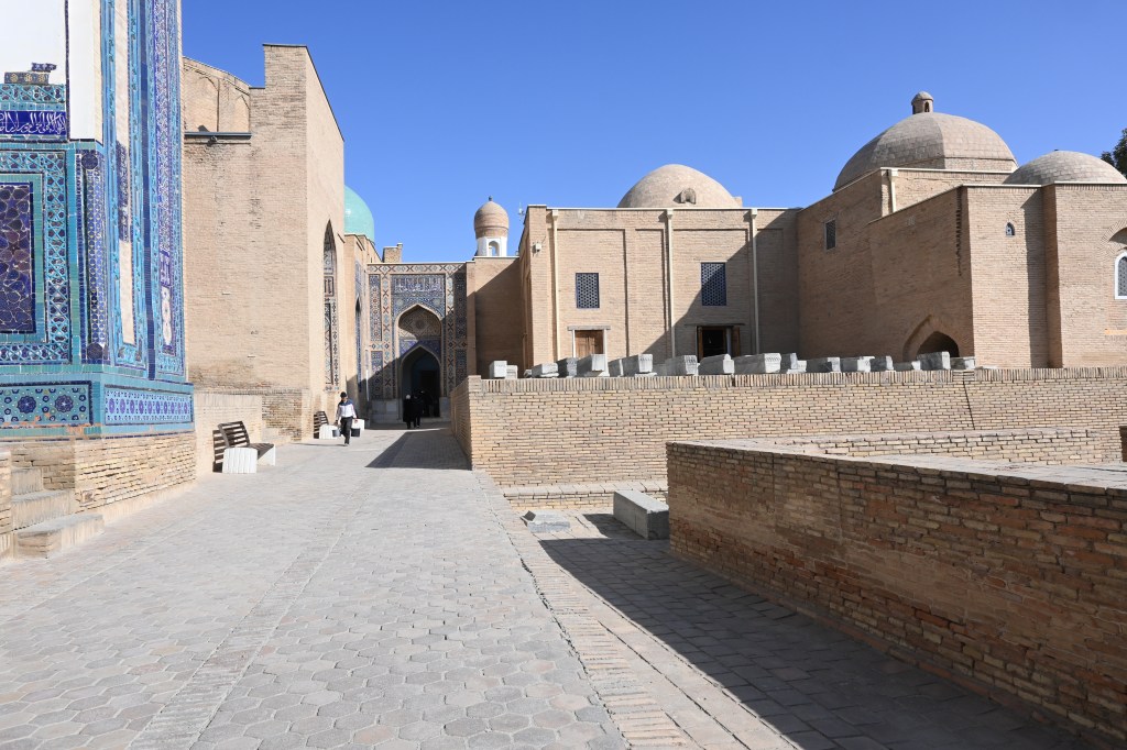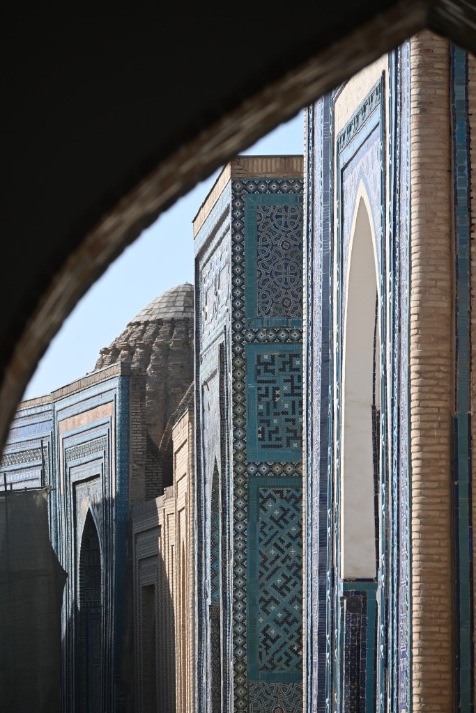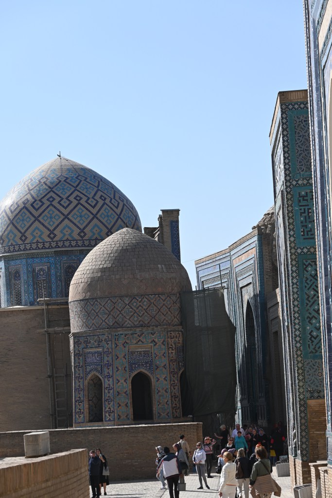 En Samarkanda también está la increíble Necrópolis de Shah-i-Zinda. Recinto declarado Patrimonio de la humanidad. Una fila de once mausoleos de increíbles cúpulas con mosaicos verdes y azules, agrupados a lo largo de estrechas calles medievales. El complejo fue llamado “Shahi Zinda” que en persa significa “El rey viviente”.