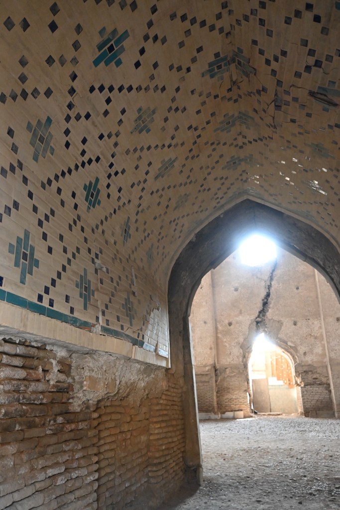 La mayor parte se derrumbó durante un terremoto en 1897, ha sido restaurada por el Gobierno con el azulejo original. Hoy en día, de todo el complejo solo se pueden ver cinco edificios supervivientes: el portal, la gran mezquita al fondo del patio, dos mezquitas pequeñas y un minarete. Además, el centro del patio está decorado con un enorme púlpito con Corán, todo de mármol, fabricado durante la época de Ulugh Beg.