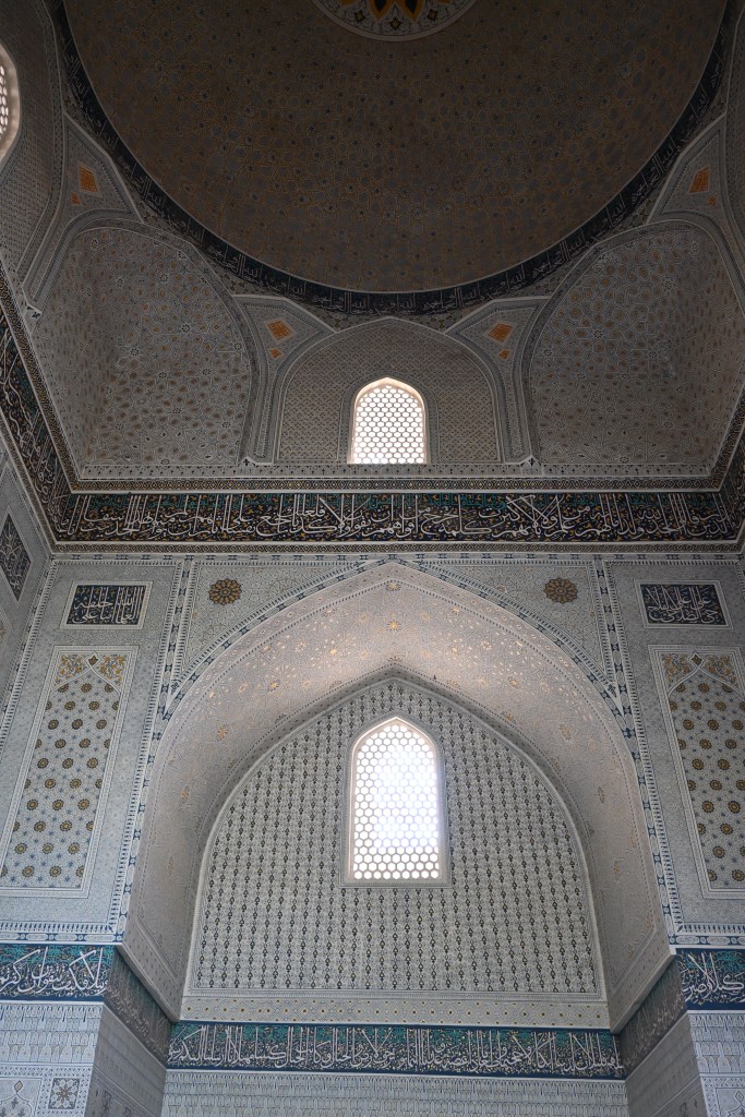 La mezquita, era inmensa, solo la puerta principal tiene más de 35 metros de altura, es uno de los edificios más grandes de Samarcanda, tenía cuatro minaretes, el patio central estaba enlosado con placas de mármol y de cerámica y rodeado por un corredor de arcadas con 480 columnas de mármol blanco coronadas por cúpulas.