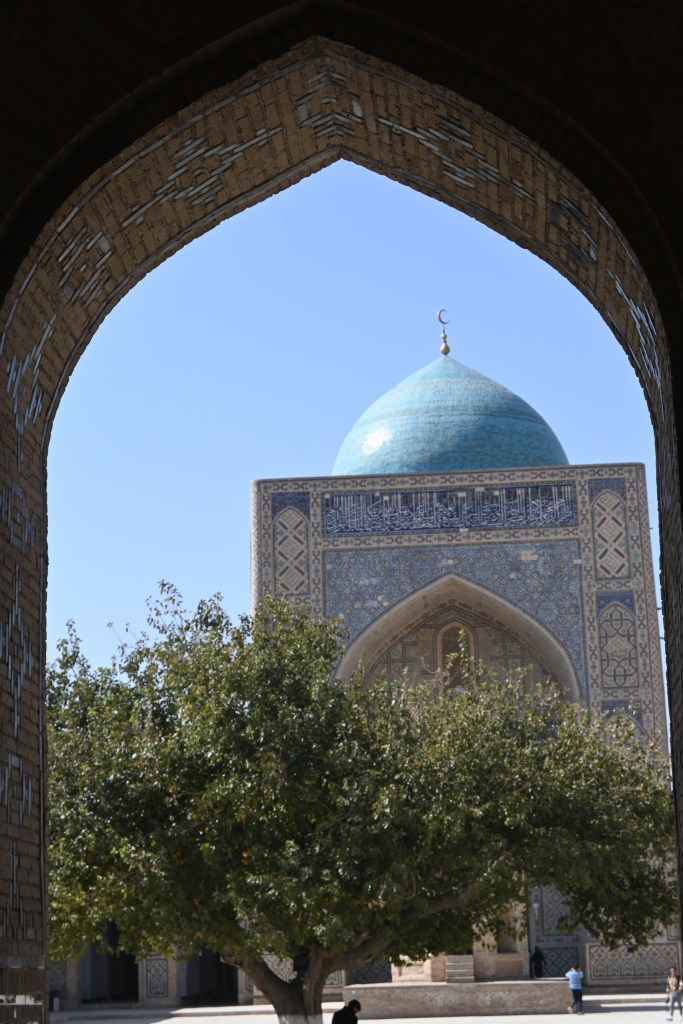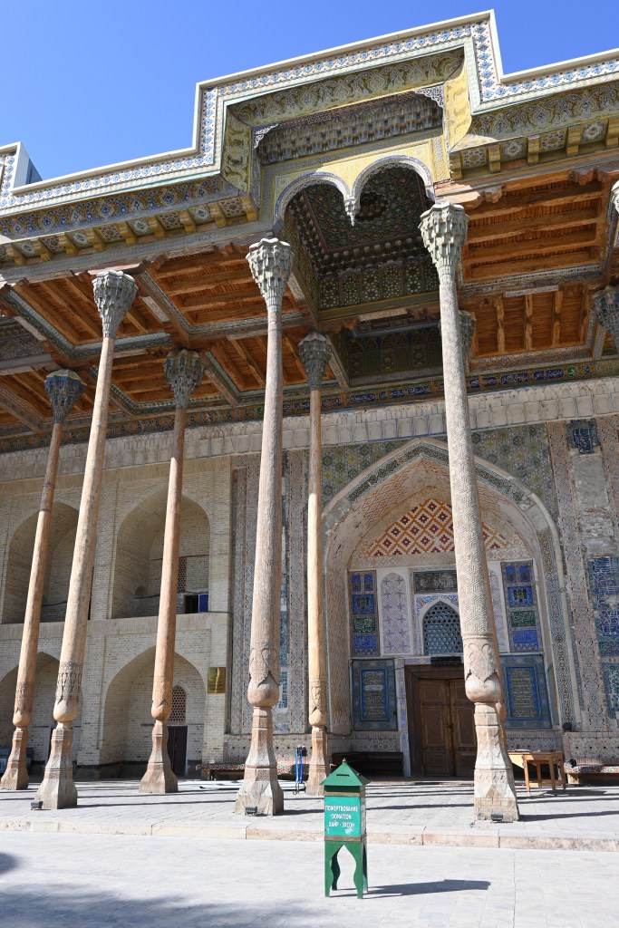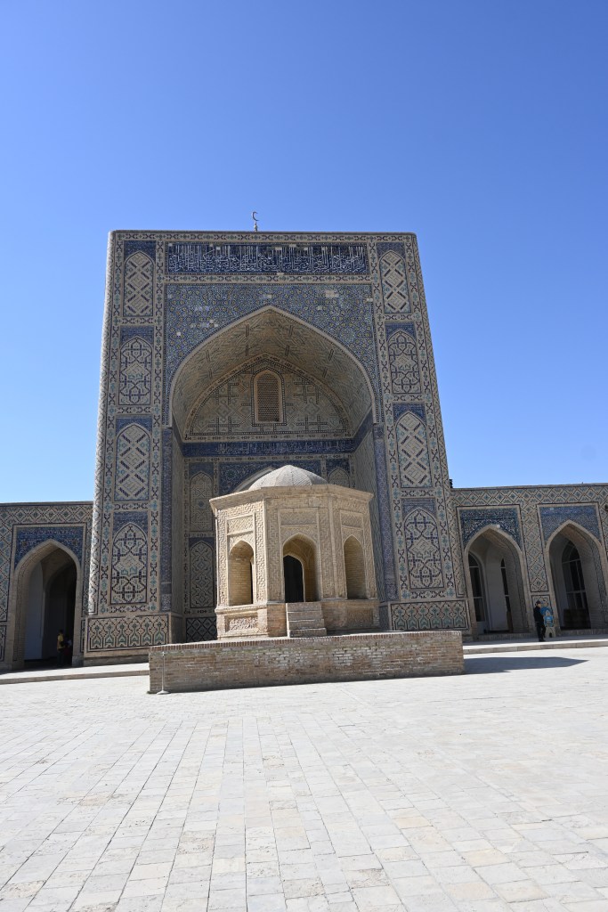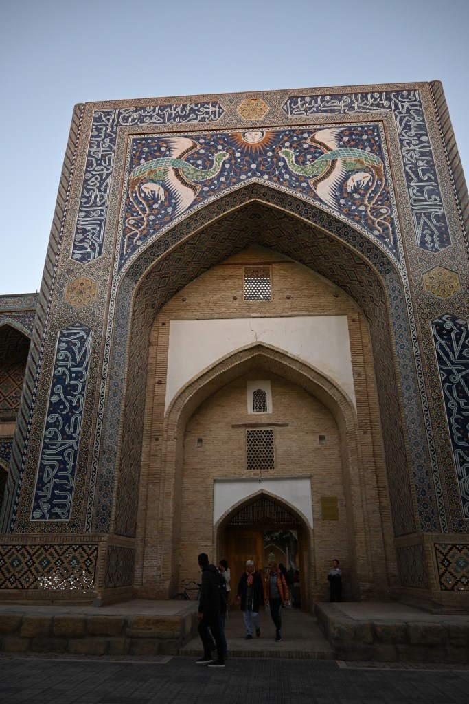 Frente a la mezquita Kalon aparece esta madrasa, que aún funciona como tal, con una fachada interrumpida por un altivo iwan(pórtico) con nichos abovedados, arcadas en forma de logias y todo forrado de azulejos púrpuras y verdemares repletos a su vez de geometrías y relieves de textos sagrados. Dicen las crónicas que tuvieron que vender 3.000 esclavos persas para pagar su construcción. Tiene 114 celdas, el mismo número que suras el Corán.