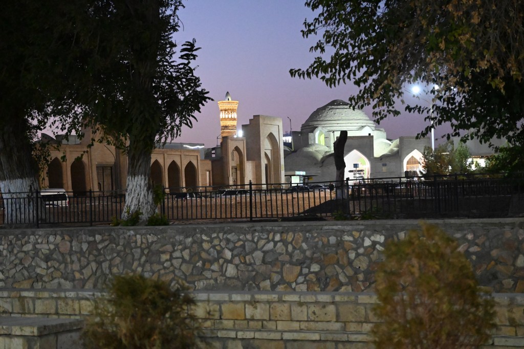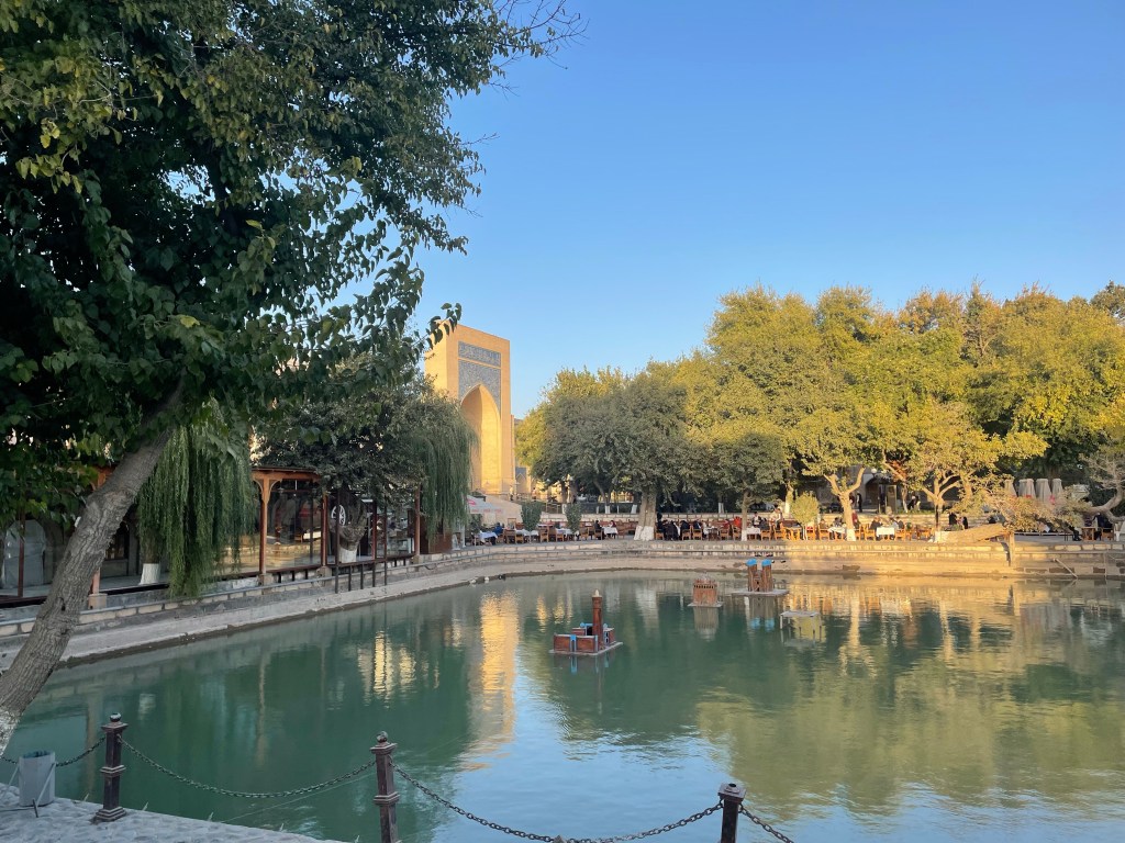 Justo en frente del hotel (Asia Bukhara, bastante regular) se encuentra Lyabi-Huz, una plaza construida en 1620, con un estanque, una madrasa, restaurantes, tiendas…la plaza bulle con sus puestitos callejeros al atardecer, sus cerámicas, especias y recuerdos varios.