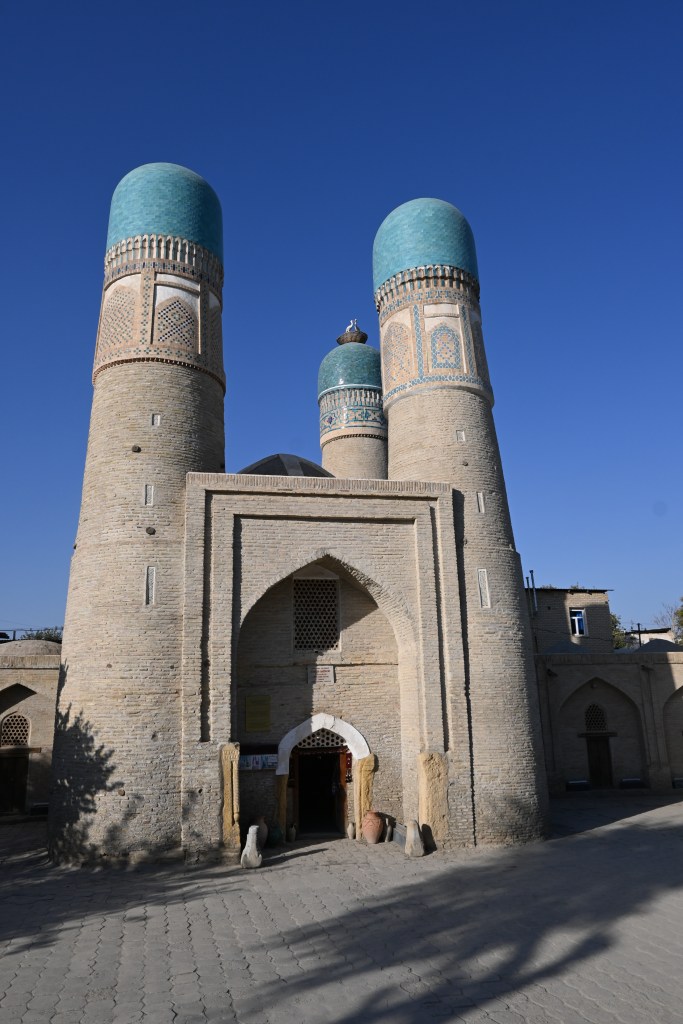 Esta construcción se encuentra a unos 15 min andando de la plaza, en dirección contraria a los bazares cubiertos. Fácil de encontrar callejeando (es más sencillo de lo que parece. Se baja recto por la avenida principal hasta la perpendicular que te deja en el edificio, yo no baje recto y di bastantes vueltas por callejones, pero lo encontré. (Llevaba descargado el Maps de Bukhara lo que ayudó mucho también) El edificio, que tiene en su interior una tienda, es la antigua puerta monumental de una madrasa ya desaparecida y tiene cuatro torres rematadas por cúpulas vidriadas, a donde se puede acceder por un ridículo precio.