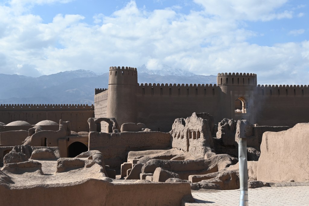 A la mañana siguiente nos dirigimos a la fortaleza o castillo de Rayen, construida con adobe y declarada Patrimonio de la Humanidad por la UNESCO. La ciudadela de Rayen (Arg-e Rayen) es un castillo de adobe ubicado a los pies del monte Hazar, de 4501 metros de altitud. El castillo estuvo habitado hasta hace 150 años y, aunque se sabe que tiene más de 1000 años de antigüedad, se cree que pudo ser fundado en la era preislámica de los sasánidas. Tras hacer las primeras fotos desde el exterior a sus muros y el foso, entramos a la ciudadela. En la parte más cercana a la entrada se encontraba el bazar, debido a que era el lugar en el que paraban las caravanas para comerciar. La ciudadela posee 12 torres en muy buen estado de conservación. No había nadie.