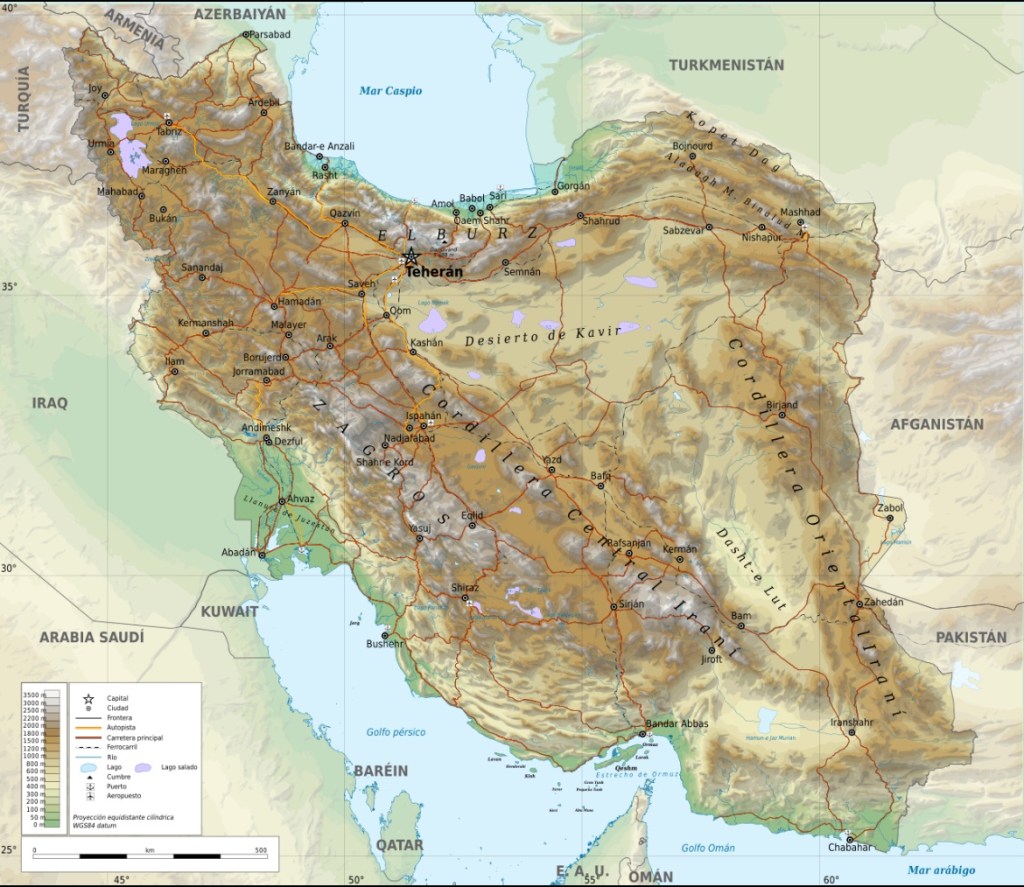 Irán se encuentra en una meseta, tiene 2 cordilleras (Zagros y Alborz) 2 desiertos (Dasht-e Kavir y Dasht-e Lut al Sur), 2 mares (Mar Arábigo y Mar Caspio), hace frontera con 7 países (Afganistán, Pakistán, Turkmenistán, Azerbaiyán, Armenia, Turquía e Iraq) y es unas 3 veces mayor en extensión que España. Los desiertos excepto por lo que se refiere a algunos oasis aislados, se encuentran deshabitados.