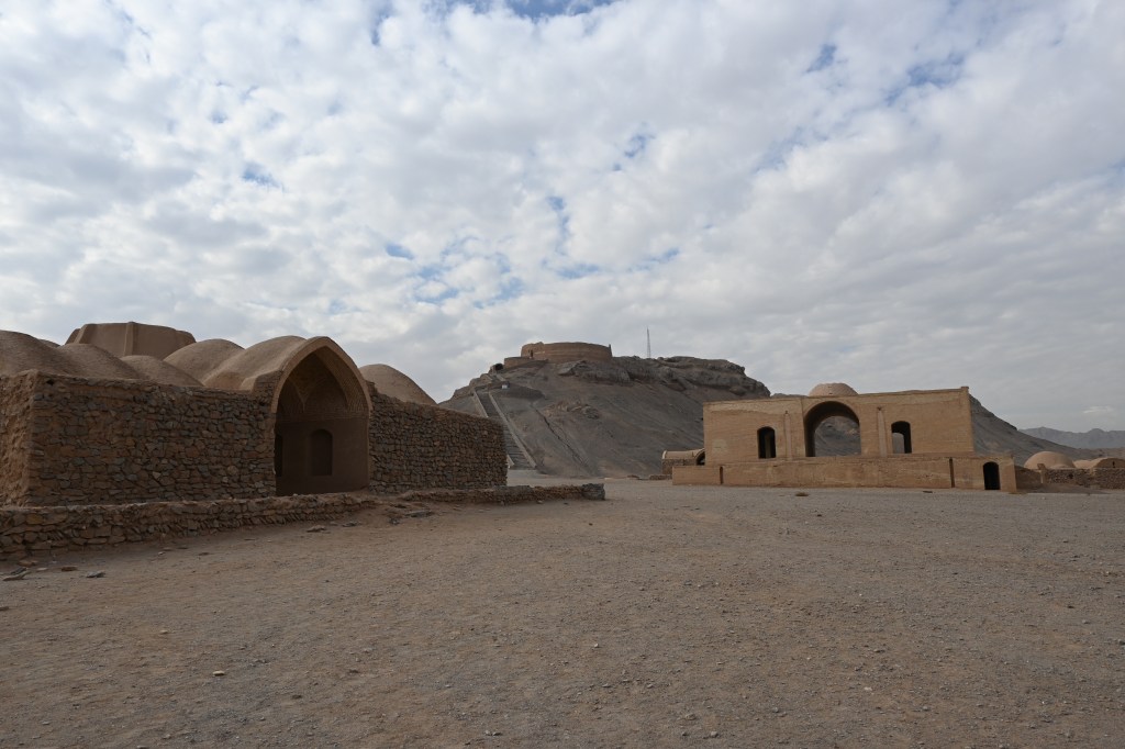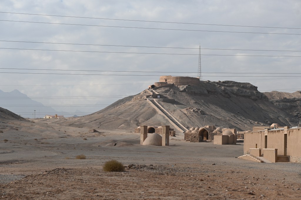 En las fotos abajo, podemos ver al fondo, sobre una colina, la Torre del Silencio de Yazd o Yazd Dakhma. Una torre de silencio zoroastriana ubicada a 15 kilómetros al sureste de la ciudad de yazd . Los zoroastrios colocan sus muertos en la torre de silencio, para que sean devorados por los buitres. En la tercera foto, se ve una especie de foso con un agujero en medio, los cadáveres se dejaban por toda la circunferencia dejando que los buitres los comieran. Después, echaban los huesos al agujero central con cal para deshacerlos entendiendo que el Alma, ya había abandonado el cuerpo. Esta práctica está prohibida en Irán desde los años 70.