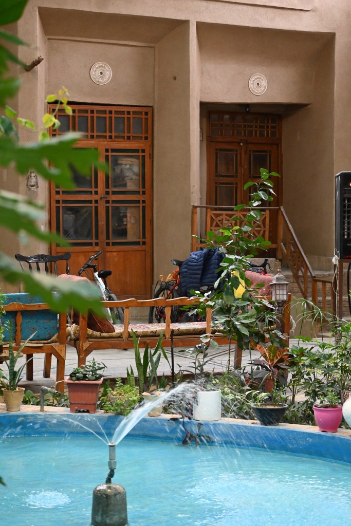 Esa noche nos aventuramos a ver si podíamos cenar en algún lugar cerca de la plaza, había un par de restaurantes en el lado Norte de la plaza, sobre el portal de acceso al bazar, pero nos quedamos en la avenida Sepah. A menos de dos minutos andando de la plaza, justo antes de llegar a la plaza, en una entrada de la avenida vemos un patio, rodeado de arboles con una fuente en medio y una super tienda de alfombras a un lado, el patio está lleno de mesas y estufas y gente. Nos sentamos en una mesa en un restaurante/ cafe de comida italiana/internacional. Y ahí nos quedamos las tres noches, en la plaza bajo la estufa (en el desierto la temperatura baja mucho. la anoche y en Yazd en cuanto se va el sol nos quedamos a unos 6-8 grados), con el brasero en las rodillas, la cerveza sin alcohol y comiendo pasta veganizada. Un lujo que sólo costó para tres personas entre 10 y 15 millones de rupias. Es decir ni diez euros por persona.