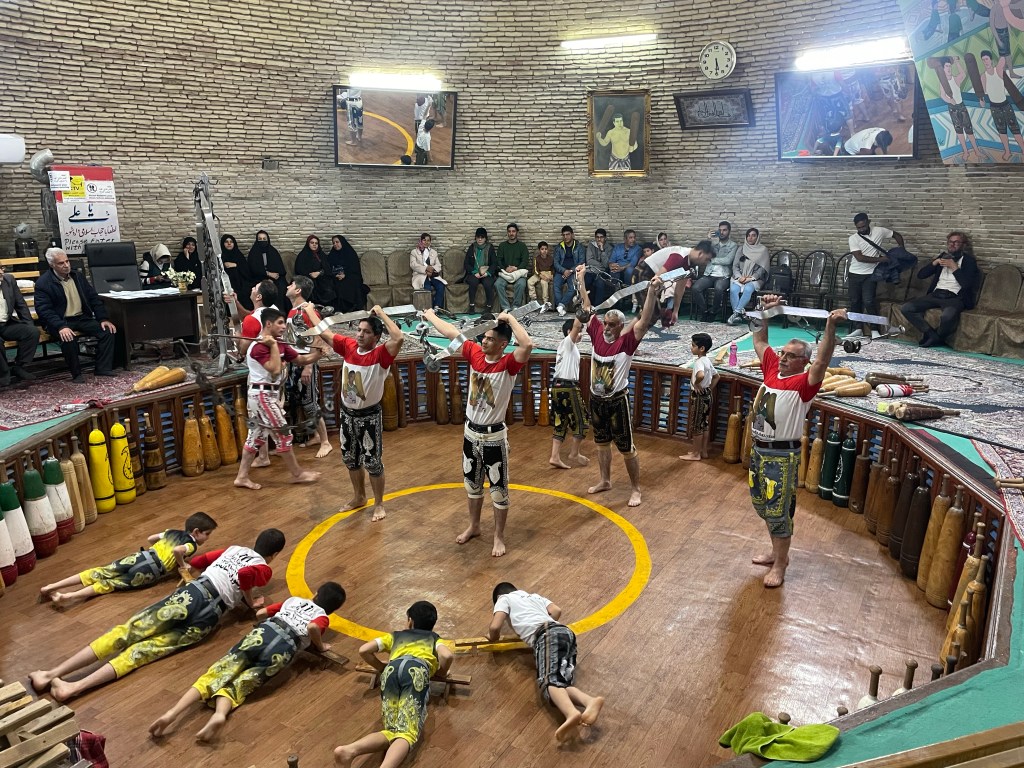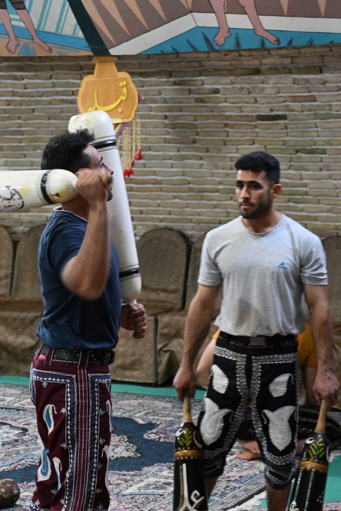 Como sorpresa el guía nos lleva a un curioso lugar. Un gimnasio local (literalmente una sala bastante pequeña en un sótano, llamada zourkhaneh) donde hay hombres y niños entrenando algo que se denomina Varzesh-e Pahlavani o Varzesh-e Bastani, traducido como «deporte antiguo» o «deporte tradicional»; una especie de arte marcial antiguo, que se cree tiene sus orígenes en la época del imperio Parto en el 250 a. C. durante el cual, el deporte se desarrolló como un campo de entrenamiento para los guerreros.