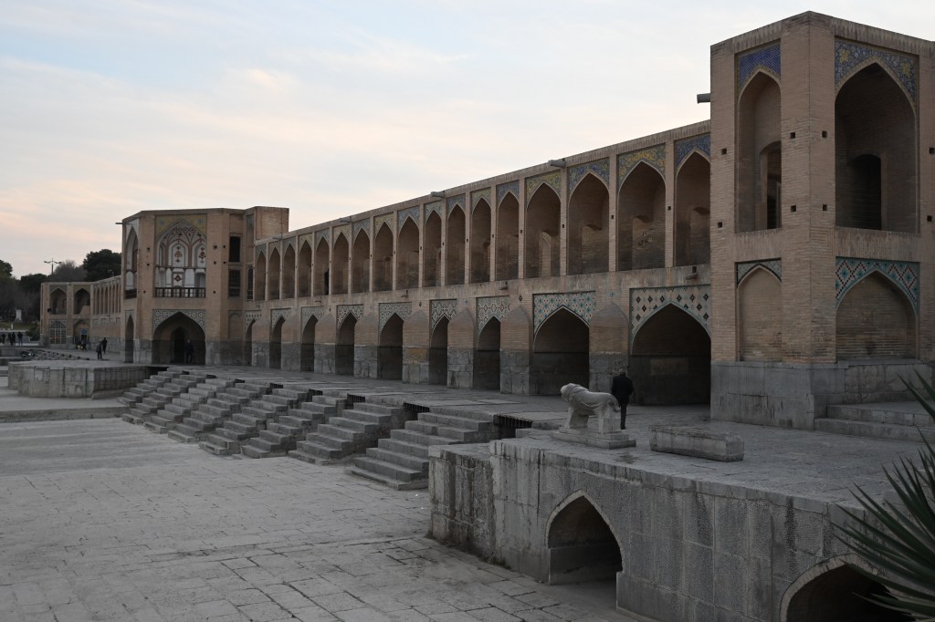 Llegamos al atardecer y nos da tiempo a ver los puentes famosos sobre el río Zayandeh. Sin agua. Así que queda un poco raro. En Isfahan hay 11 puentes. Dos de ellos son bastante famosos.
