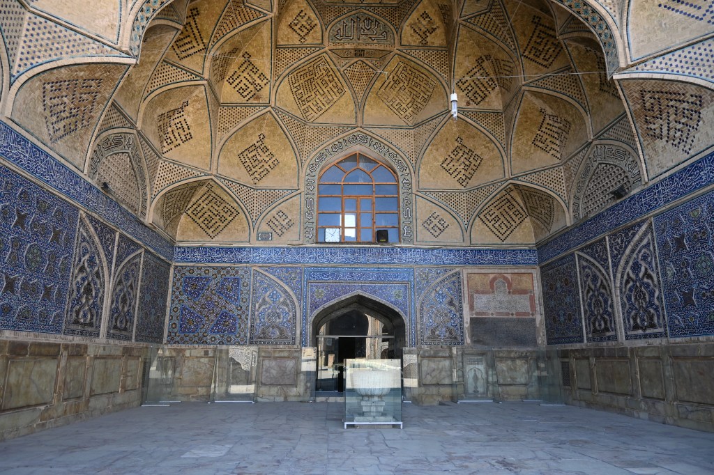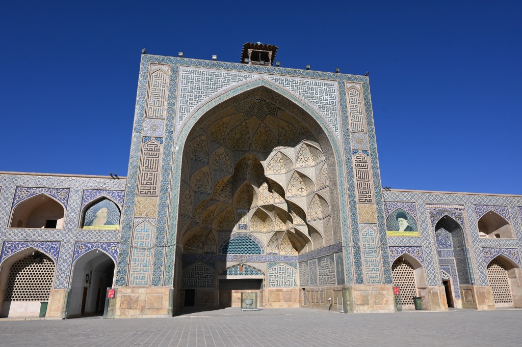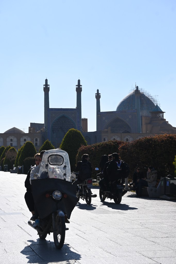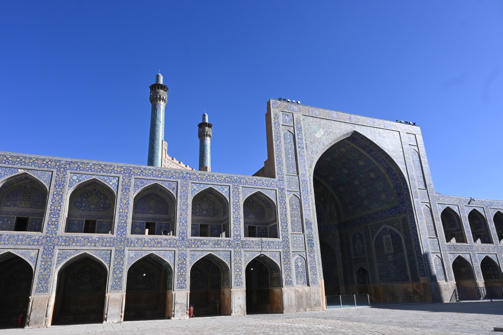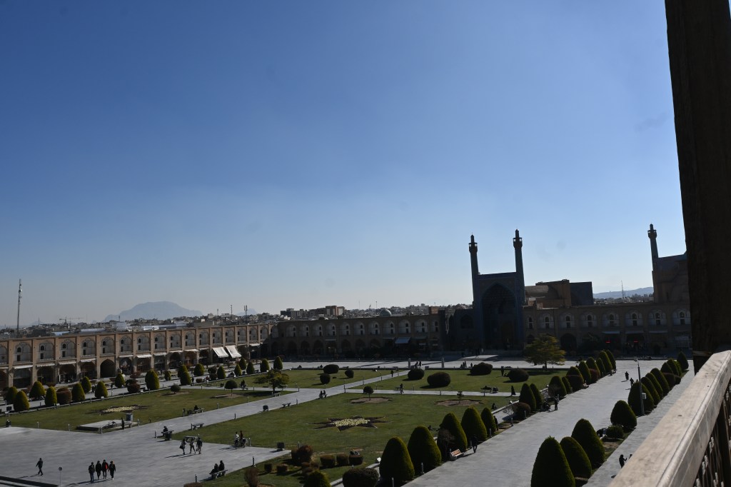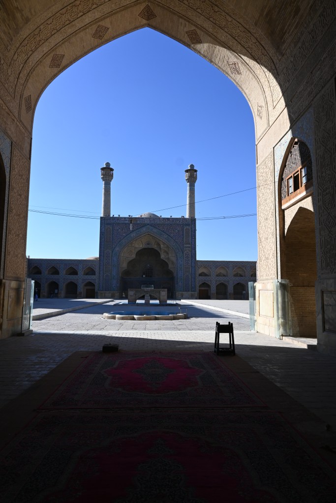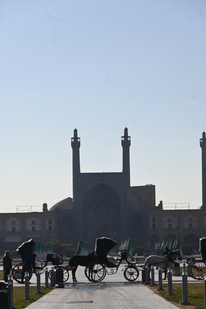 La primera visita en la plaza es la Mezquita del Shah, llamada desde la revolución de 1979 Mezquita de Imam, Masjed-e Edam. La mezquita fue también impulsada por el Sha Abbaas I y construida en 1612 (tardó 26 años en construirse) aunque se acabó una vez el Sha ya había muerto. La construcción es la típica de las mezquitas iraníes, un portal de 30m flanqueados por dos minaretes gemelos de 42m, que da acceso a un patio con 4 iwans. Sin embargo en este caso, el iwan Norte que da a la plaza no está en la misma dirección que la cúpula de la sala de oración de la mezquita sino que está colocada a 45º para poder mantener el mihrab mirando a la meca.