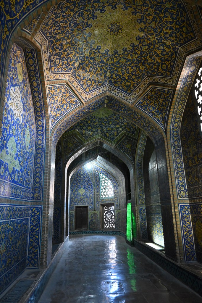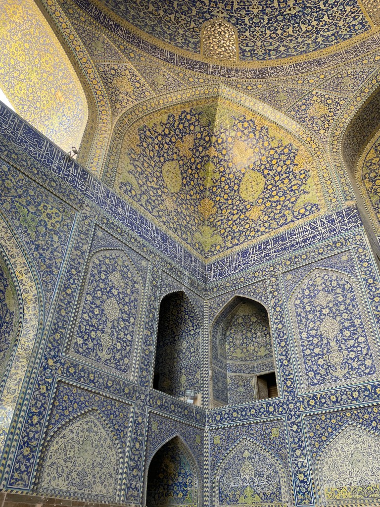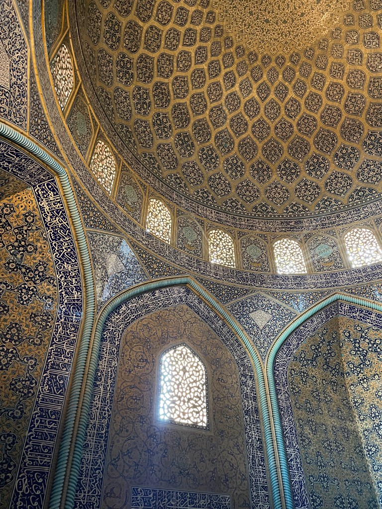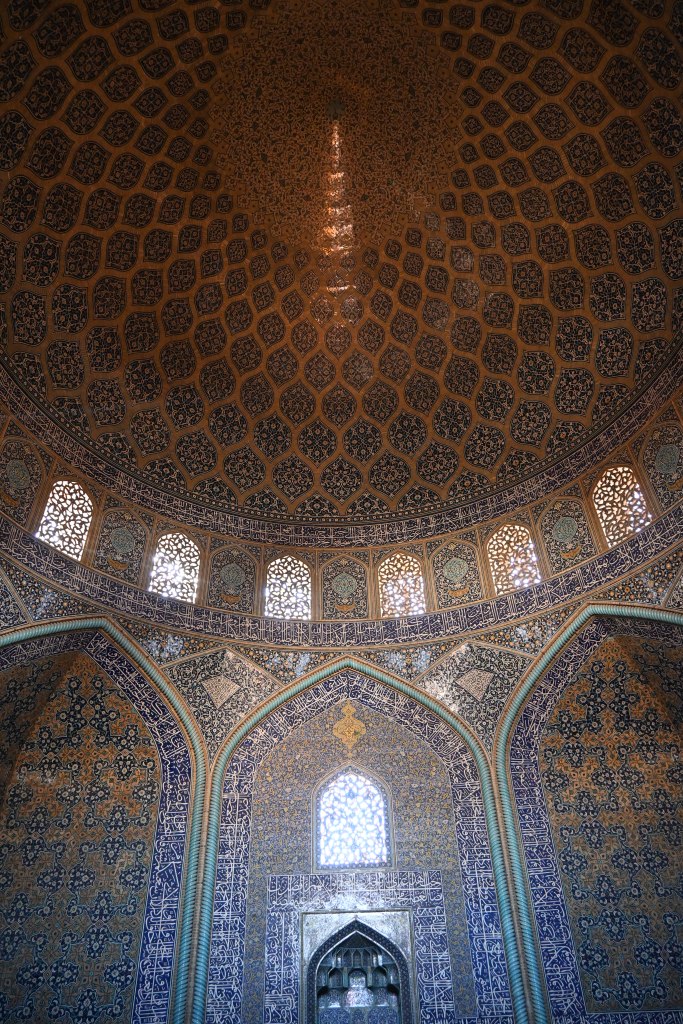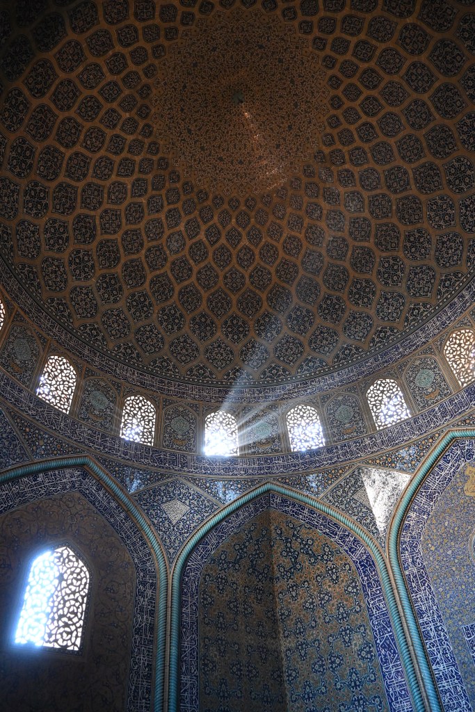 Visitamos la mezquita de Sheikh Lotfollah después de la gran mezquita del Shah. Esta es una de las antiguas mezquitas de Irán, construida por orden del Shah Abbaas I, para su uso particular en 1602, durante la época de los safávides. Tardó 16 años en construirse. La mezquita es totalmente diferente ya que no tiene minaretes ni tampoco patio, ni iwans. La entrada a través de una galería espectacular lleva directamente a la sala de oración con una cúpula con unas decoraciones increíbles. La cúpula tiene una ventanas por las que la luz, al entrar, hace que el centro parezca un pavo real (la luz la cola del pavo real) emblema de la realeza persa.