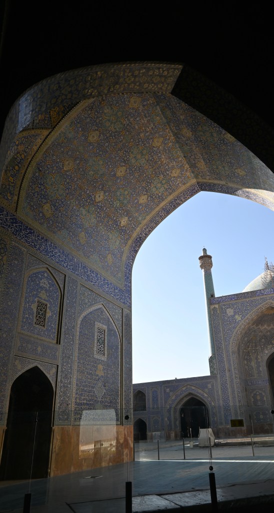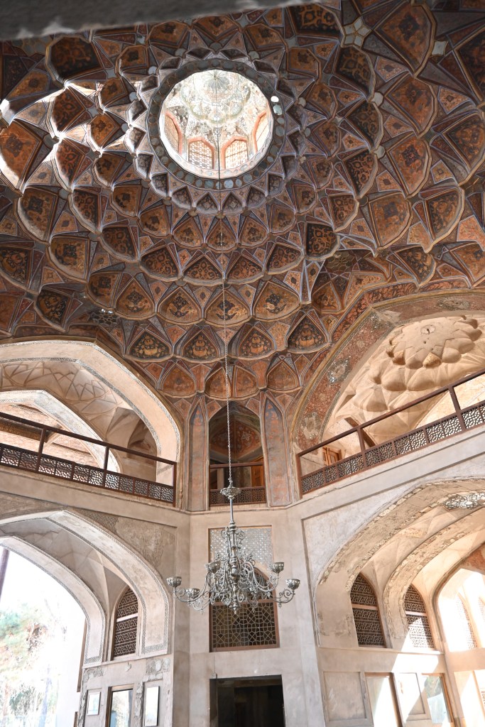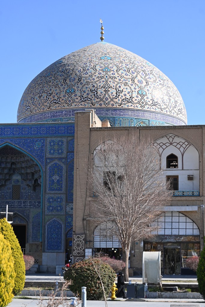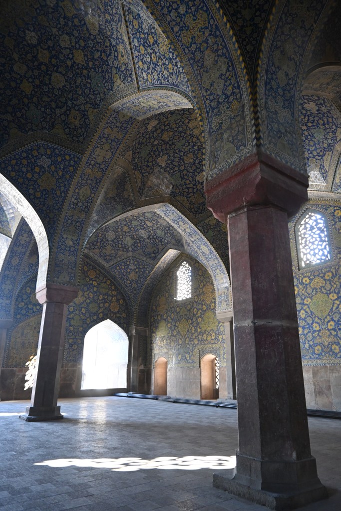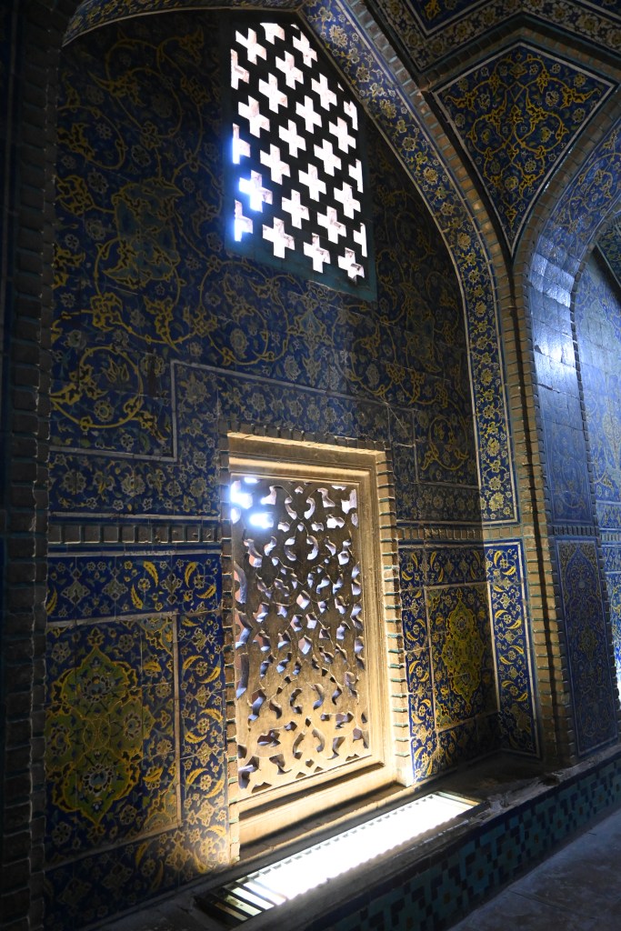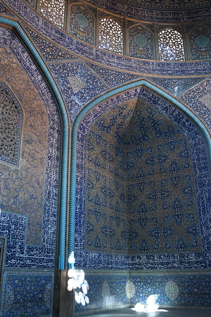 Visitamos la mezquita de Sheikh Lotfollah después de la gran mezquita del Shah. Esta es una de las antiguas mezquitas de Irán, construida por orden del Shah Abbaas I, para su uso particular en 1602, durante la época de los safávides. Tardó 16 años en construirse. La mezquita es totalmente diferente ya que no tiene minaretes ni tampoco patio, ni iwans. La entrada a través de una galería espectacular lleva directamente a la sala de oración con una cúpula con unas decoraciones increíbles. La cúpula tiene una ventanas por las que la luz, al entrar, hace que el centro parezca un pavo real (la luz la cola del pavo real) emblema de la realeza persa.