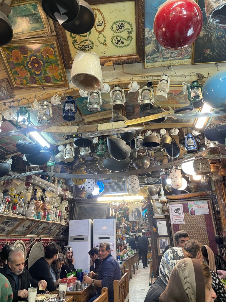 Comemos en un lugar muy peculiar. Una ferretería, bueno es una teteria. El lugar era especial, estaba lleno de locales, debe ser típico y muy frecuentado en Isfahan. El lugar se llama Azadegan Café y es el número 1 en TripAdvisor, de ahí las colas, la gente… en fin, curioso de ver, como curiosos eran los baños y ahí lo dejo. Yo, como no como animales, MAL, al resto creo que les pereció pasable. Yo iría a tomar un té, comer no, pero si eres de estómago que lo aguanta todo y te gustan las cosas estrafalarias, pues si, una visita hay que hacerle. La verdad: parecía la cueva de Ali-baba 🤣