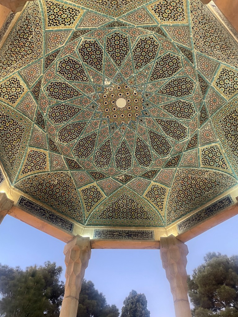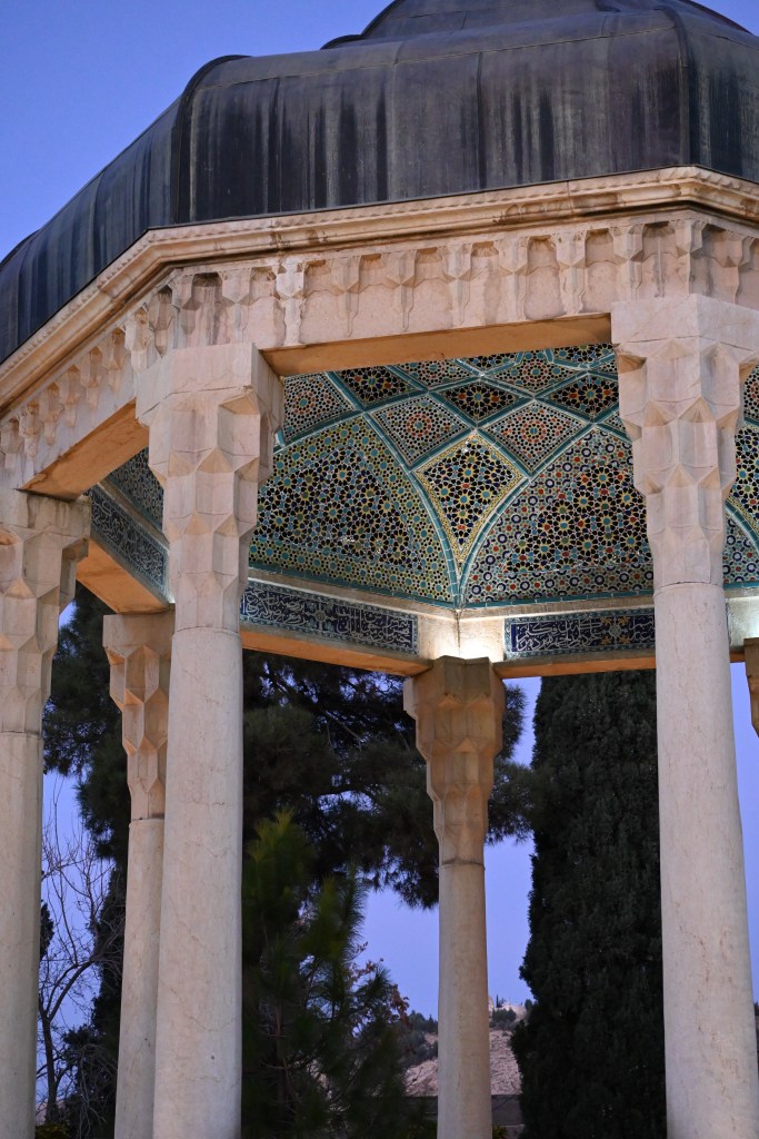 La última visita fue la Tumba de Hafez, uno de los famosos poetas del país. La piedra de mármol actual que está asentada en la tumba, fue colocada por orden de Karim Khan Zand, el rey más poderoso de la dinastía Zand. El sepulcro está rodeado por cinco filas de escalones circulares, de donde salen ocho columnas de 10m de alto que soportan una cúpula de cobre en forma de sombrero derviche decorada por un mosaico de azulejos vidriados.