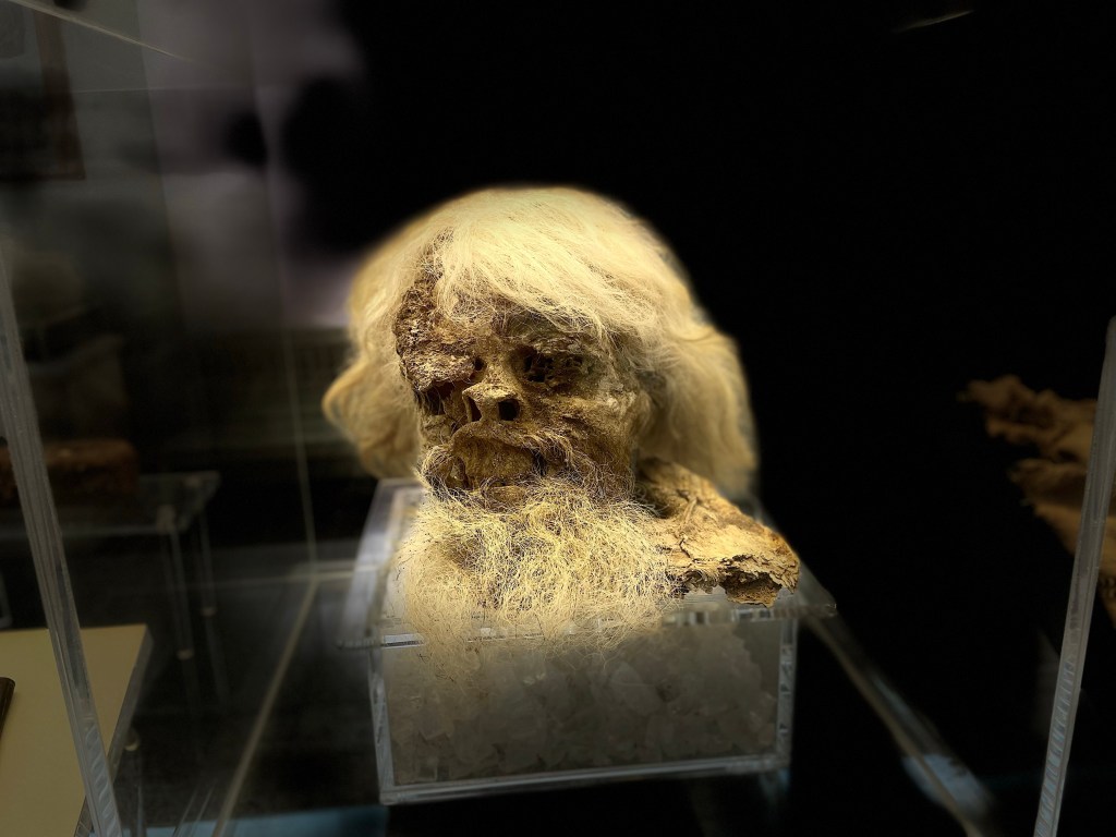 Momia natural de un hombre que incluye la cabeza y partes del tronco. Zanjan