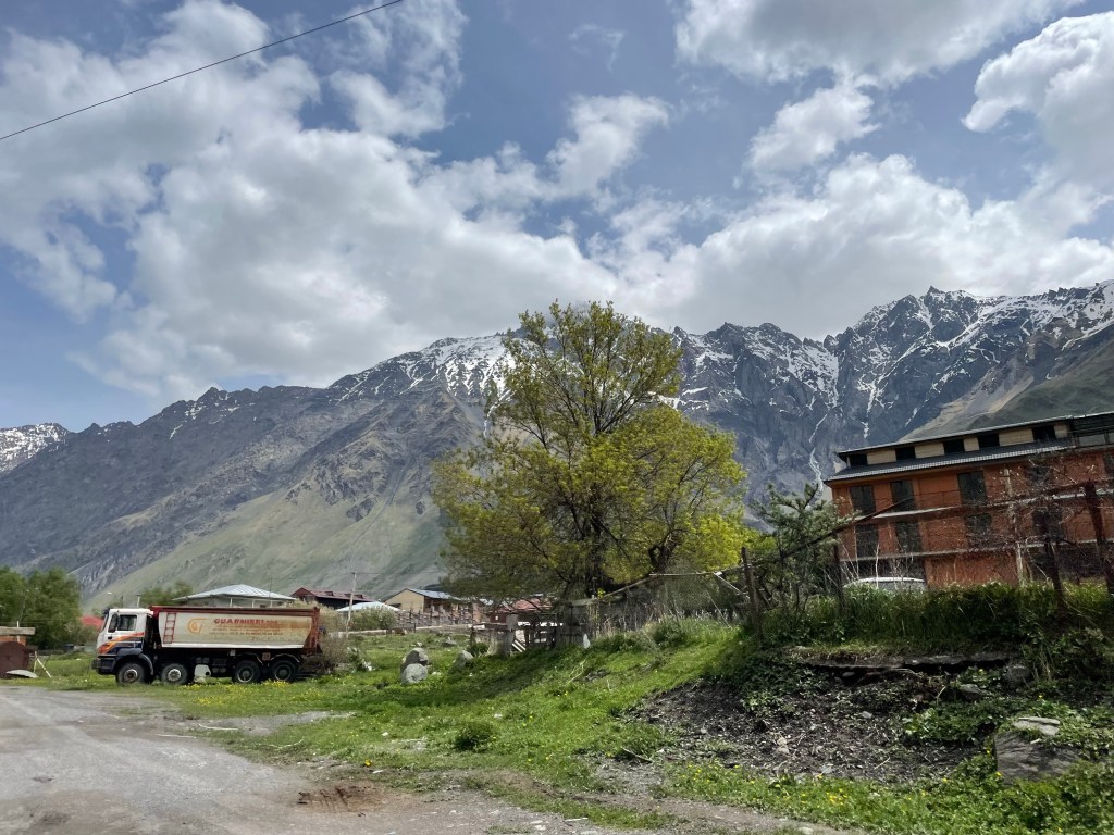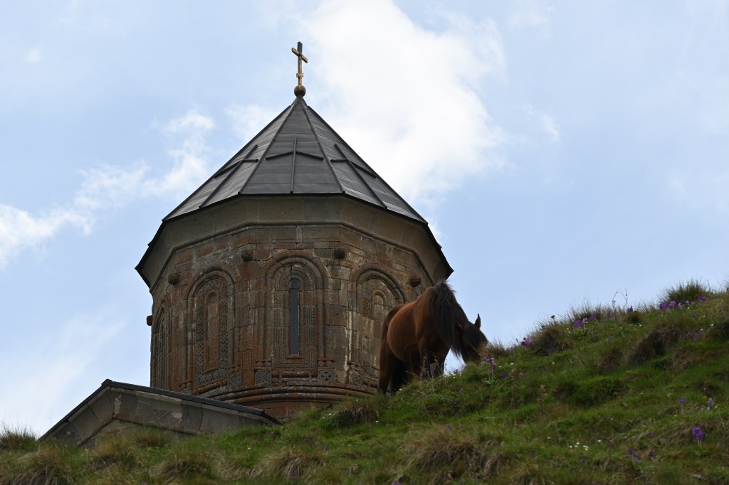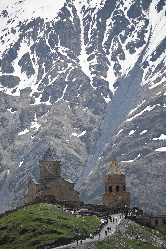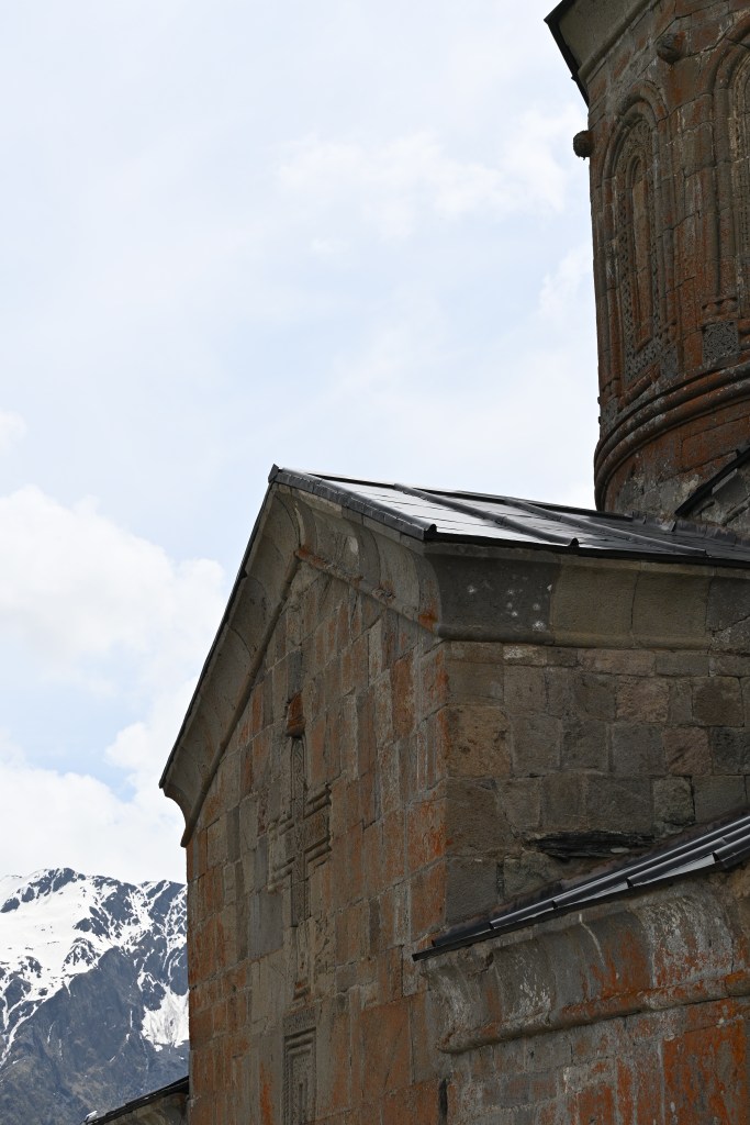 Y allí me subí en un 4×4 ruso de la época del soviet de copiloto con un señor de esos de las películas de espías, con gorro, sin dientes, el cigarro….me llevó por una carretera de montaña hasta los pies de la Iglesia de la Trinidad Gergeti. Me dio media hora para visitarla. Le hice foto a la matrícula del coche para encontrarlo después. Porque claro, igual era la única del sur de Europa pero rusos había docenas…y conductores rusos sin dientes con cigarro todos 😂