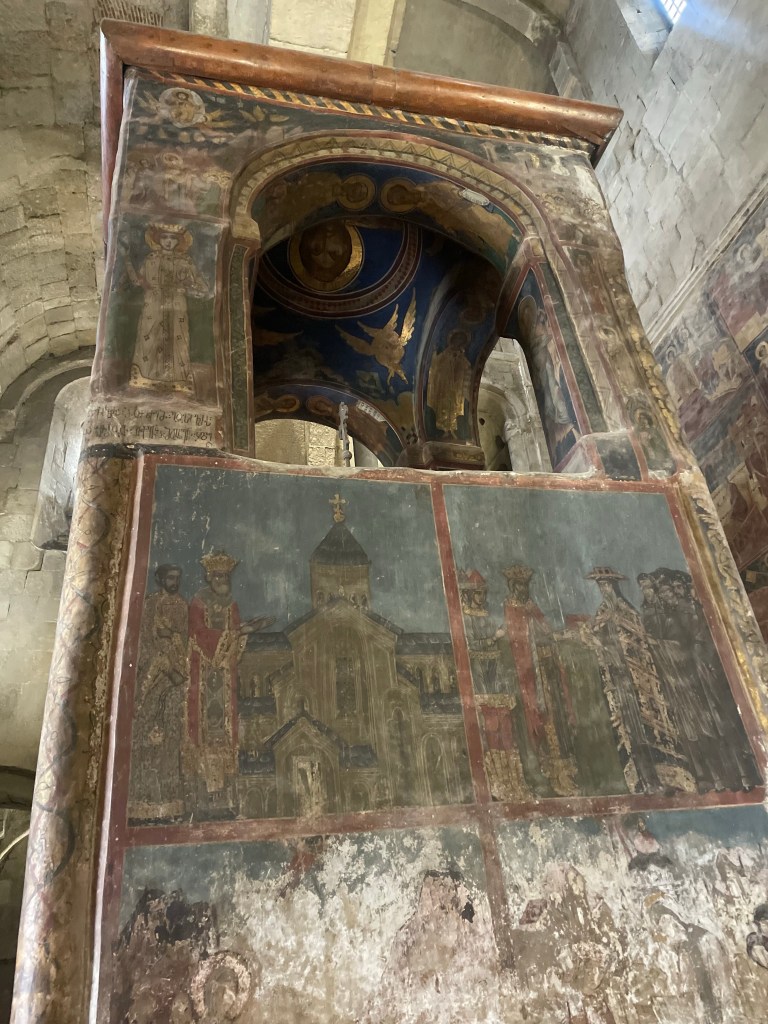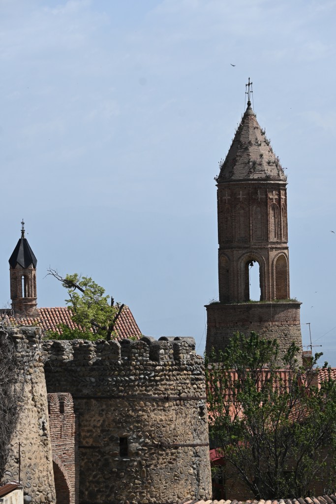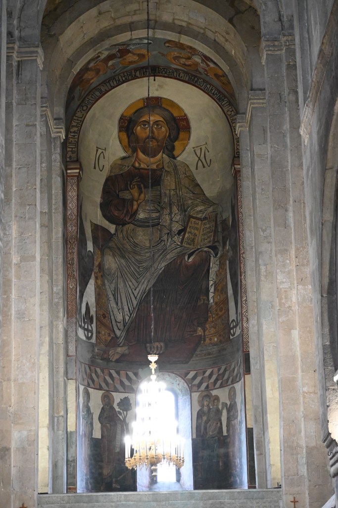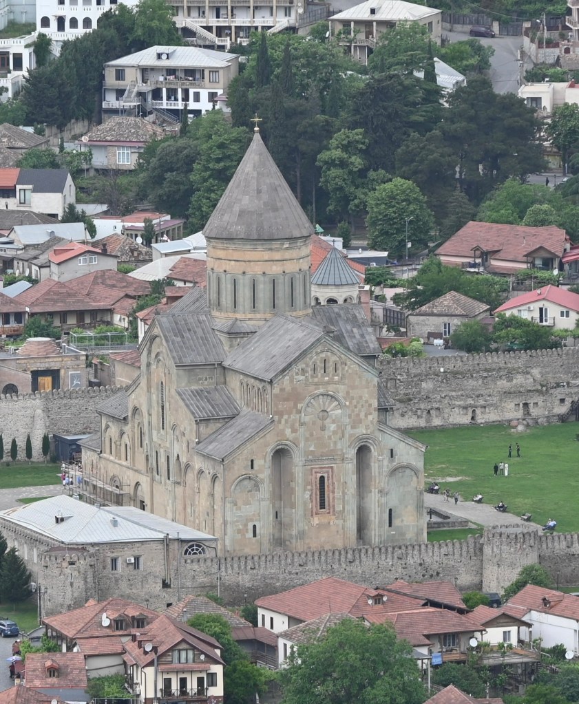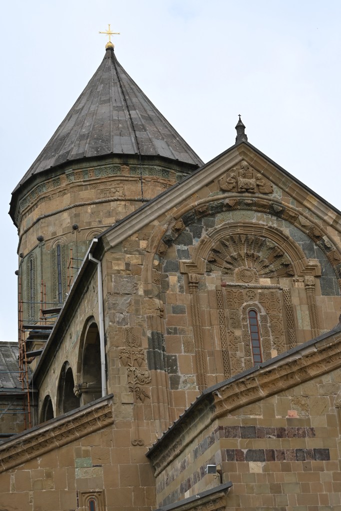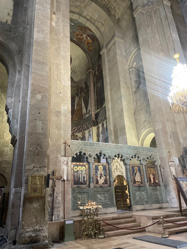 Visitamos Svetitskhoveli, una catedral que data del siglo XI. Hoy es uno de las más imponentes y extraordinarias de Georgia, con unos frescos maravillosos en sus muros. Es el segundo edificio de iglesia más grande de Georgia, después de la Catedral de la Santísima Trinidad de Tbilisi (la moderna) La catedral está en el interior de unas murallas. Fuera tienditas de recuerdos, cafeterías, tiendas de artesanía típica, heladerías…