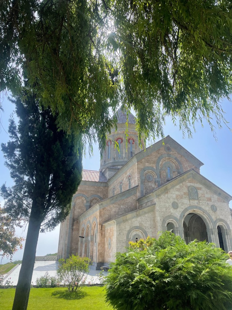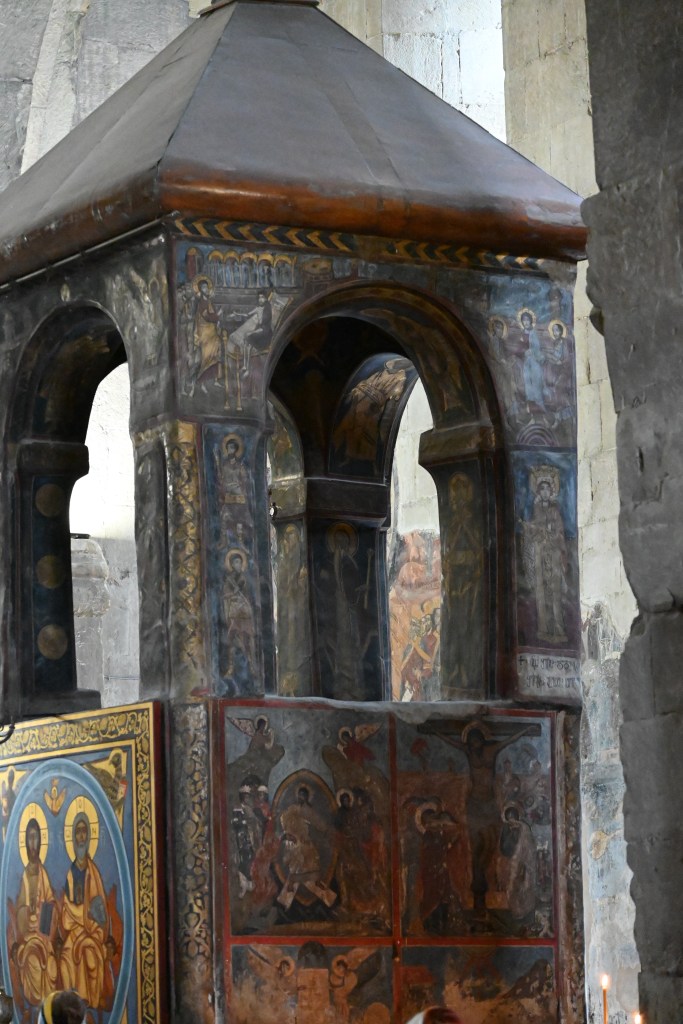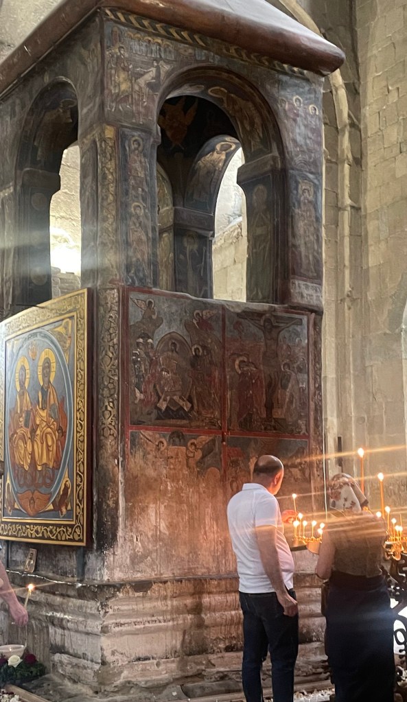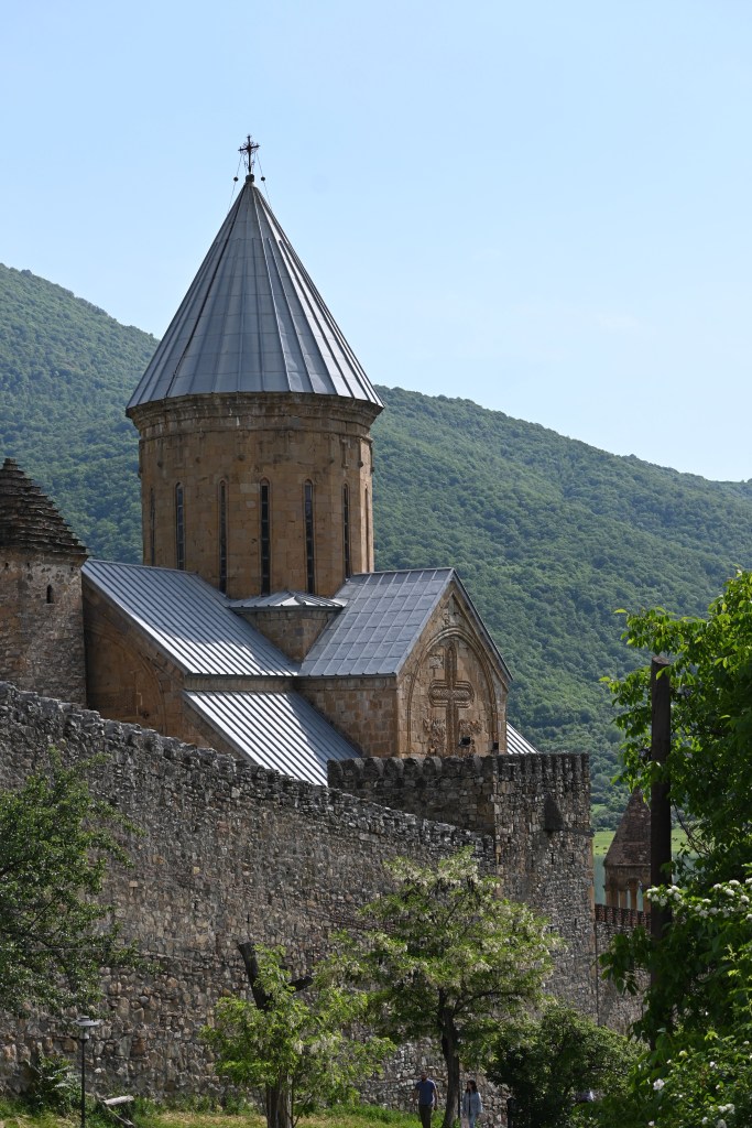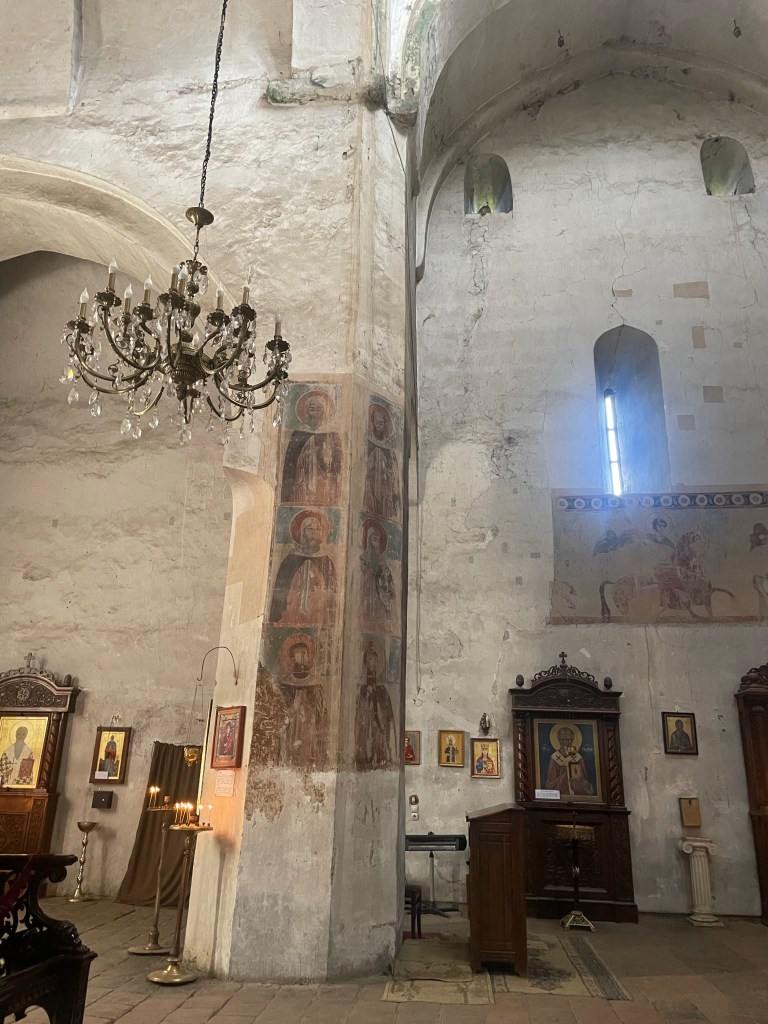 Visitamos Svetitskhoveli, una catedral que data del siglo XI. Hoy es uno de las más imponentes y extraordinarias de Georgia, con unos frescos maravillosos en sus muros. Es el segundo edificio de iglesia más grande de Georgia, después de la Catedral de la Santísima Trinidad de Tbilisi (la moderna) La catedral está en el interior de unas murallas. Fuera tienditas de recuerdos, cafeterías, tiendas de artesanía típica, heladerías…