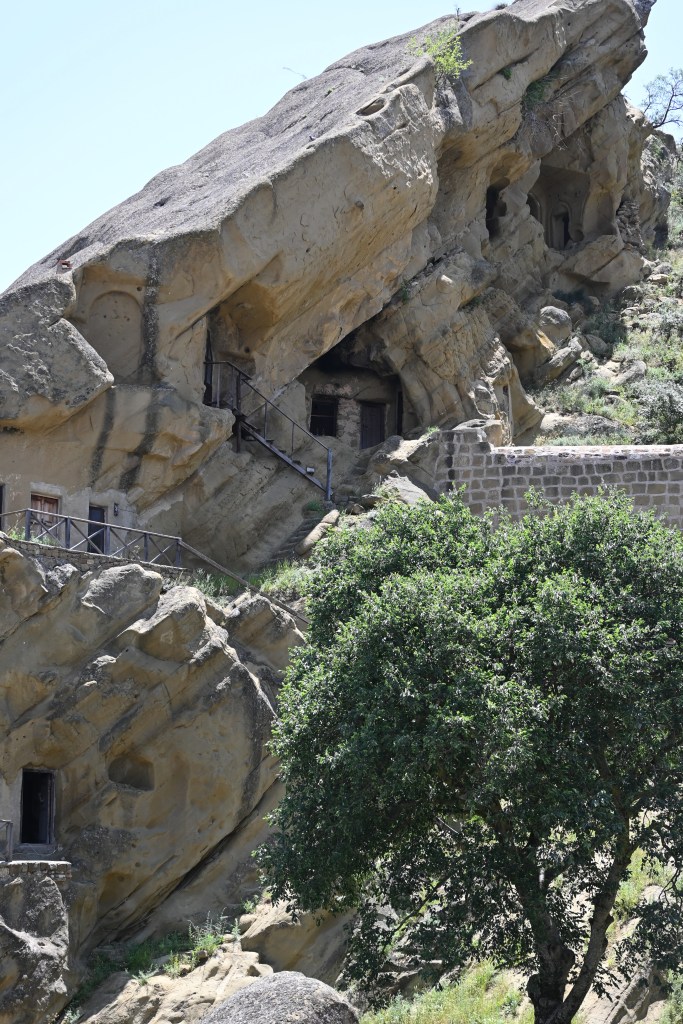 Al otro lado del parking, se encuentra el monasterio de David Gareja, uno de los lugares más místicos del país. Sin embargo, debido a las tensiones entre Georgia y Azerbaiyán, parte de las celdas, iglesias y capillas construidas en la roca, o al menos, las más bonitas (con frescos tipo las iglesias de göreme en Turquía) se encuentran del otro lado de la frontera y NO SE PUEDEN VISITAR .