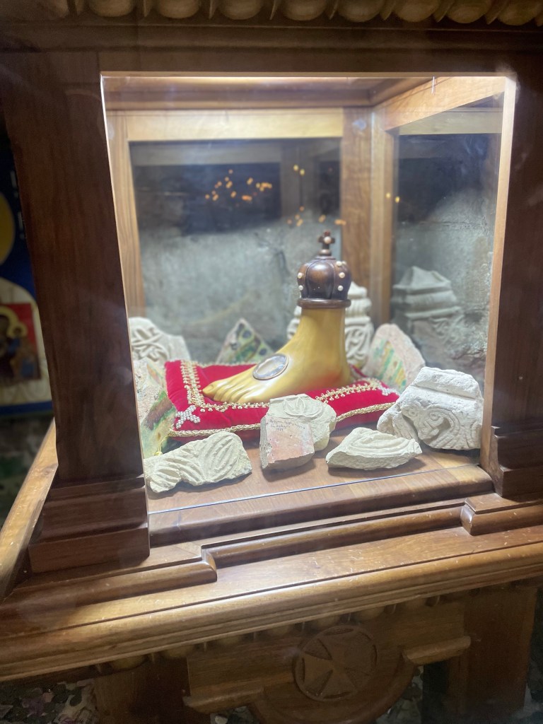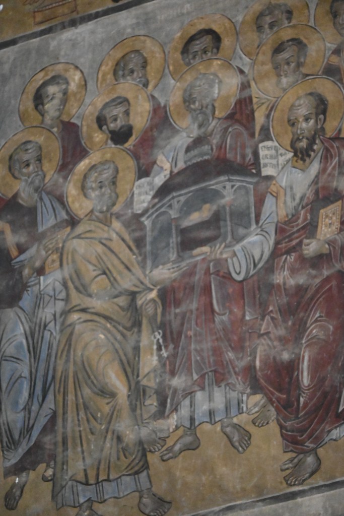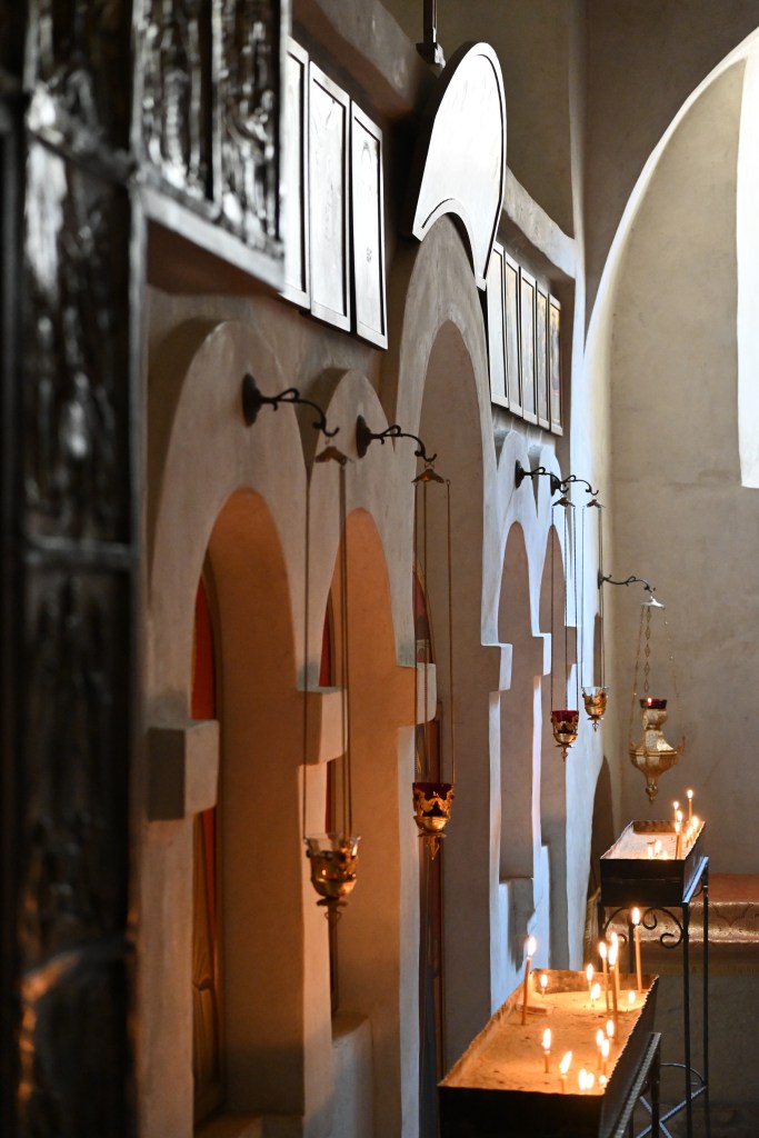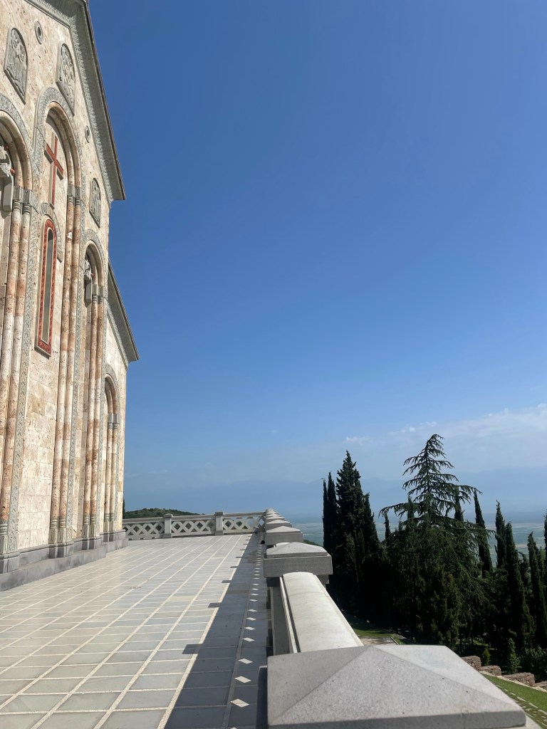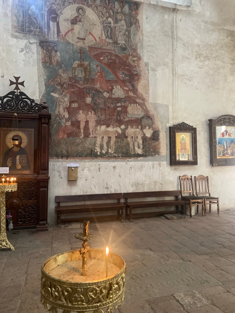 Día 2. Salimos hacia Signaghi, de camino, después de casi 2h de trayecto, (antes de Signaghi, a unos 2km) visitamos el Monasterio Bodbe (Monasterio de Santa Nino), fundado en el siglo IX, completado en XVII. Uno de los lugares más sagrados de Georgia que ahora funciona como convento. La iglesia principal estaba cerrada. Entre 1862 y 1885 se erigió un campanario independiente de tres pisos. La capilla alberga las reliquias de Santa Ninó está lleno de frescos, sólo pude hacer una foto hasta que apareció una monja y me dijo que fotos no y no pude hacer más 😨.